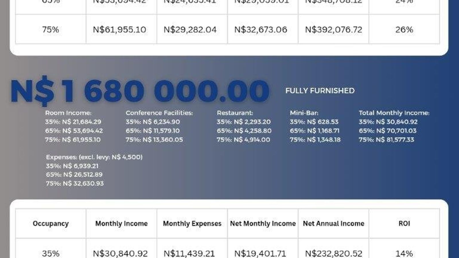 Full Investment (N$1,680,000 - Fully Furnished): Gain access to broader revenue streams, including profits from on-site amenities! Experience even higher potential ROIs, from 14% (at 35% occupancy) to 32% (at 75% occupancy)
