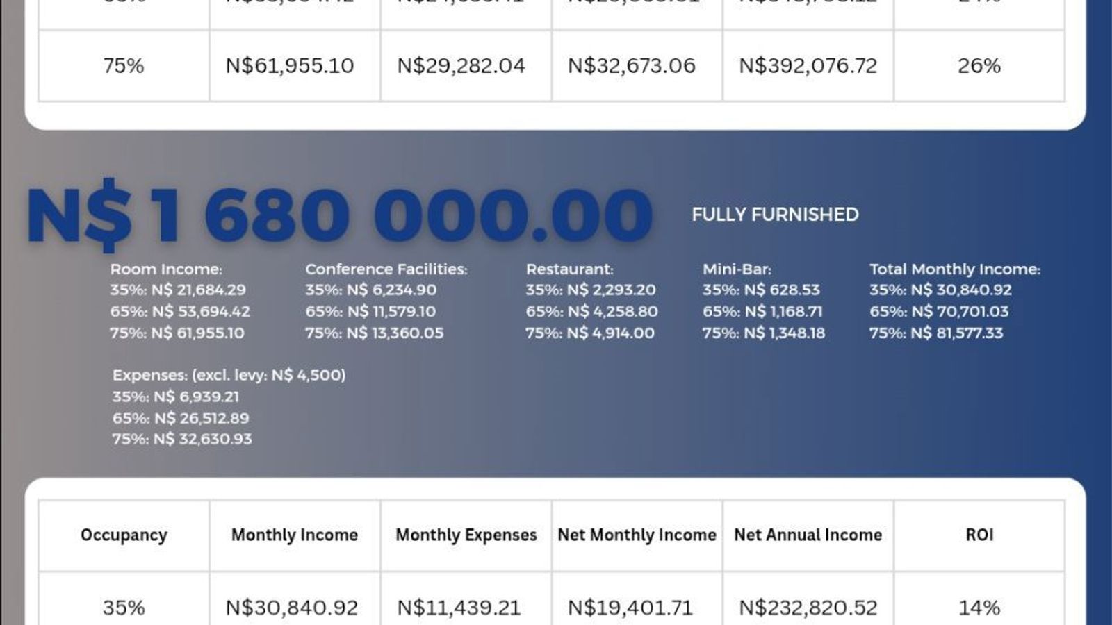 Full Investment (N$1,680,000): Income from accommodation and amenities, with ROI of 13.86%–31.75%.