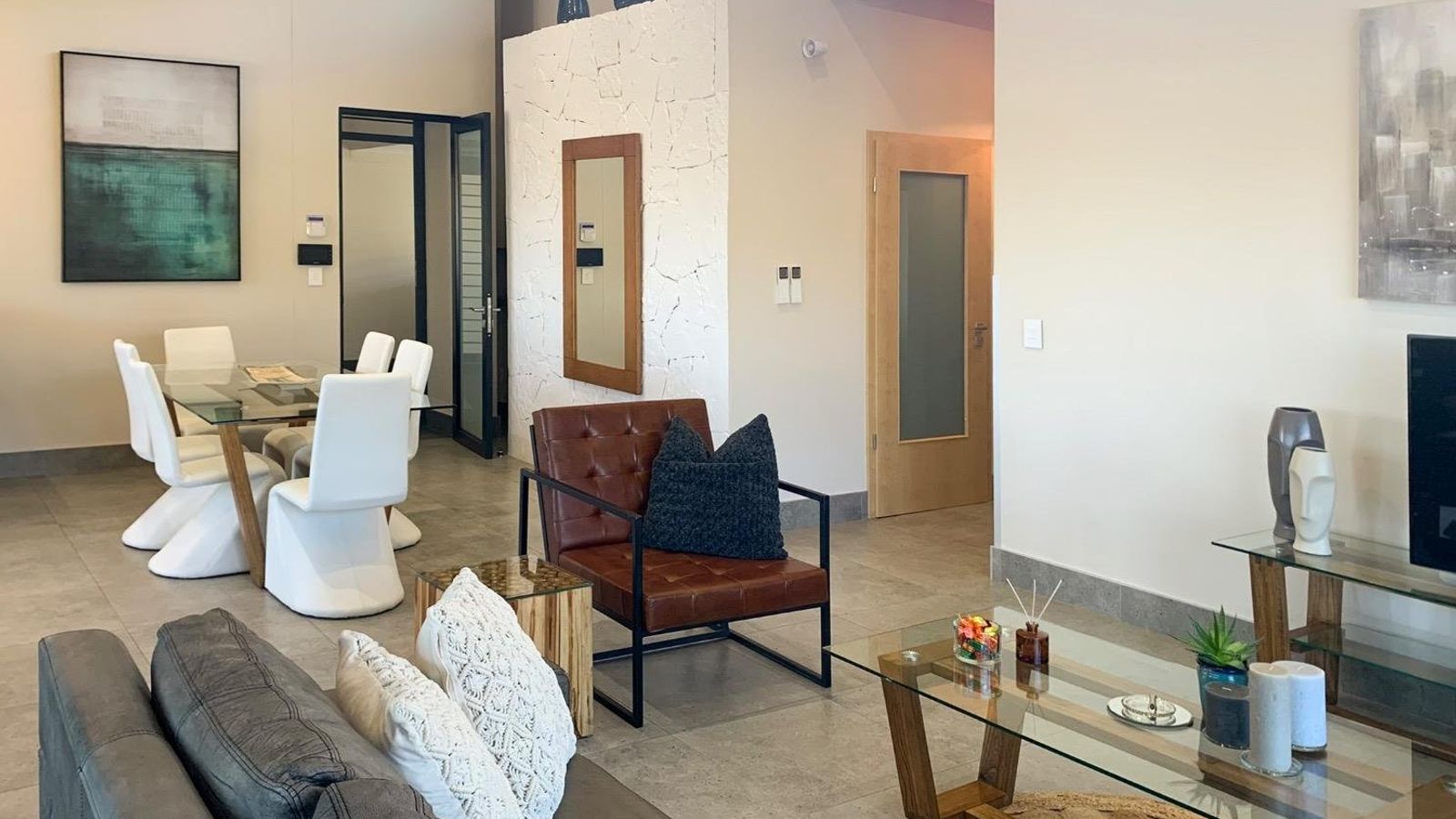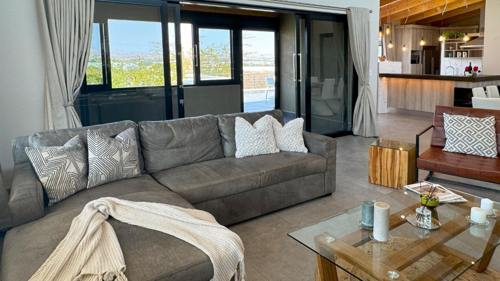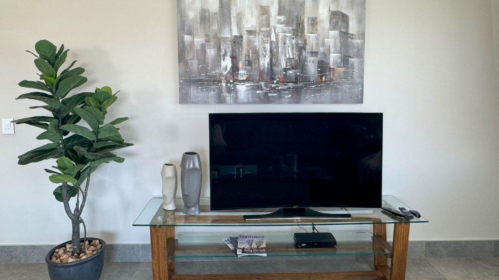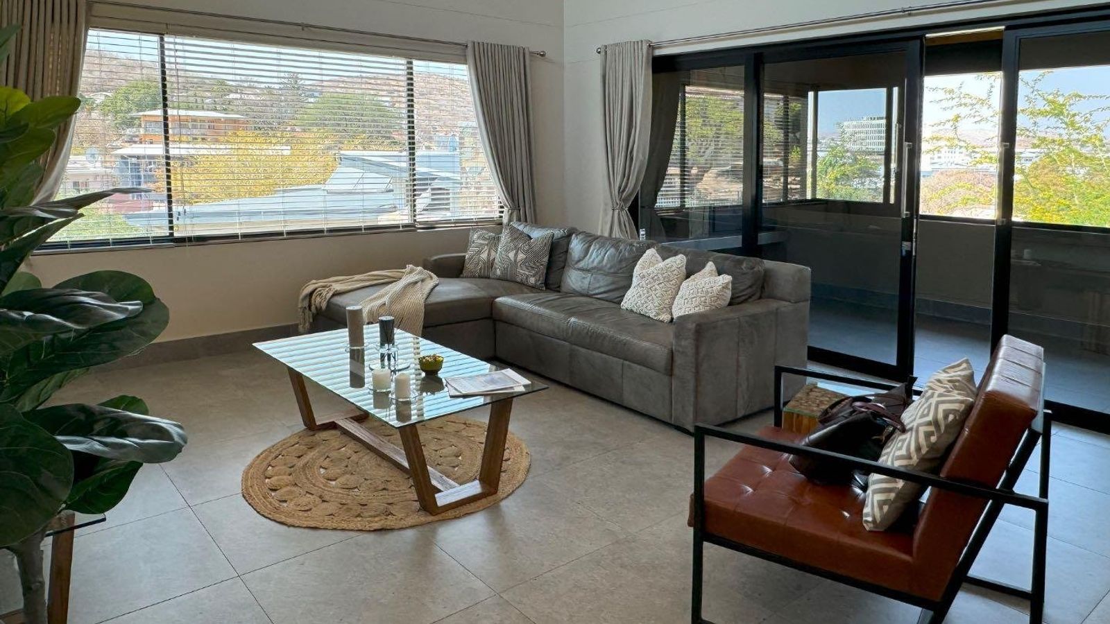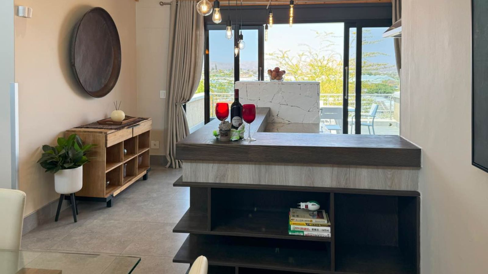 Step into a bright and airy open-plan living space, beautifully finished with tiled floors and accented by modern rugs. Enjoy breathtaking views and stunning sunsets from the balconies and most windows. The living room features two air conditioners, with an additional unit in the main bedroom, creating a comfortable environment year-round. Positioned high above the ground, you can open doors and windows to invite the refreshing Windhoek breeze.