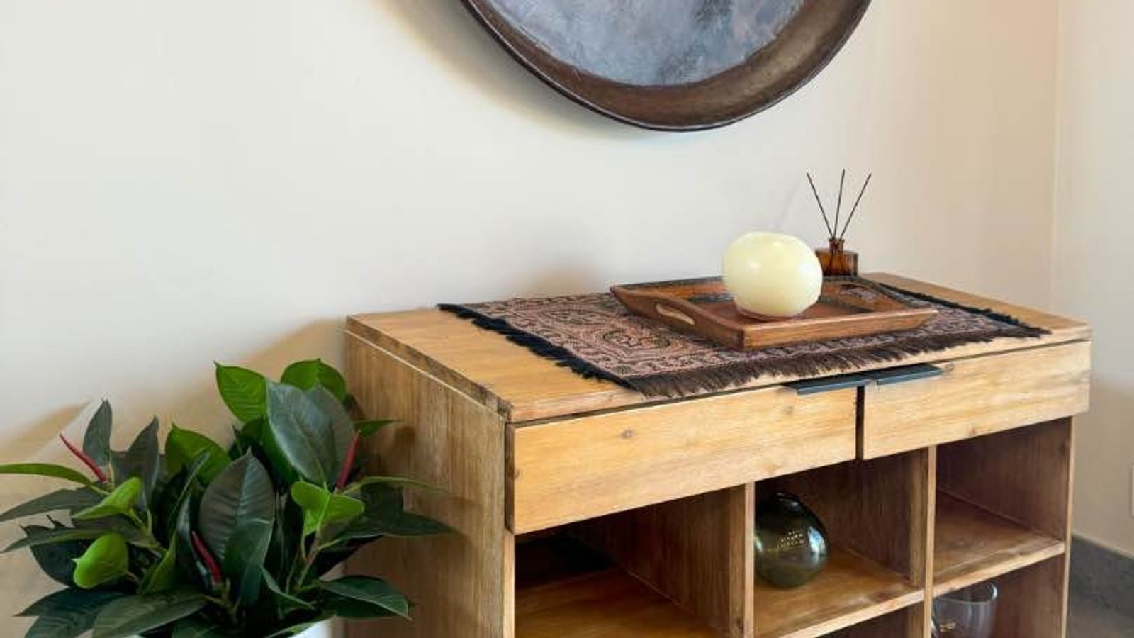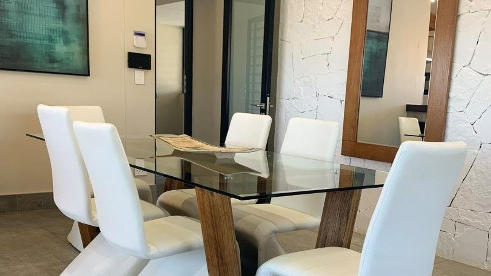 Relax in the comfortable sitting room with an L-shaped sofa and separate occasional chair. Enjoy entertainment on the large curved TV with Netflix access. The elegant dining room features a glass-top table that seats six, perfect for hosting dinner parties.