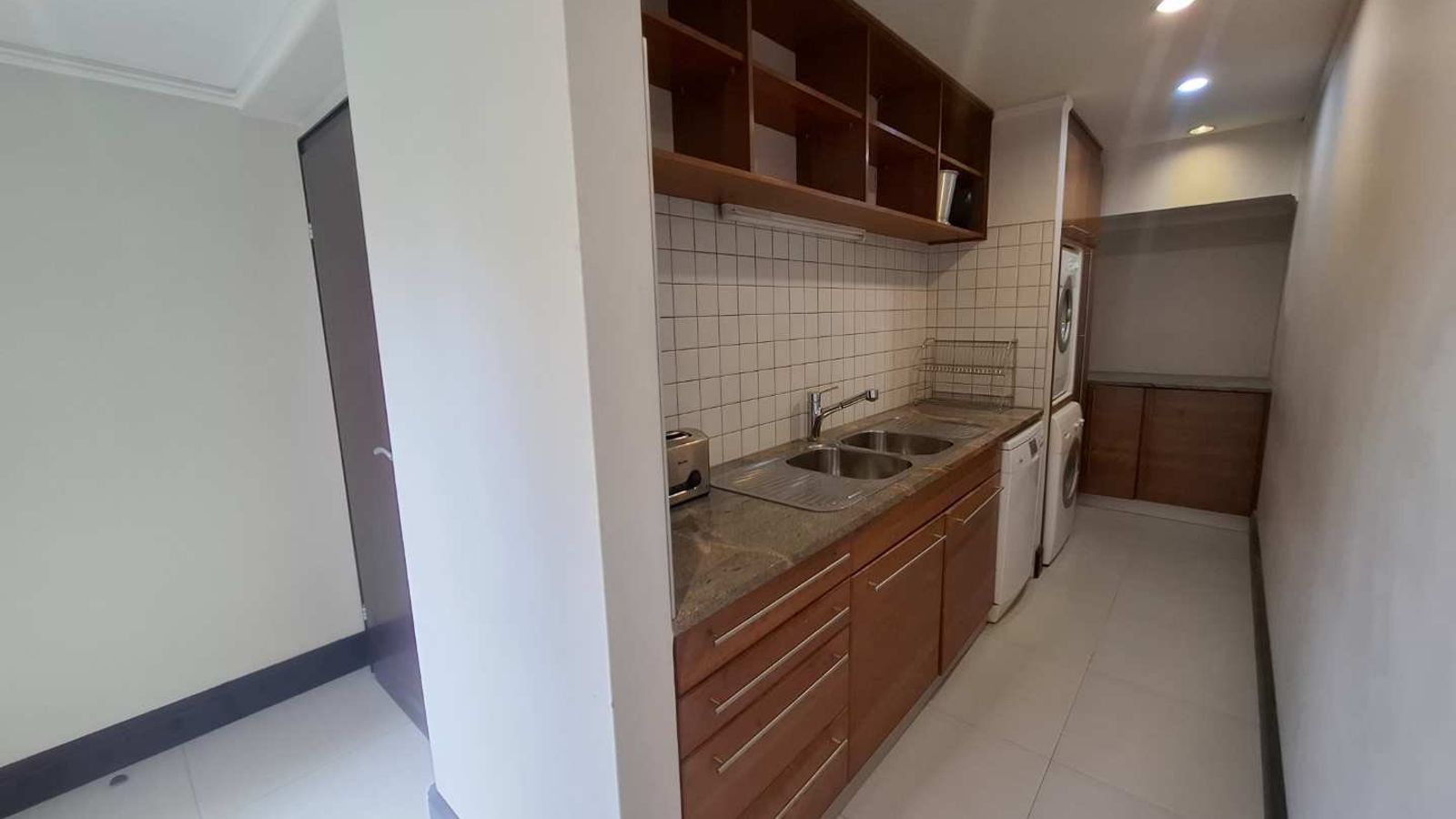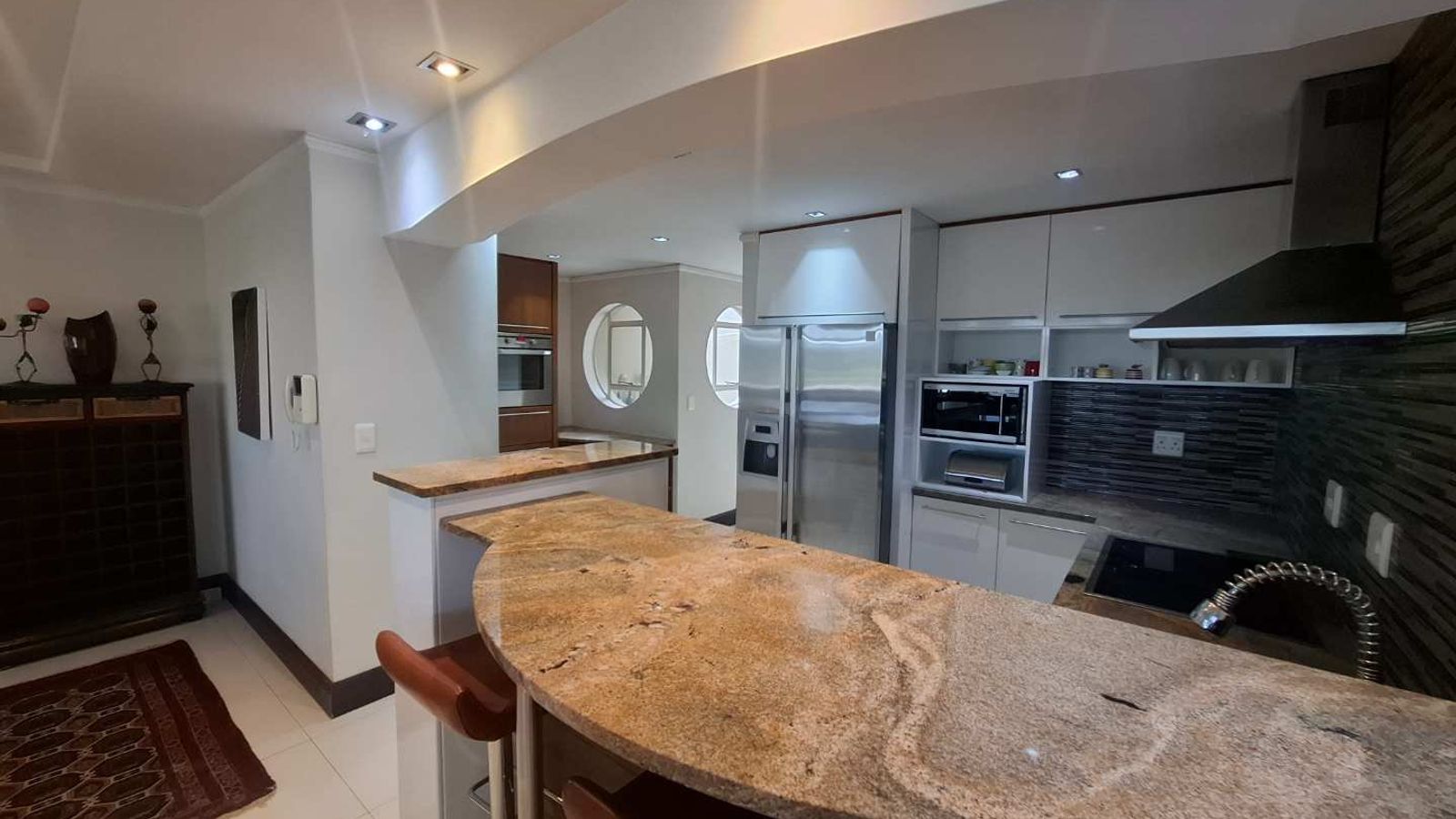 The well-designed kitchen offers granite countertops and a separate scullery, combining style with functionality. Sliding doors open onto a large balcony with a built-in BBQ, creating the perfect space for relaxed outdoor entertaining.