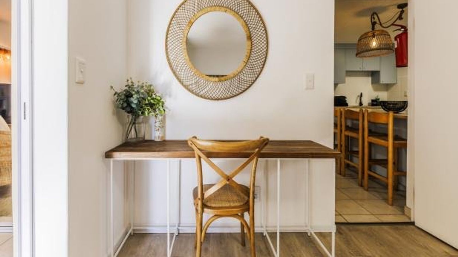 The open-plan lounge flows into a well-equipped kitchen with a breakfast counter, ideal for casual meals or entertaining guests. The enclosed balcony, currently used as a dining room, adds a bright and versatile space to enjoy year-round.