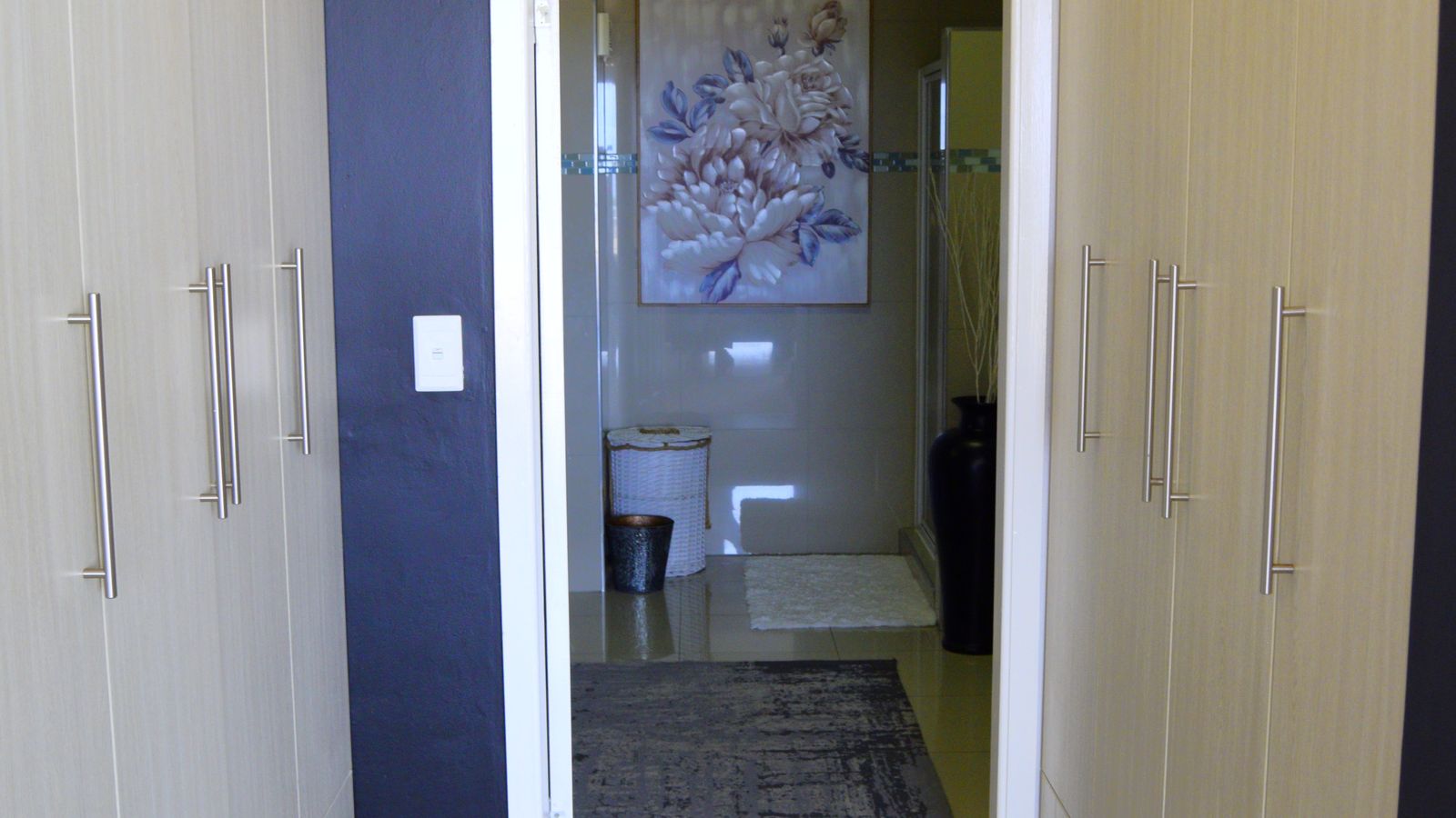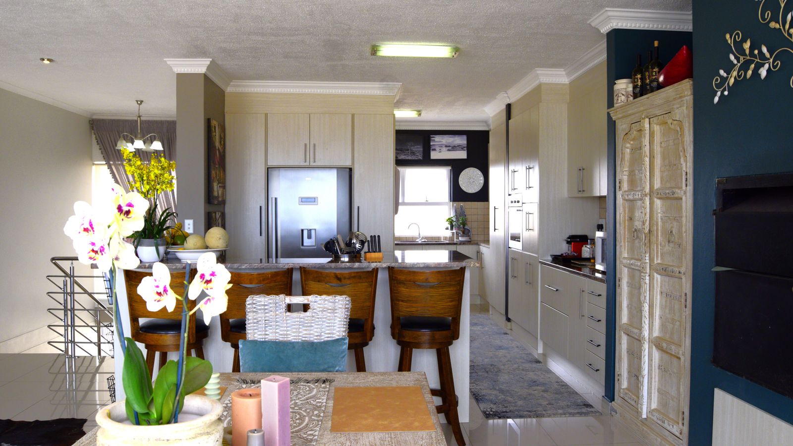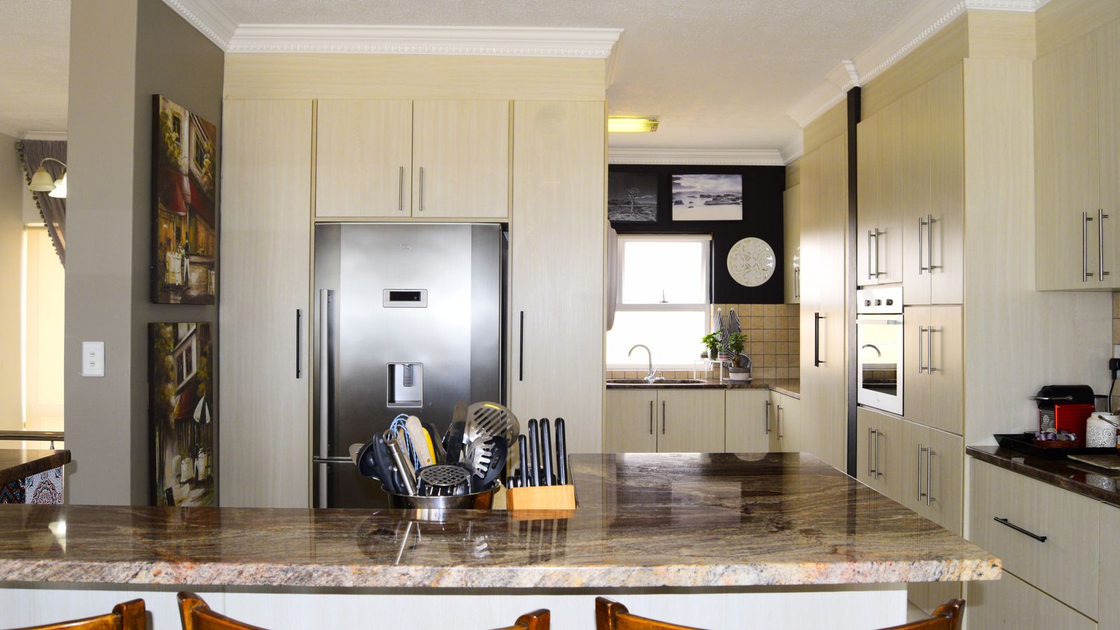 A separate scullery, also finished with granite tops accommodates a washing machine and dishwasher, maintaining a seamless and clutter-free aesthetic.