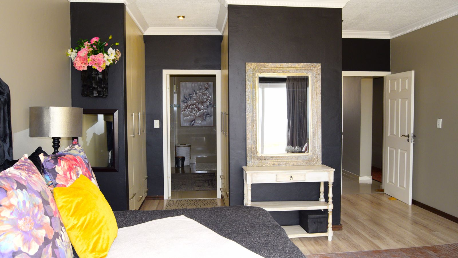 The master suite offers a luxurious retreat, complete with a full en-suite bathroom, granite tops with double vanity, and a heated towel rail.