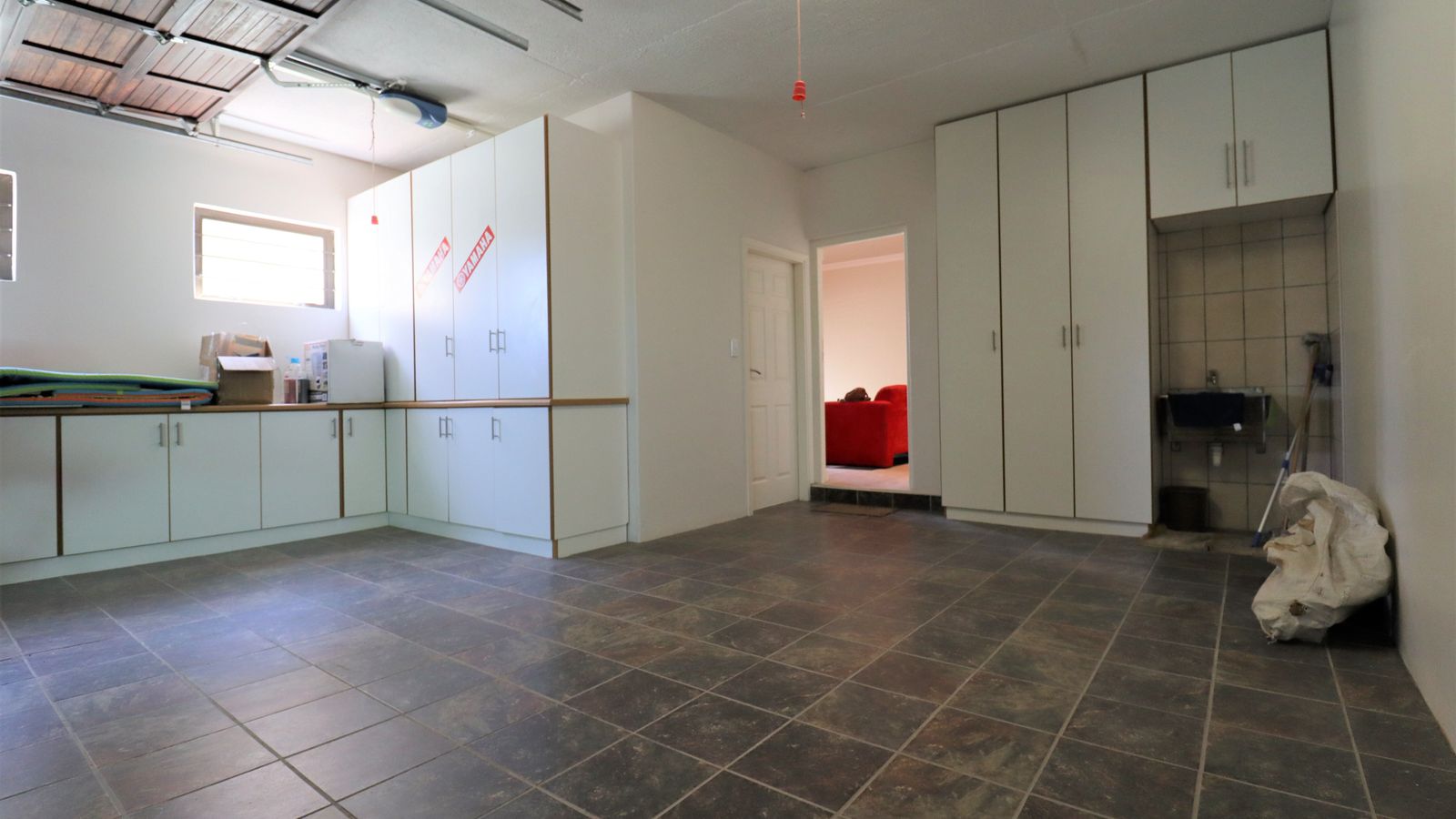 As you arrive, you're greeted by a spacious 3-car garage, with an additional tiled area with cabinets and a convenient space for your laundry needs.