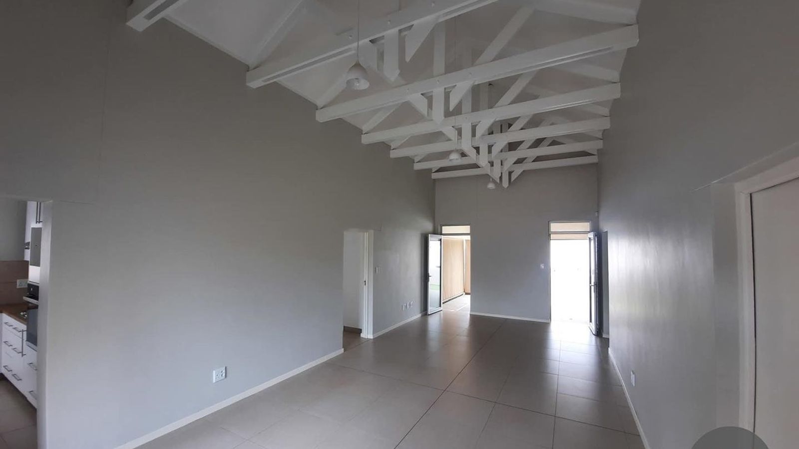 Living / Dining area with exposed trusses