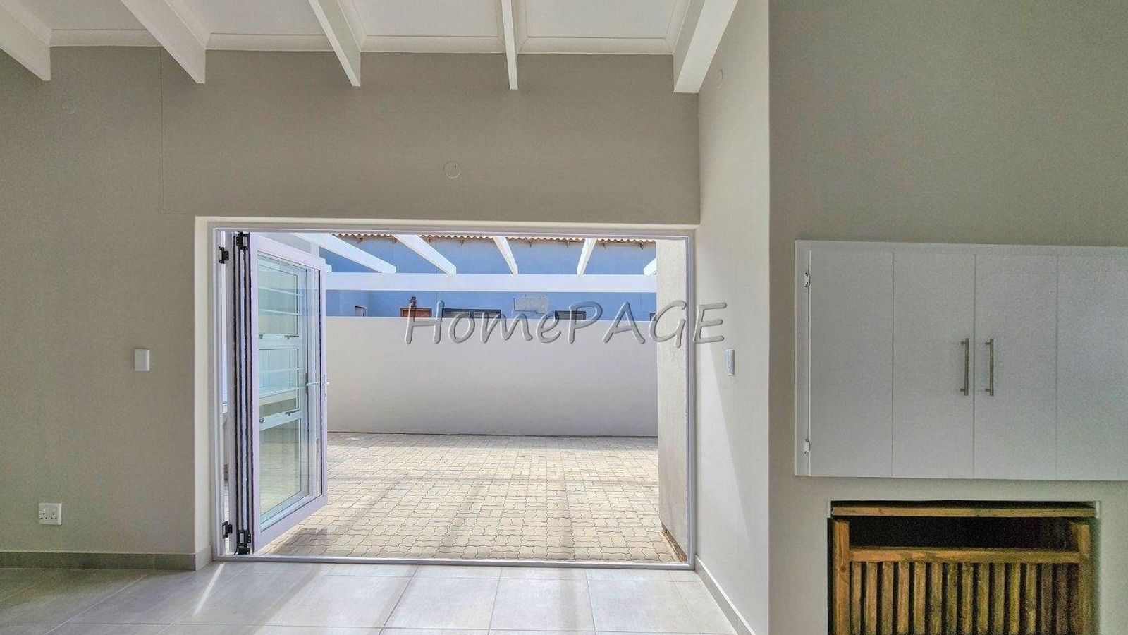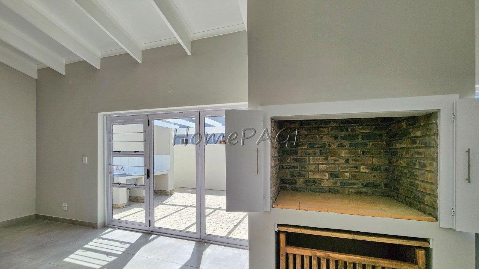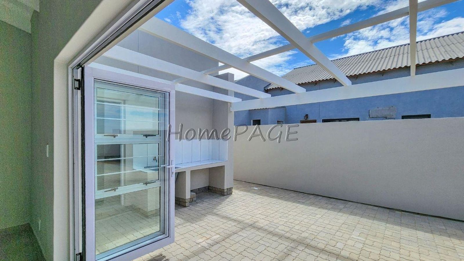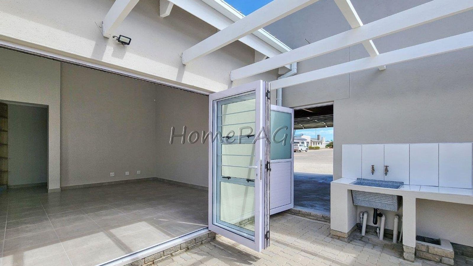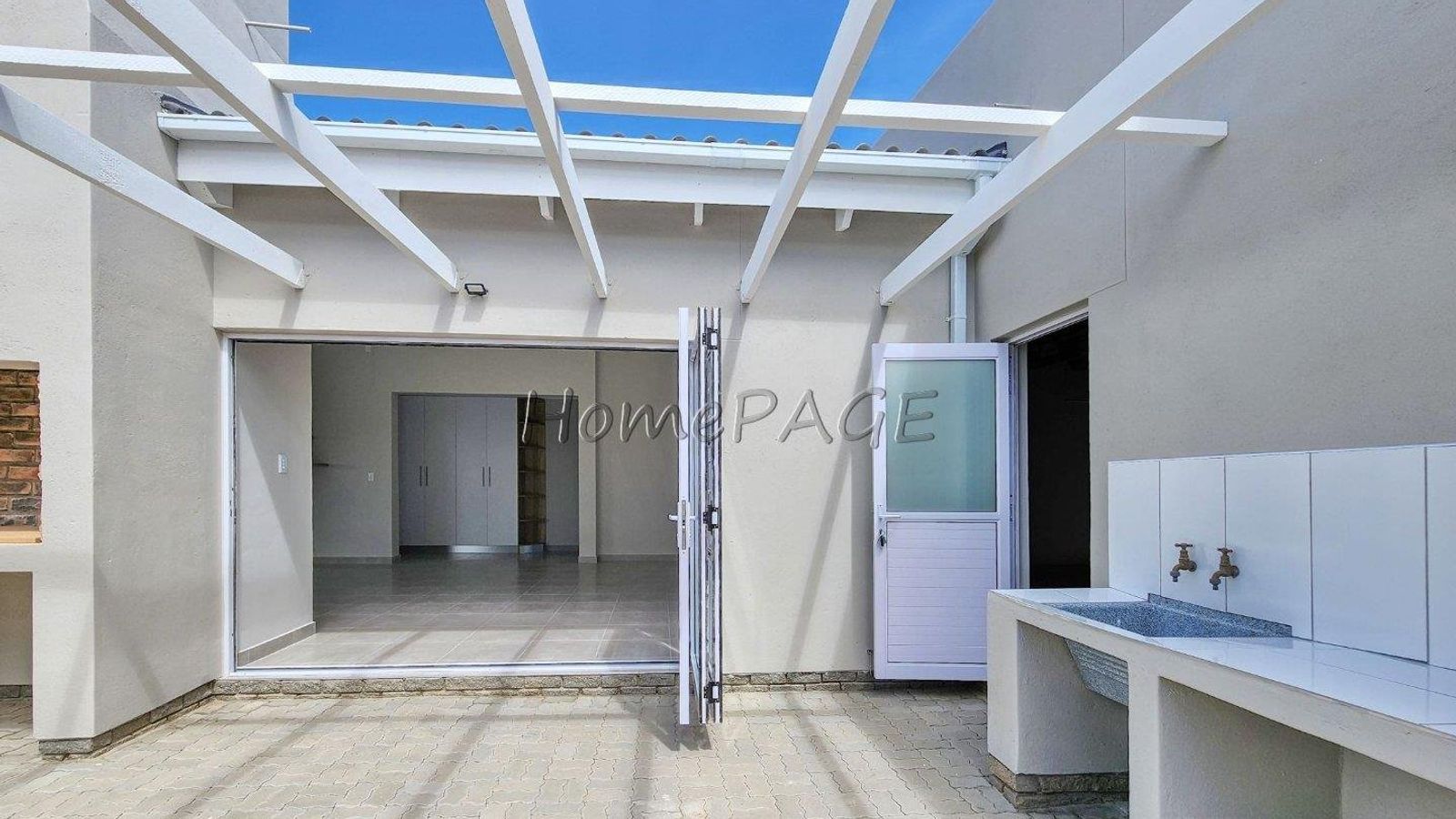 *** From living area through stack doors is the outside pergola patio, with outdoor BBQ, counter and basin
