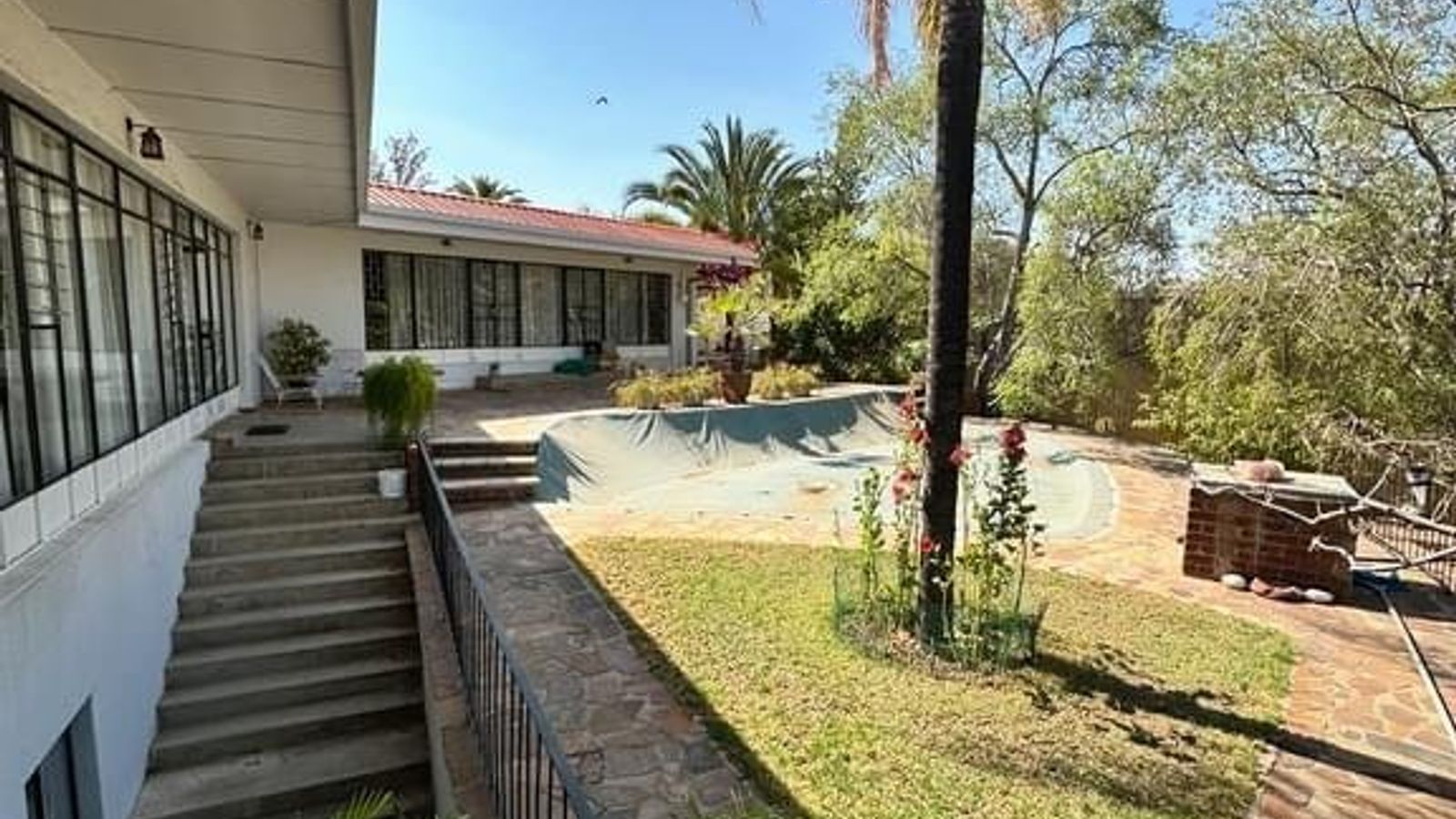 Additionally the house offers, a dedicated study and a wide comfortable passage to the bedrooms lead to the beautiful garden and pool area. The property includes a guest room with an en-suite bathroom, staff quarters, double garages, and a carport accommodating larger vehicles. Enjoy an abundance of fruit trees, three water tanks, and ample space for future expansion.