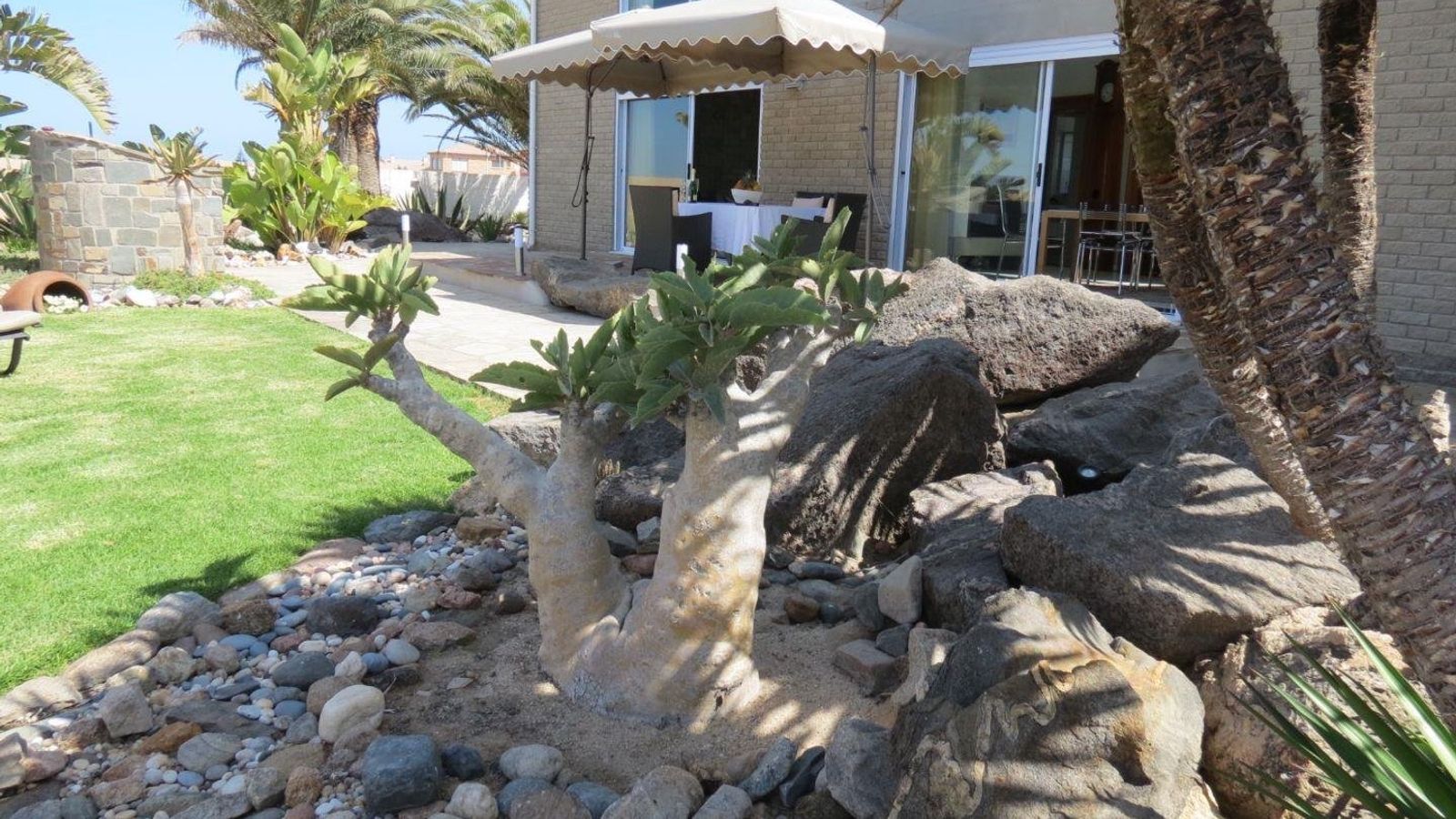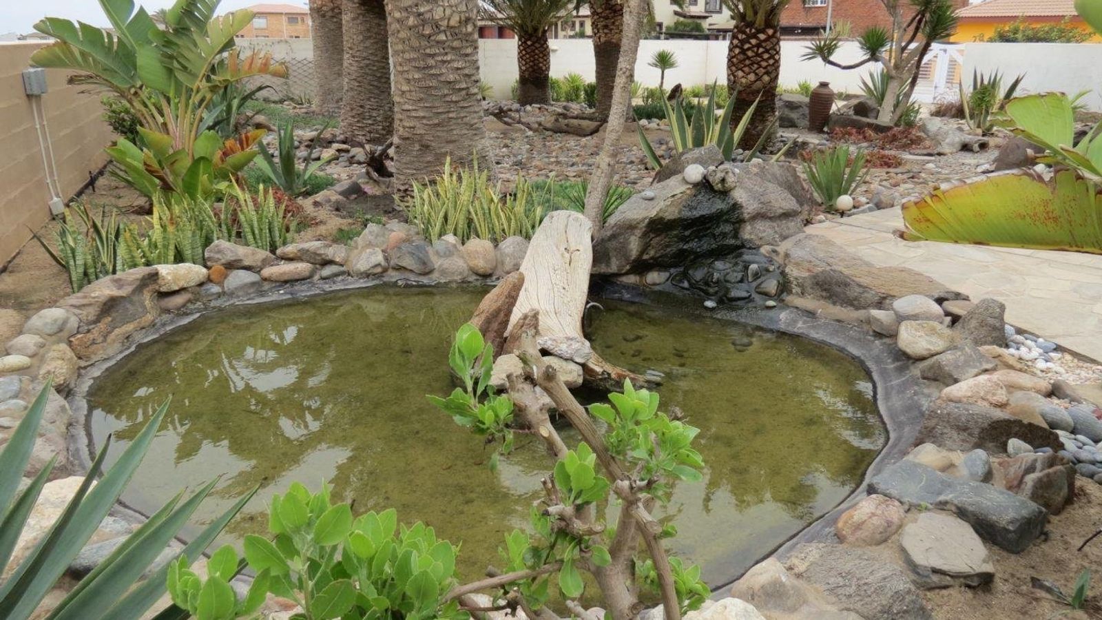 Subtropical palm garden with flat rock paving, tall palm trees, irrigation system, rockeries, lighting, a large pond and build-in Braai plus separate