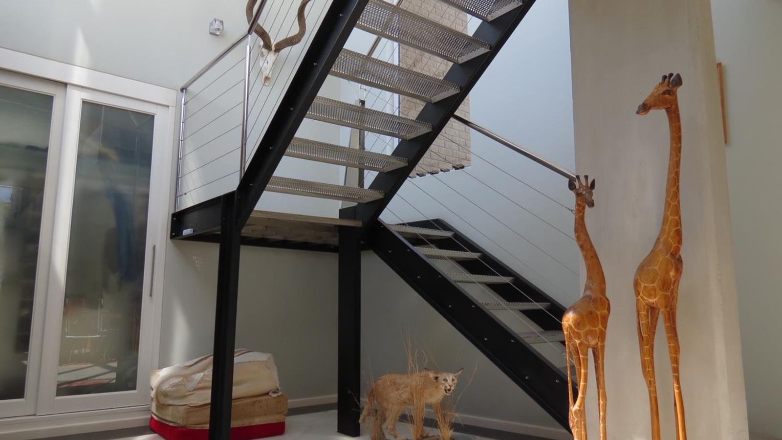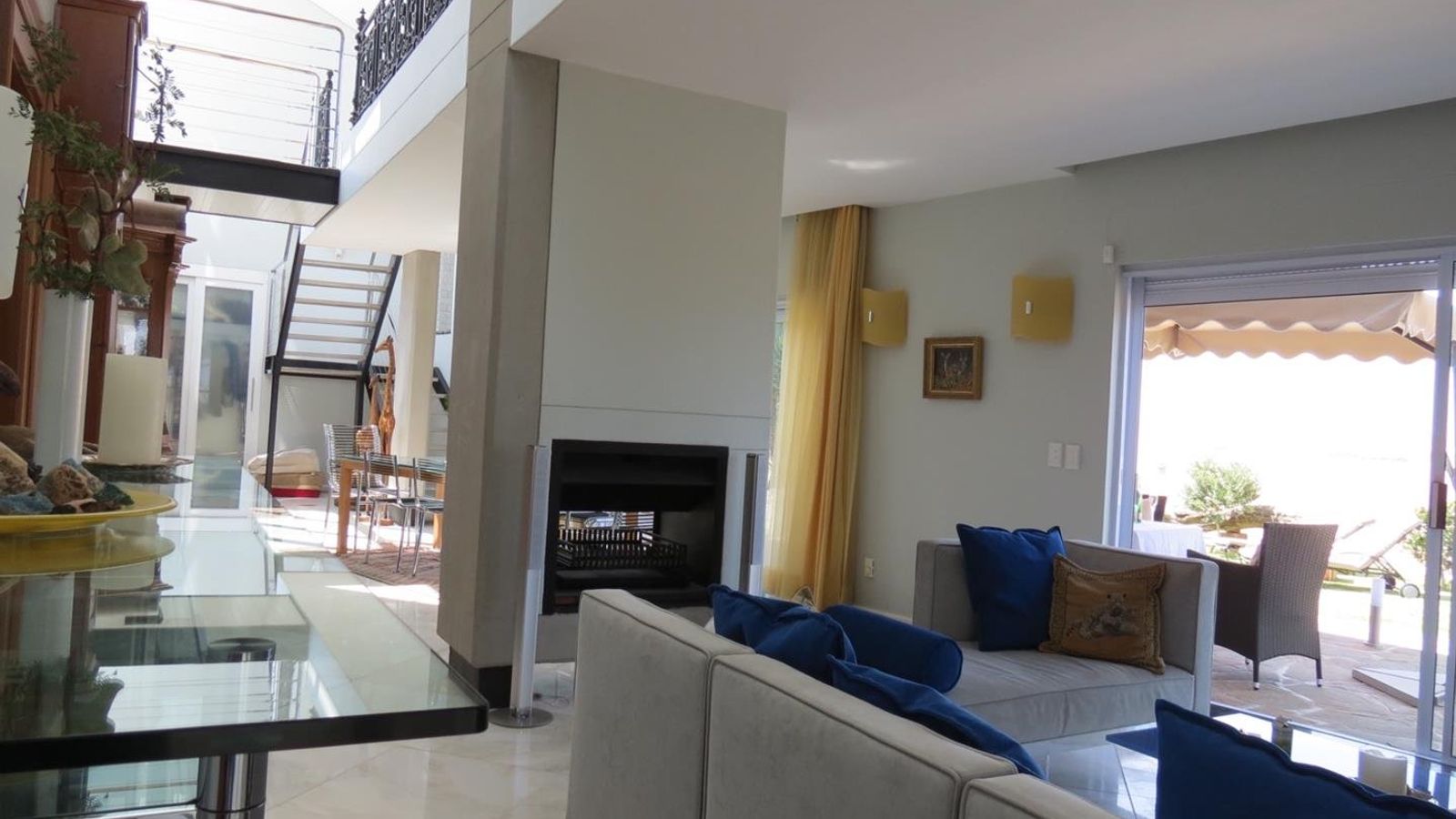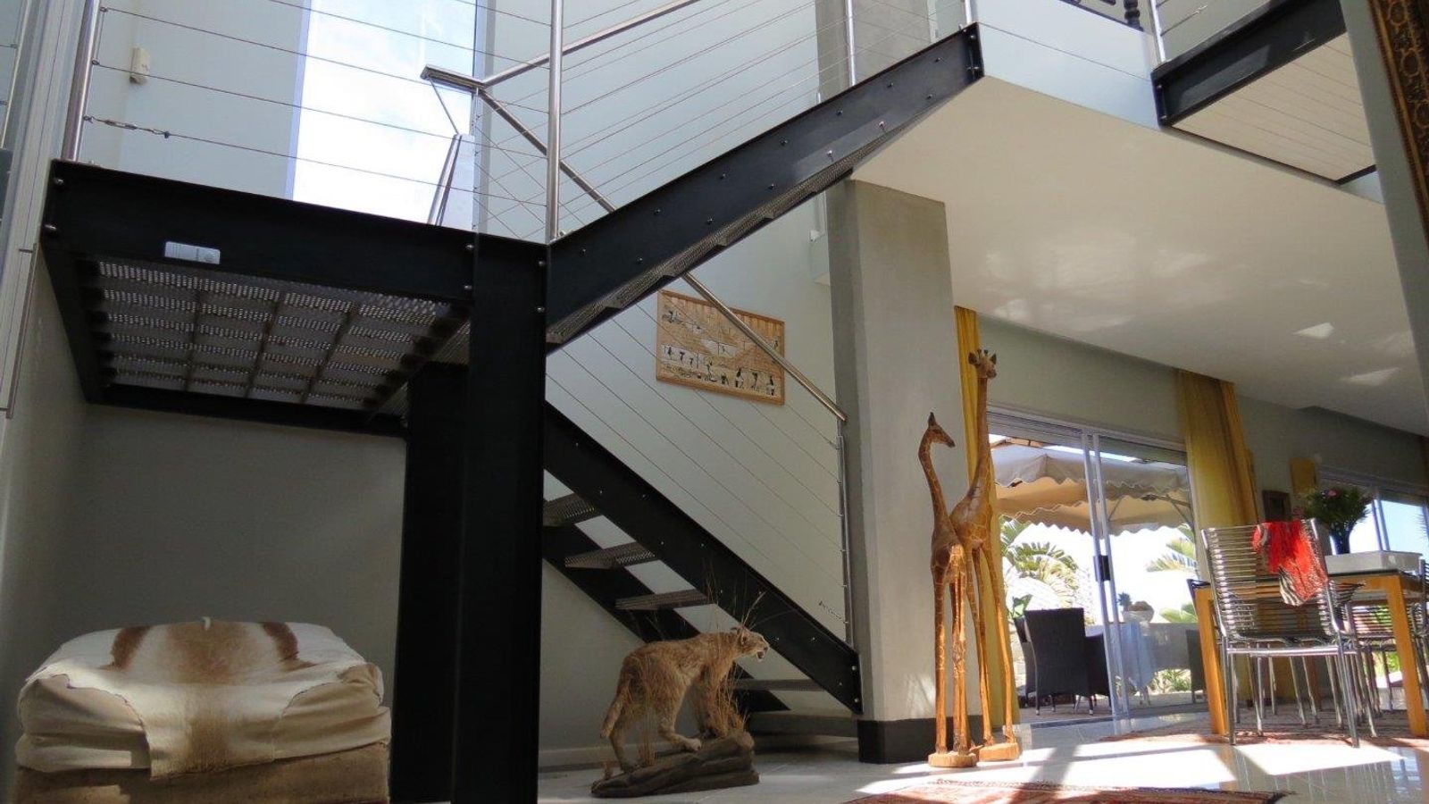 * A modern steel staircase leading up to a comfortable lounge with lovely dune views, a build-in fireplace and impressive cast iron railing