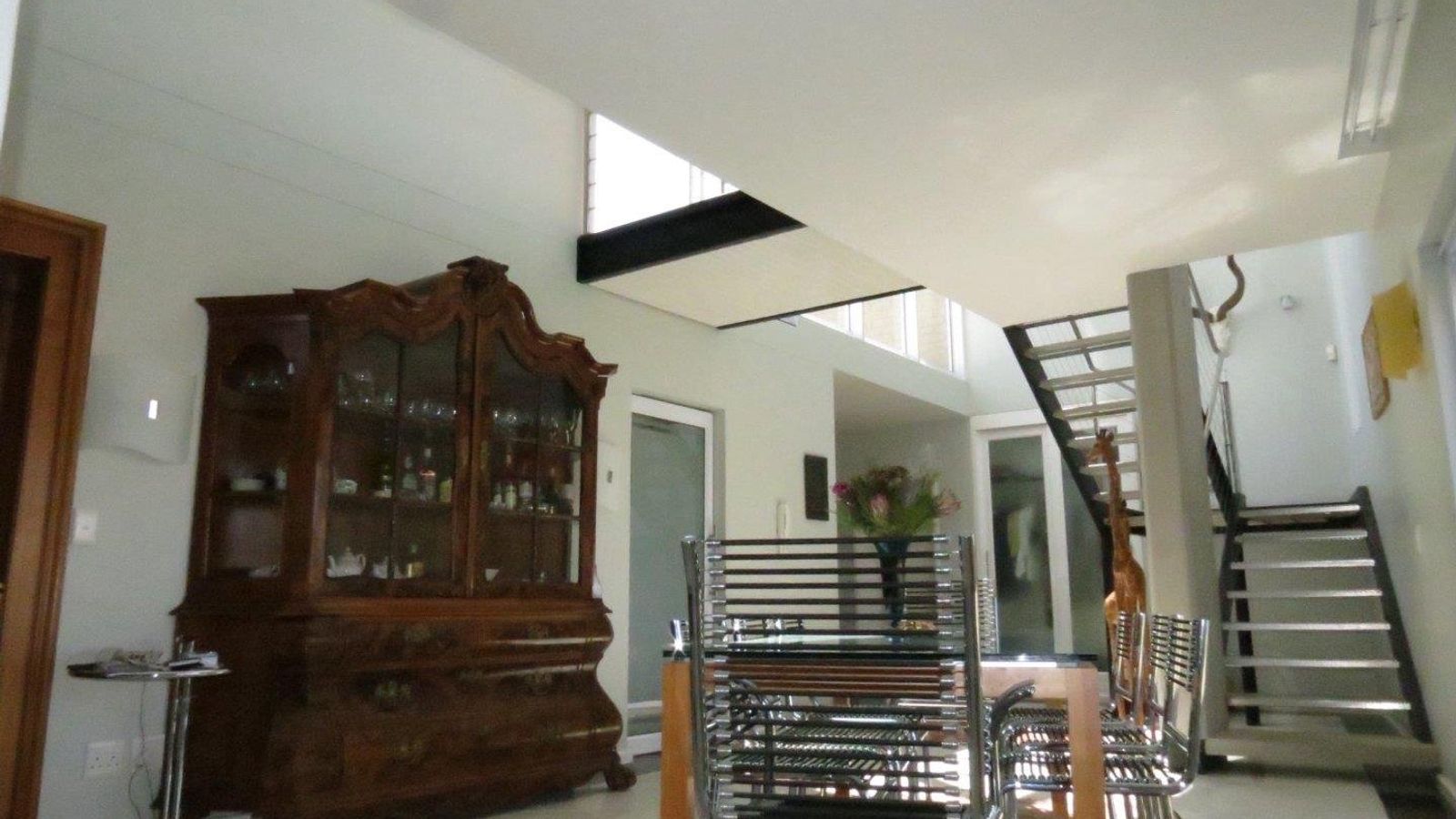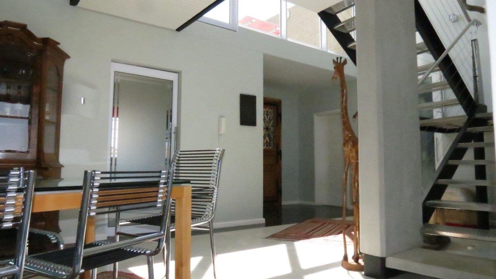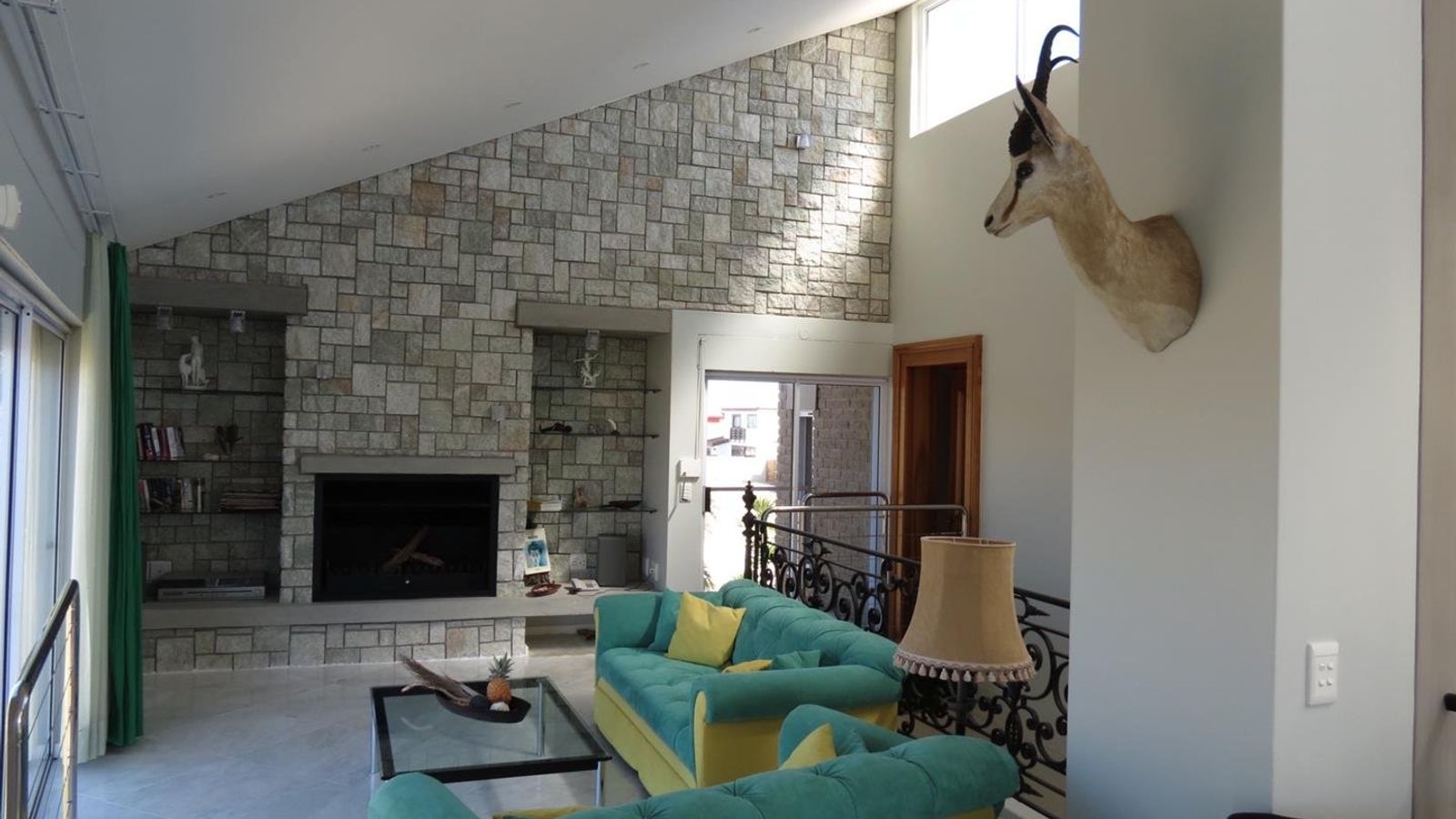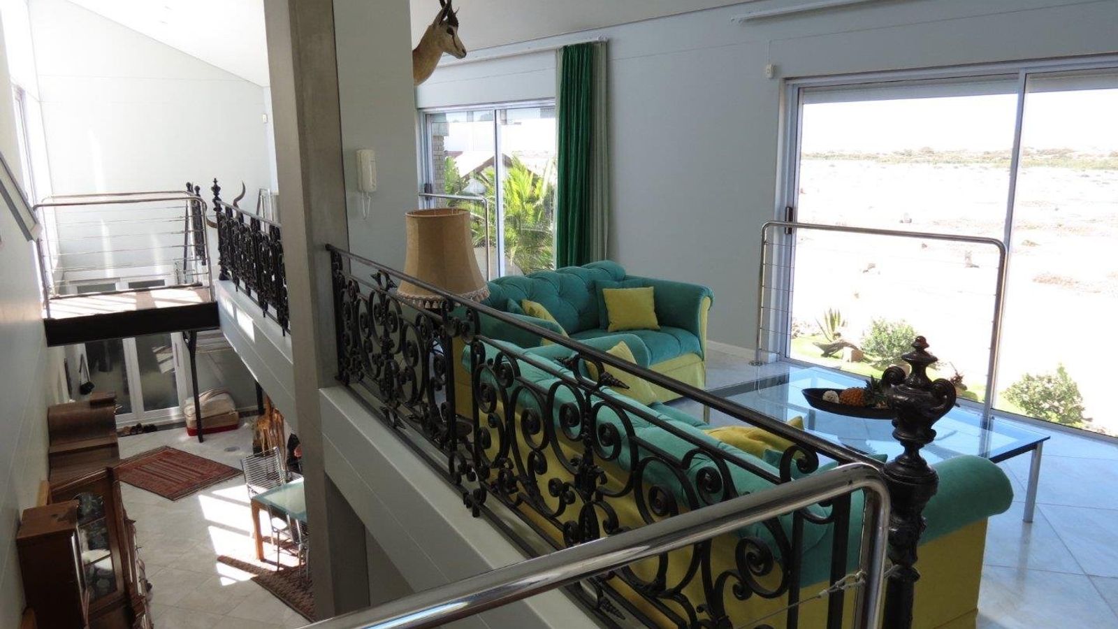 * A modern steel staircase leading up to a comfortable lounge with lovely dune views, a build-in fireplace and impressive cast iron railing
