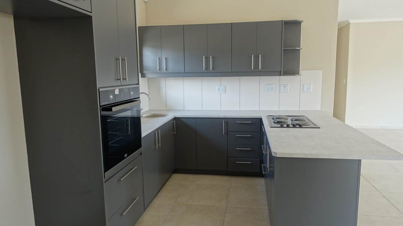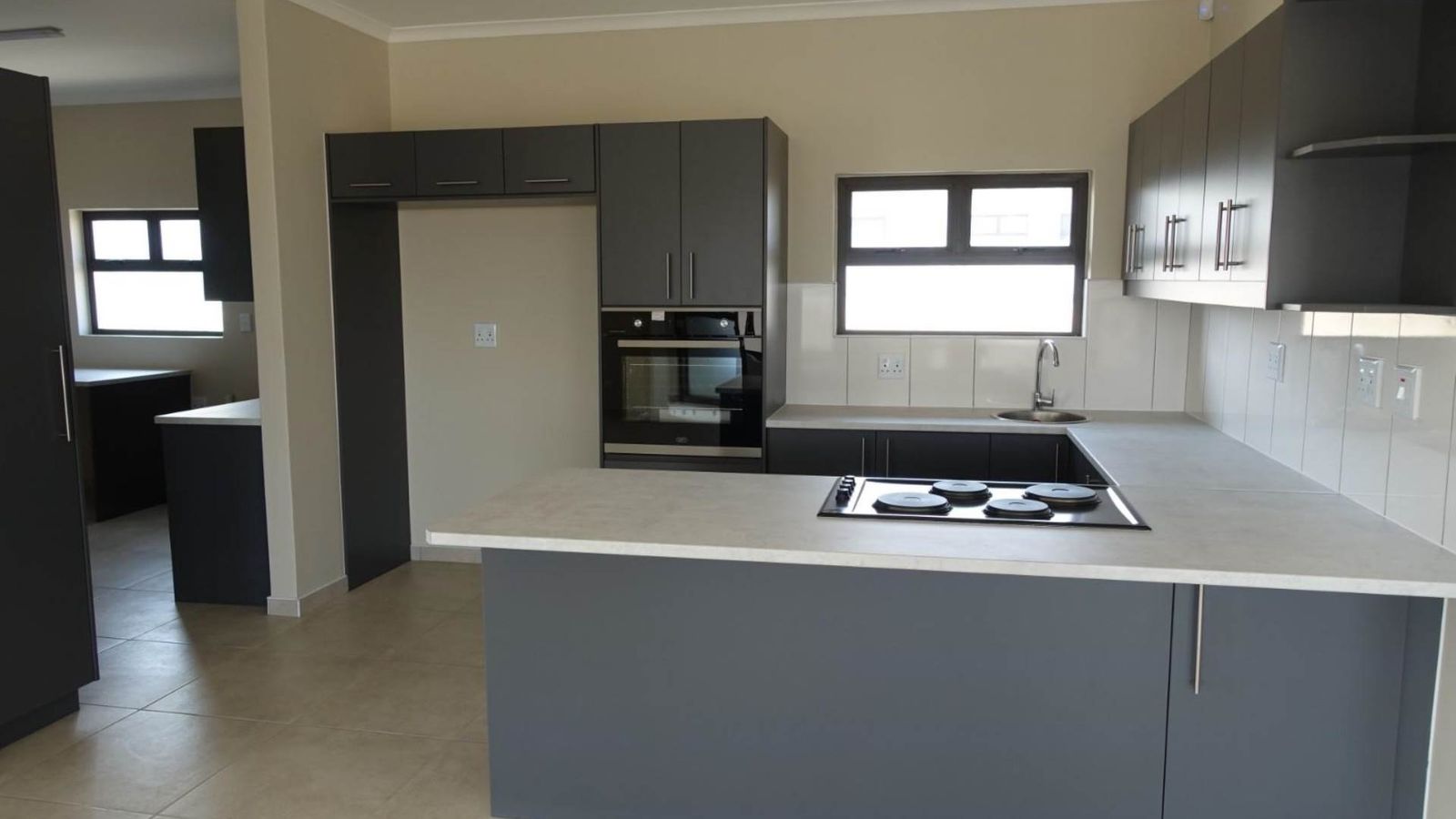 Open-plan fully fitted kitchen with prep bowl and large scullery