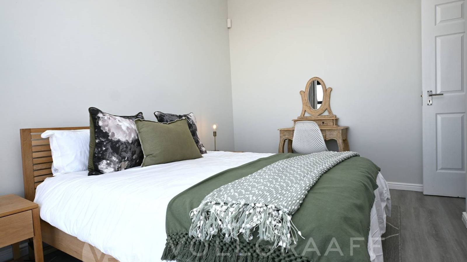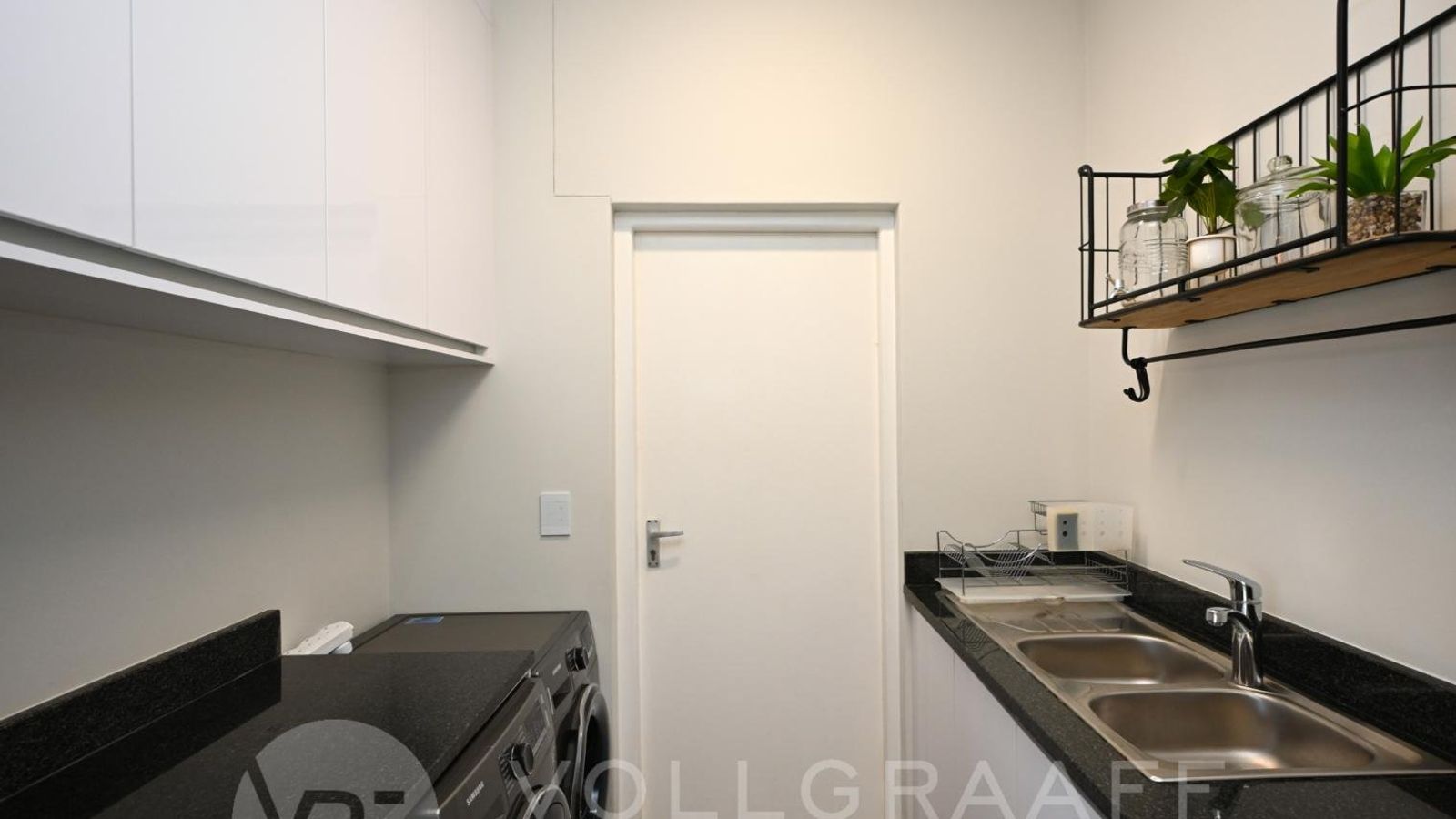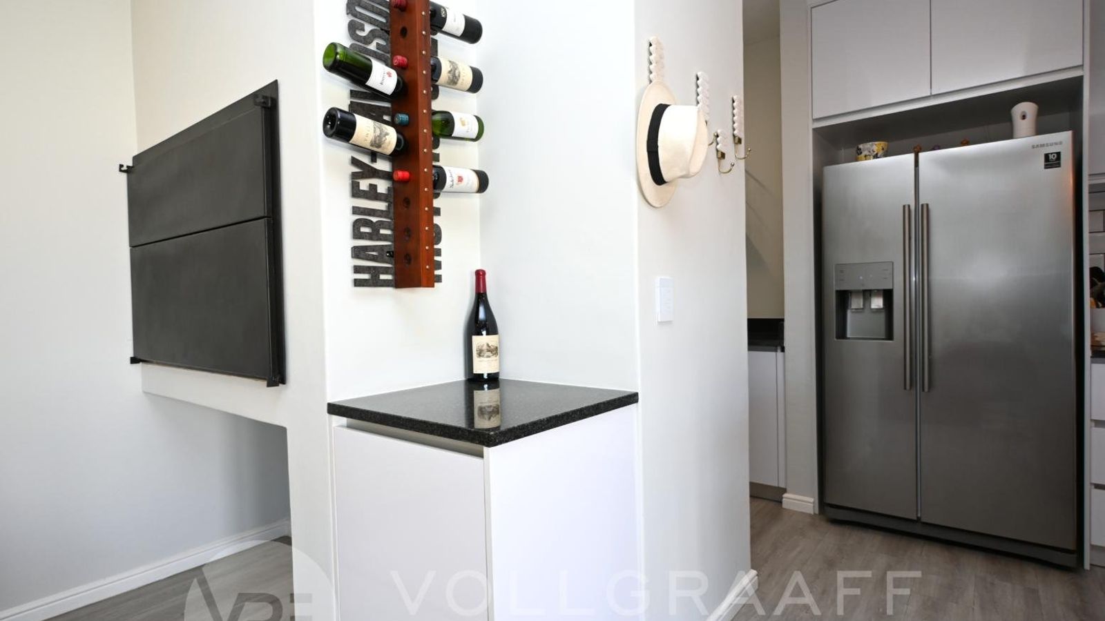 The home welcomes you into open living space where the kitchen, and lounge areas connect naturally. The kitchen is fitted with granite countertops and flows effortlessly into the main living area, creating a comfortable space for everyday living and easy entertaining. A built-in braai forms part of the living area, while stack-away sliding doors open onto a private courtyard with a pergola and a neat lawn area — perfect for enjoying Swakopmund’s fresh coastal air.