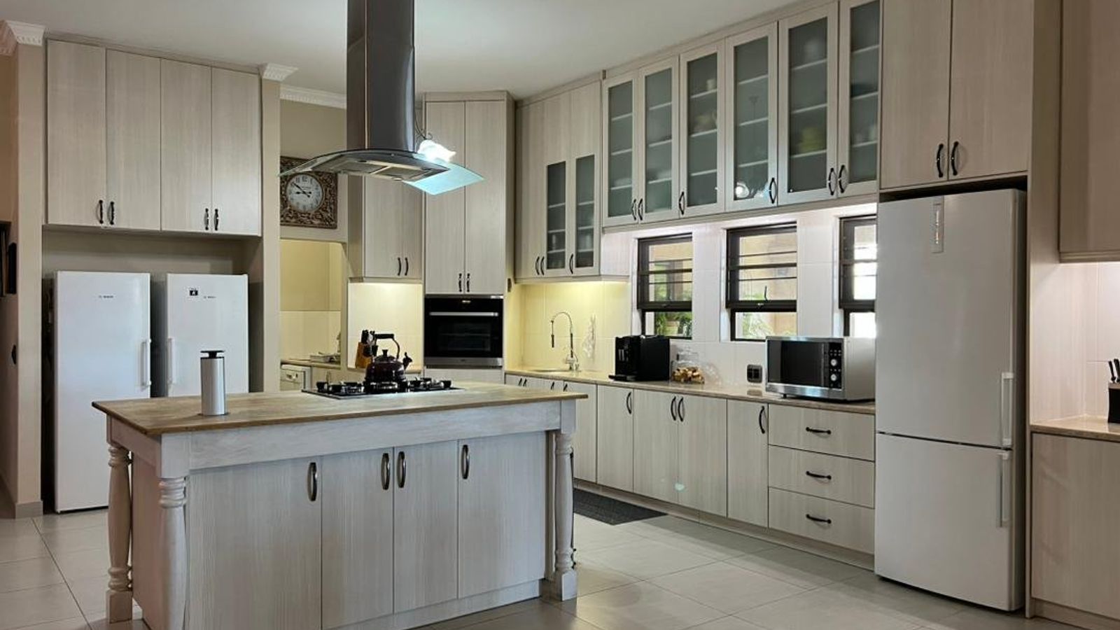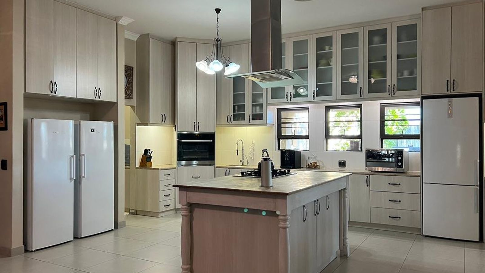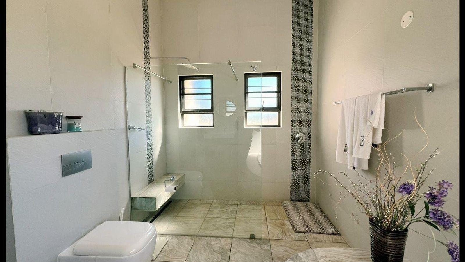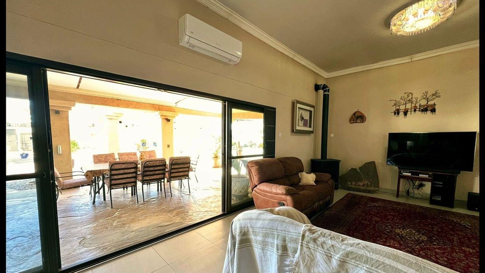 This modern 3-bedroom house has a huge open plan living area with a kitchen to die for with a dining room, lounge, tv room, all opening on to an outside entertainment area with braai etc., there is an office and hobby room as well as a granny flat with separate patio and entrance. The underfloor heating, water cooling system. state of the art solar energy installation with a backup generator, the grey water system for gardening, registered borehole as well as access to municipal water and numerous outbuildings makes this value for money and basically self-sustained living.