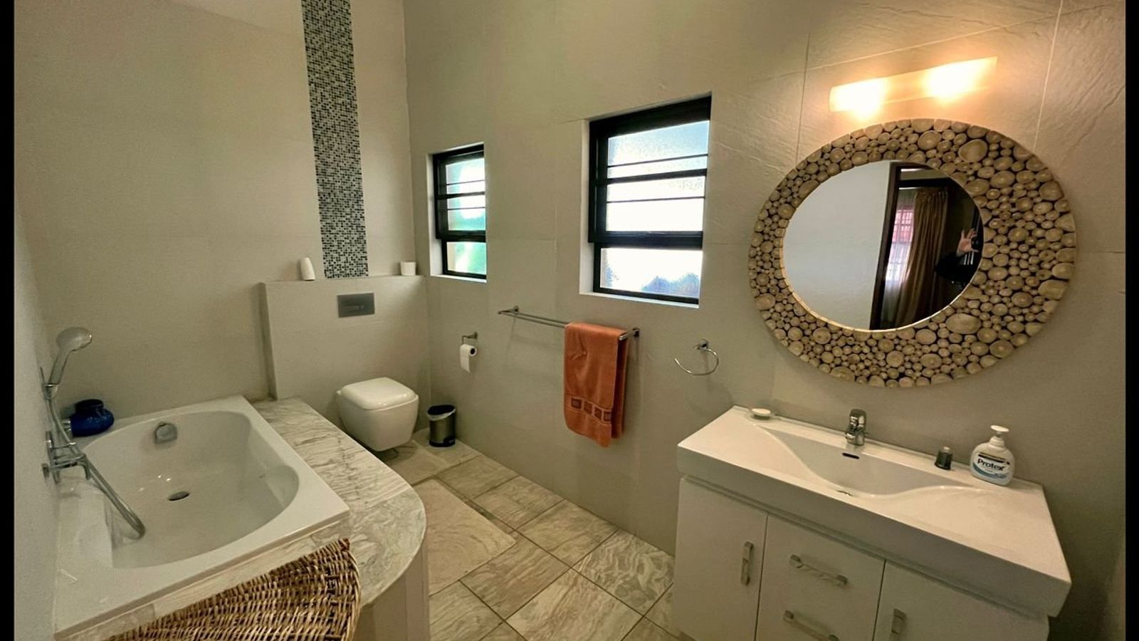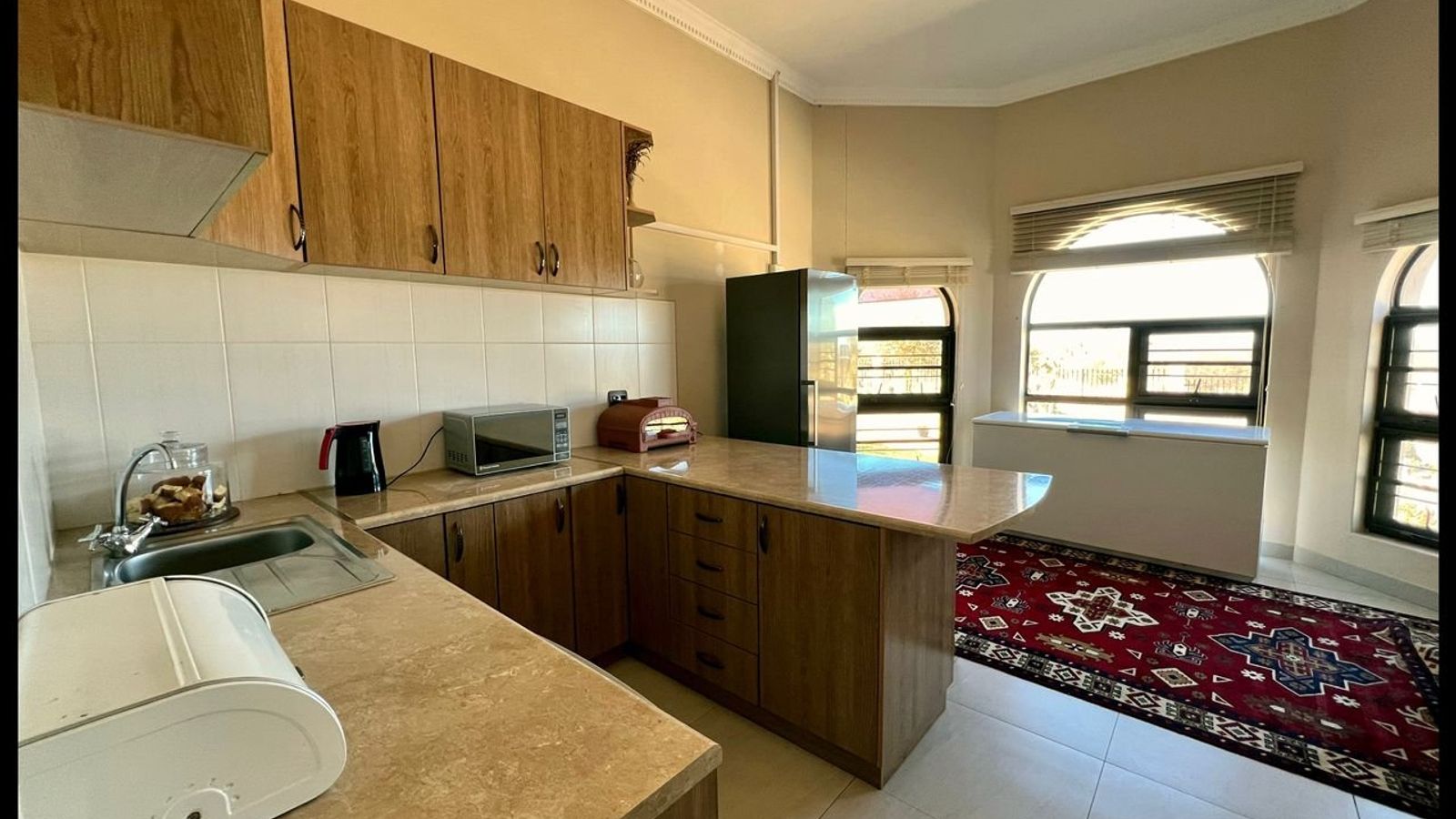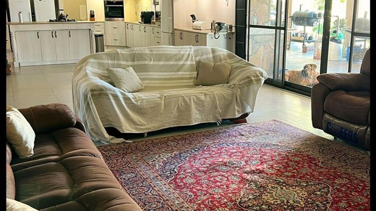 This modern 3-bedroom house has a huge open plan living area with a kitchen to die for with a dining room, lounge, tv room, all opening on to an outside entertainment area with braai etc., there is an office and hobby room as well as a granny flat with separate patio and entrance. The underfloor heating, water cooling system. state of the art solar energy installation with a backup generator, the grey water system for gardening, registered borehole as well as access to municipal water and numerous outbuildings makes this value for money and basically self-sustained living.