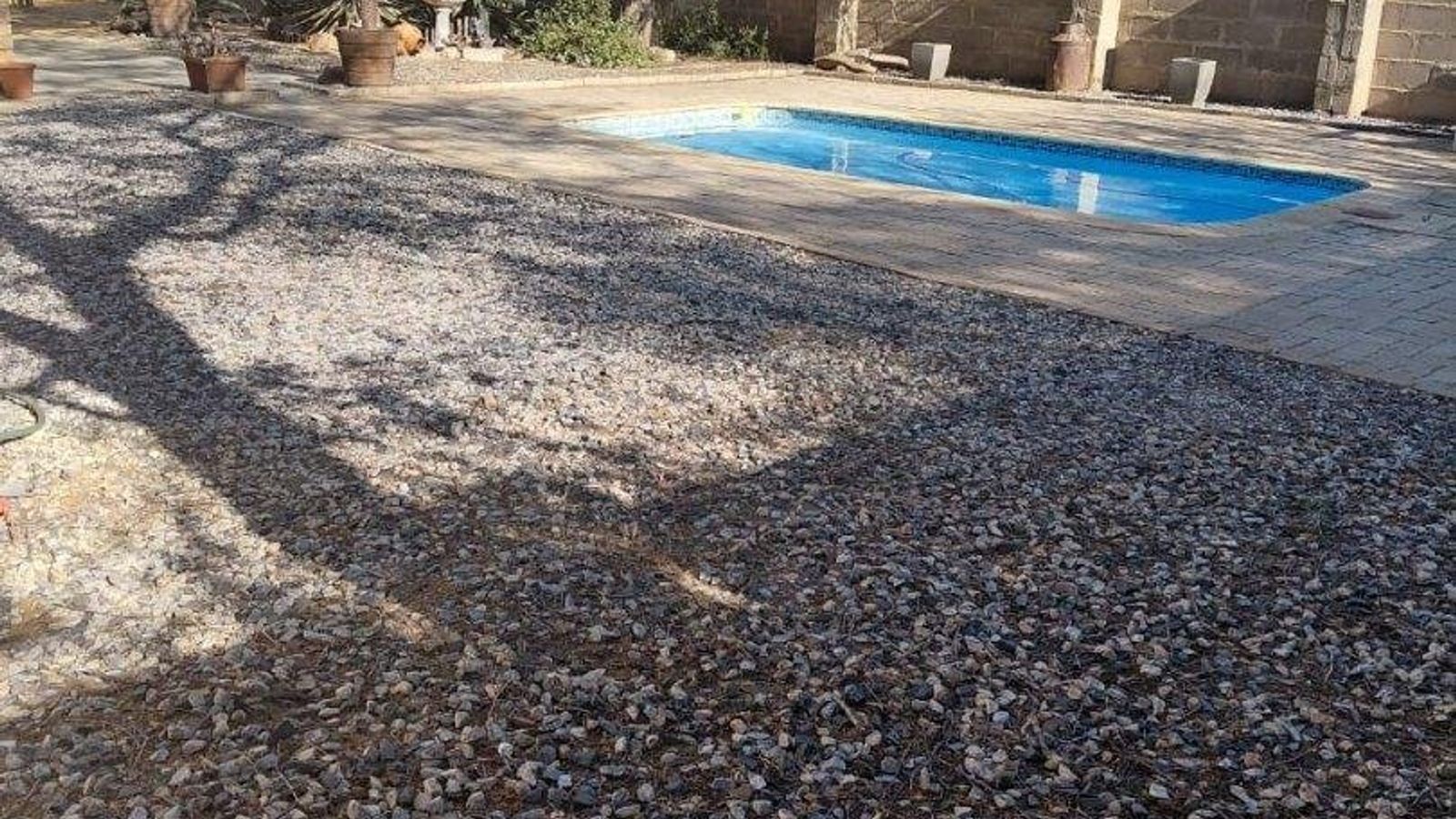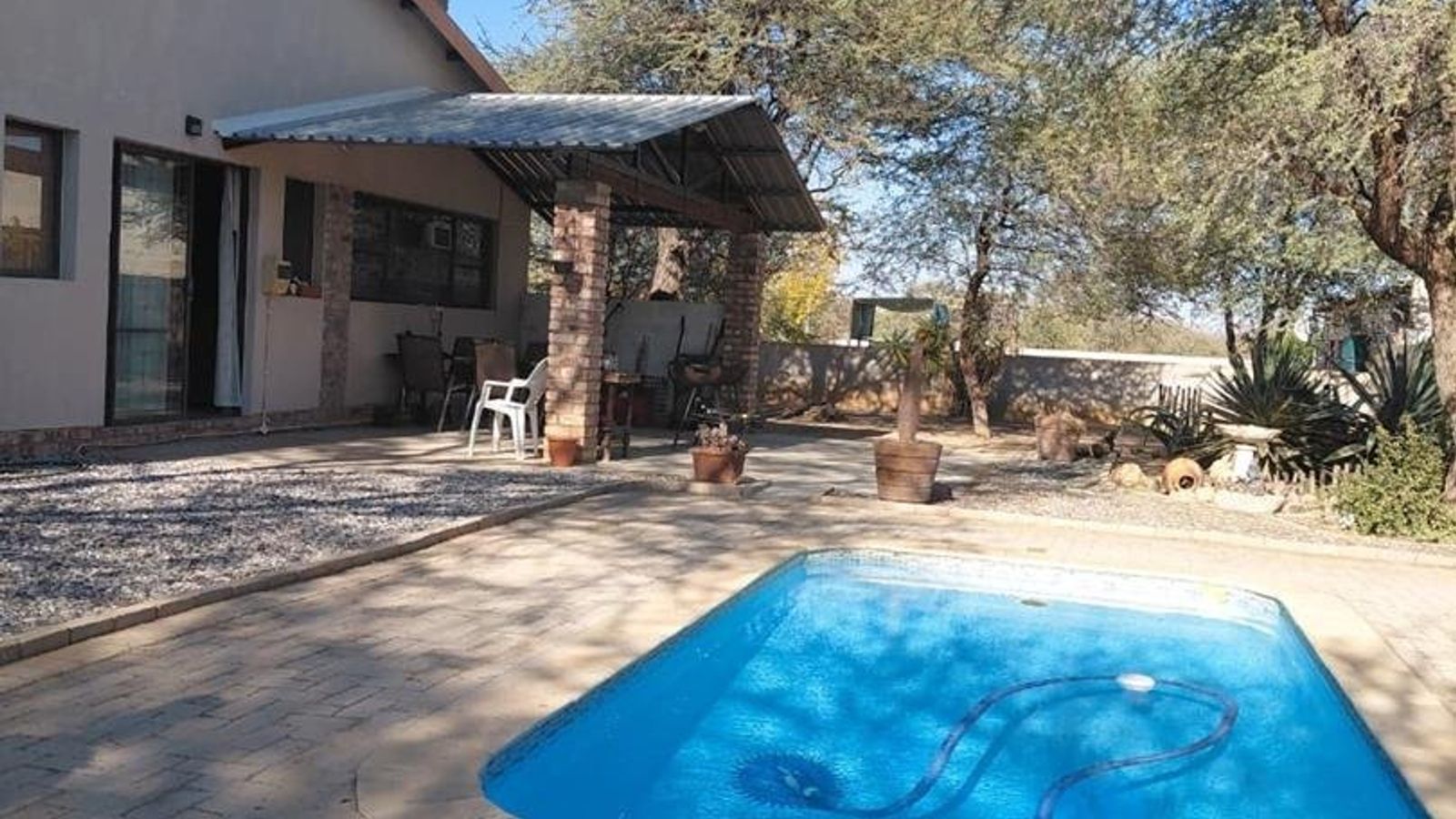 The property is fully secured with a boundary wall on 3 sides, as well as a lower wall with pallisades in front. You can enjoy some fresh air and relaxation on the verandah at the back of the house, which leads to a sparkling swimming pool. The erf still has plenty of space available for any additions or personal touches you may wish to make.