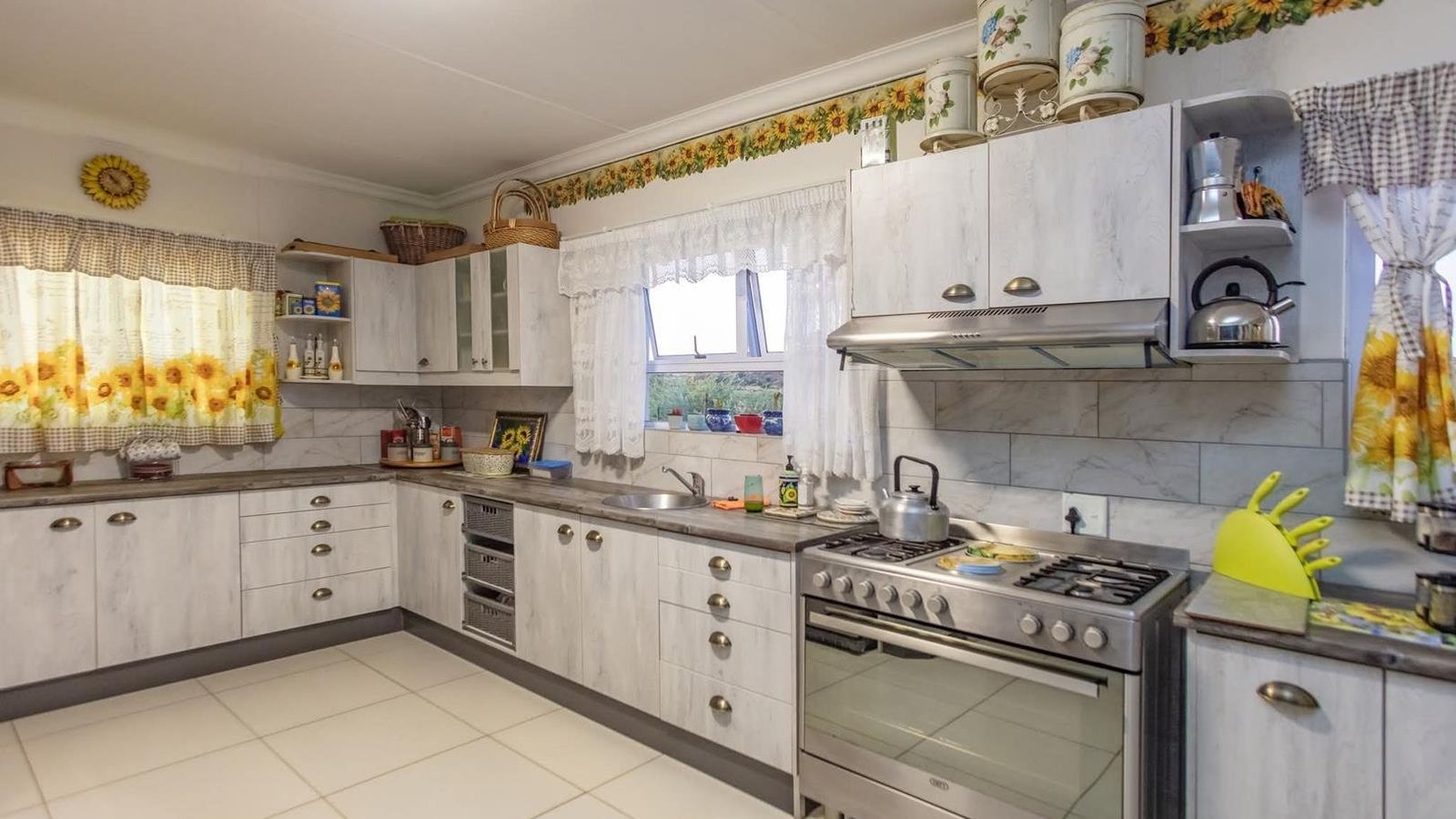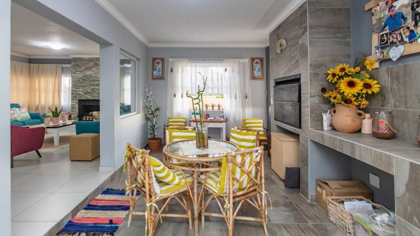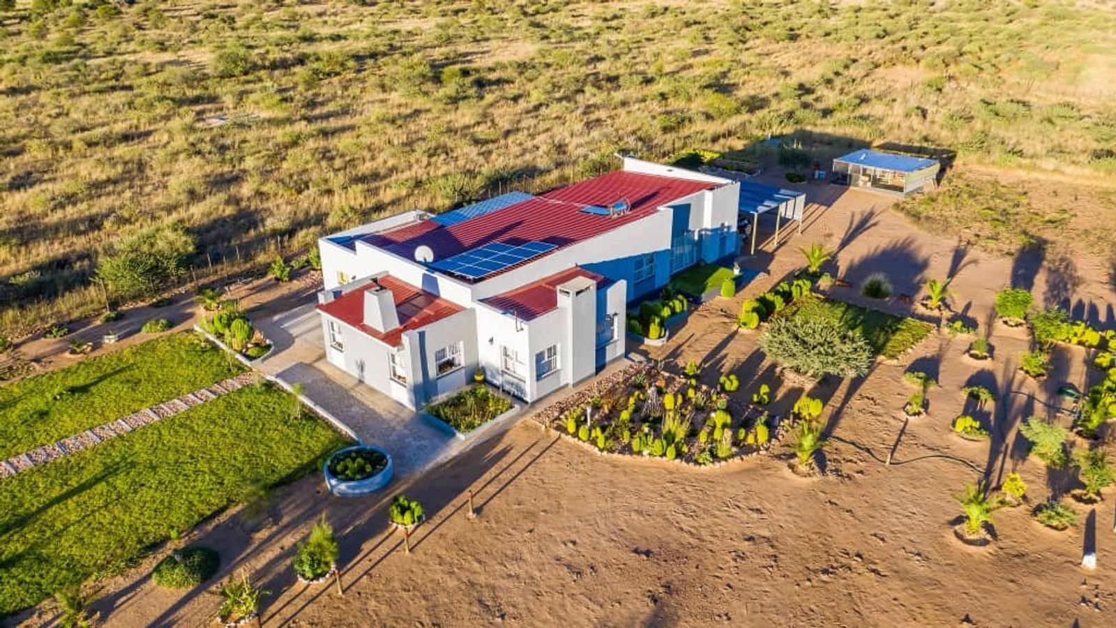 3 Bedrooms / 2 Bathrooms/ Open – plan Kitchen/ 2 in 1 Laundry room and Pantry / Living areas/ Dining area/ Indoor entertainment area with a built-in braai / Guest toilet/ Double Garage/ Swimming pool/ Outside veranda / Braai area/ Small Scale Agricultural Garden/ Solar System and Irrigation System/ Covered carport with ample parking spaces