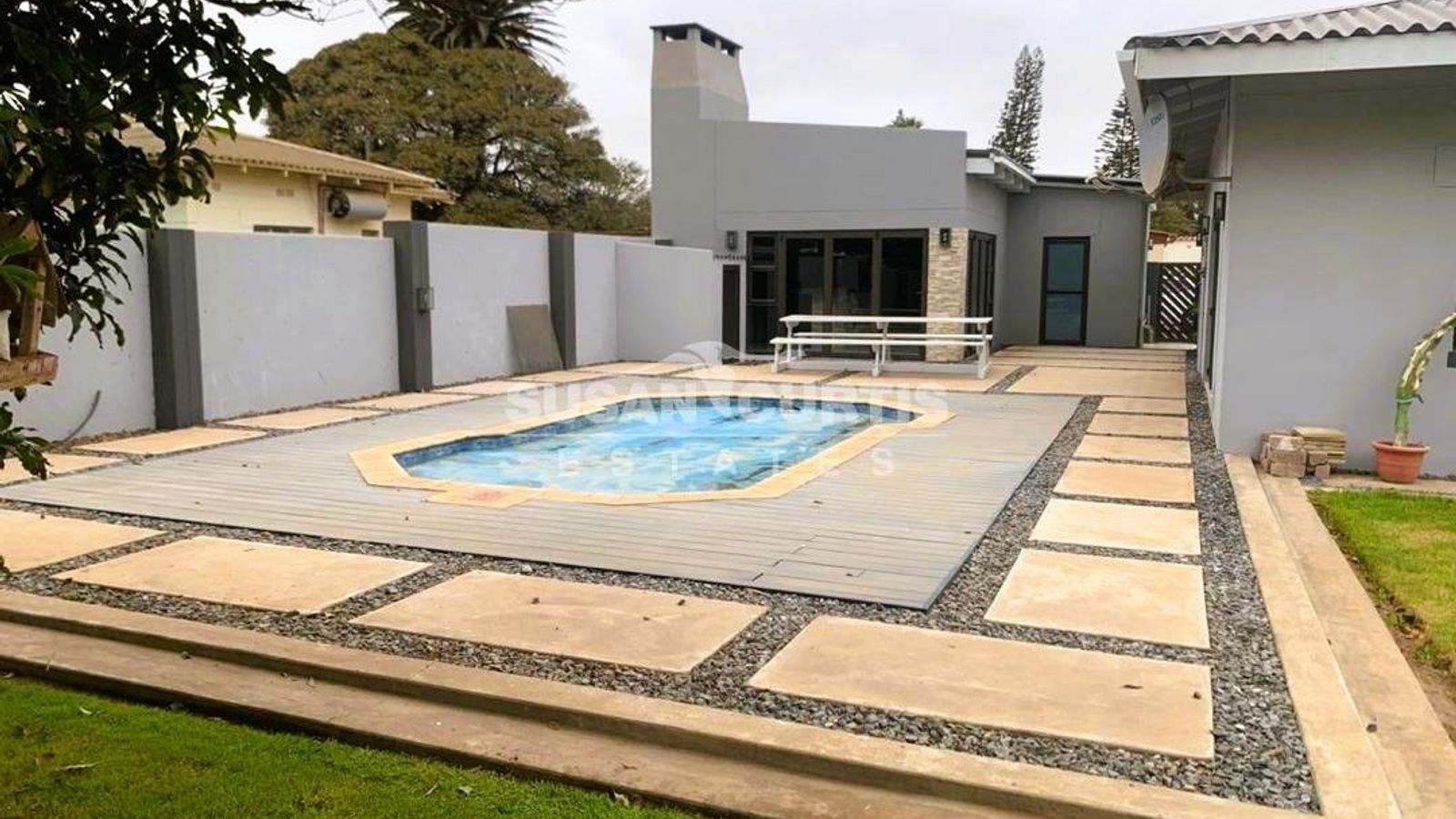 6m x 3m Swimming pool set within a lush, manicured garden equipped with a full irrigation system