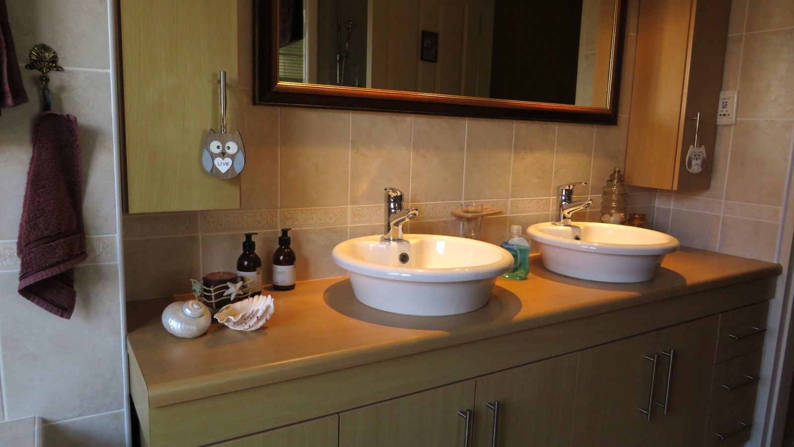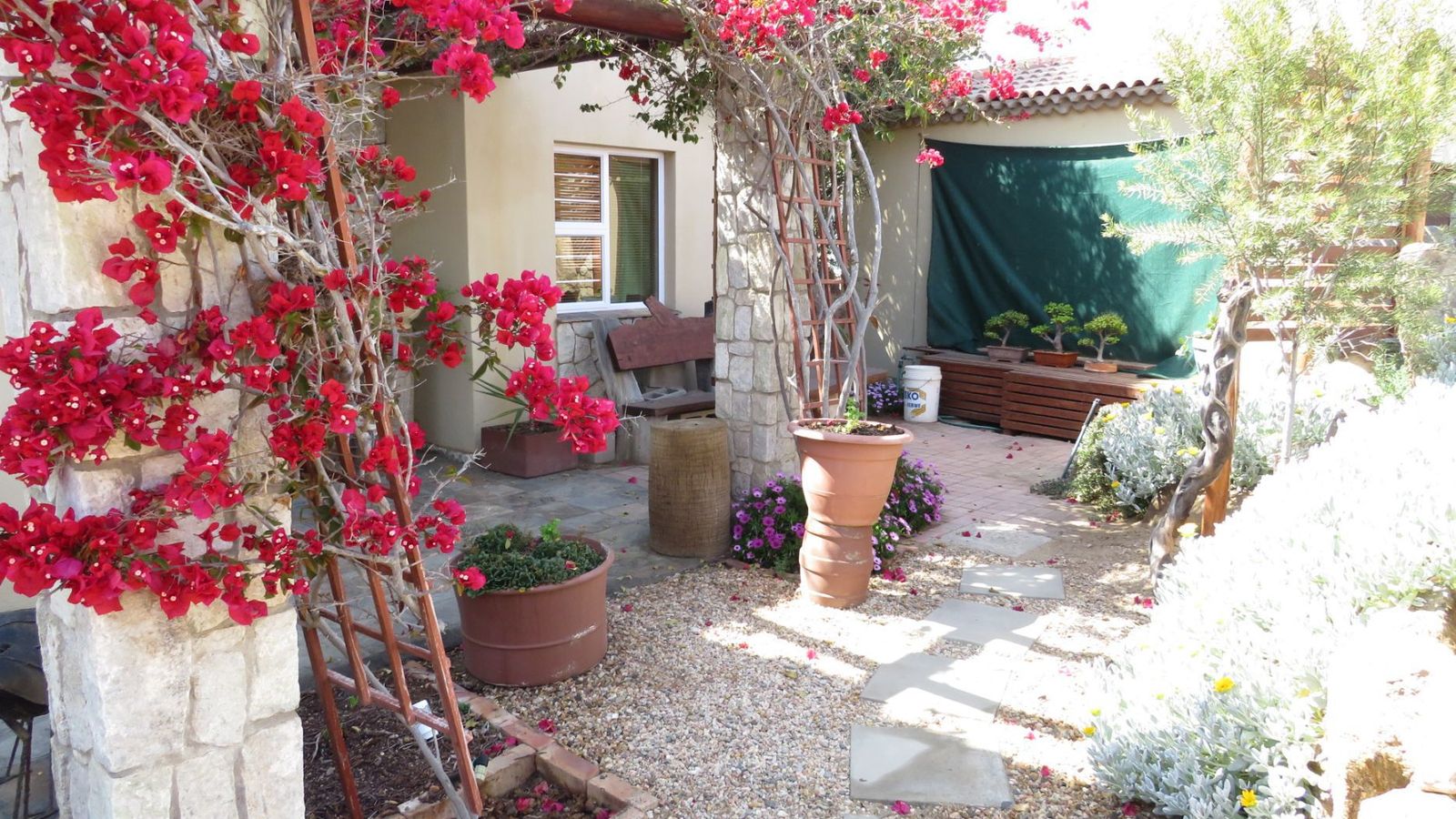 Downstairs offers a generous open-plan living area with a large fireplace, seamlessly flowing into the kitchen and dining room. The third bedroom is also located on this level and opens through elegant French doors onto a pergola-covered patio, where one can unwind to the peaceful sounds of abundant birdlife.