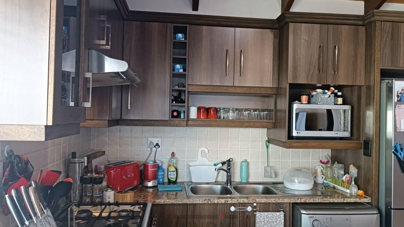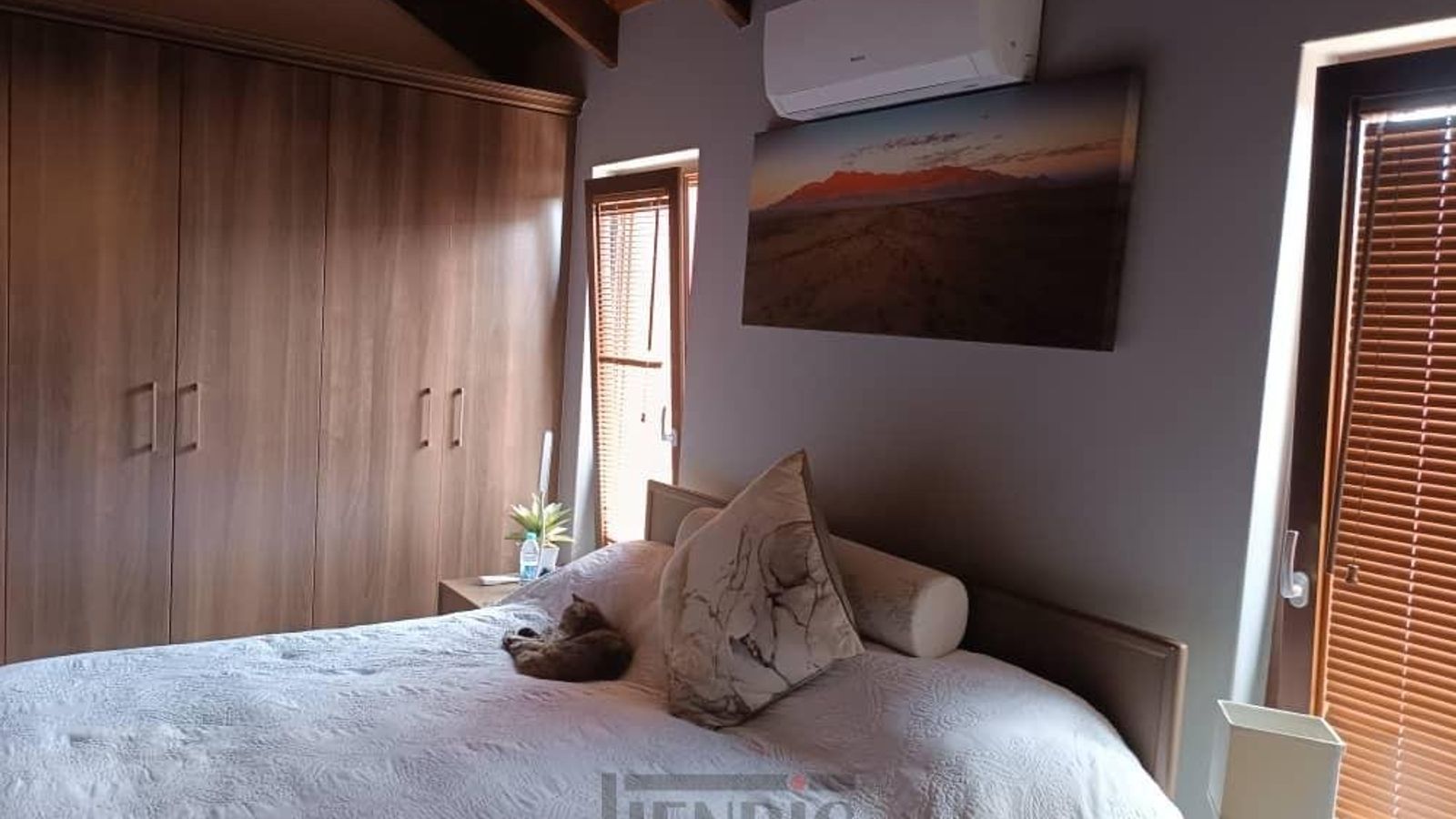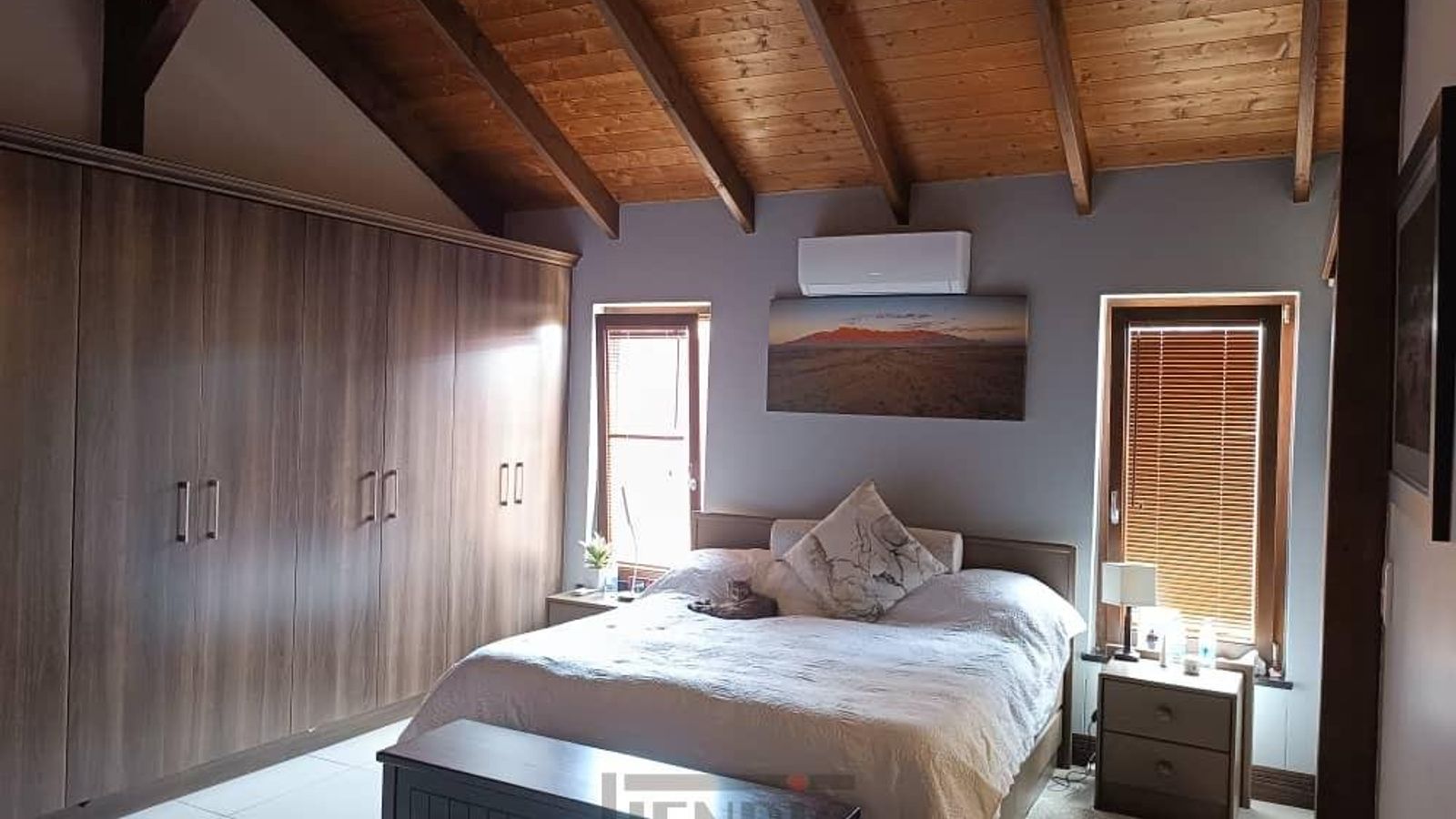 Practicality meets convenience with a double garage that provides abundant storage space. The property is also eco-friendly, featuring a solar geyser, while modern comforts such as a Stiebel Eltron geyser in the kitchen, heated towel rails in the bathroom, and an air conditioner ensure optimal comfort in any season.