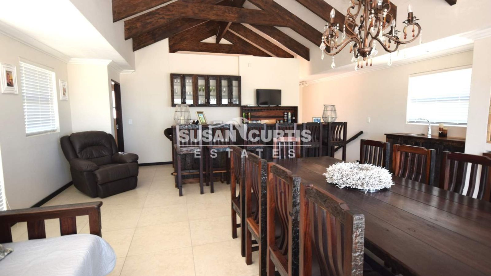 # Dining area, with impressive rustic chandelier.
