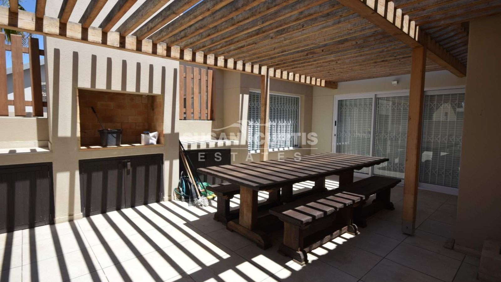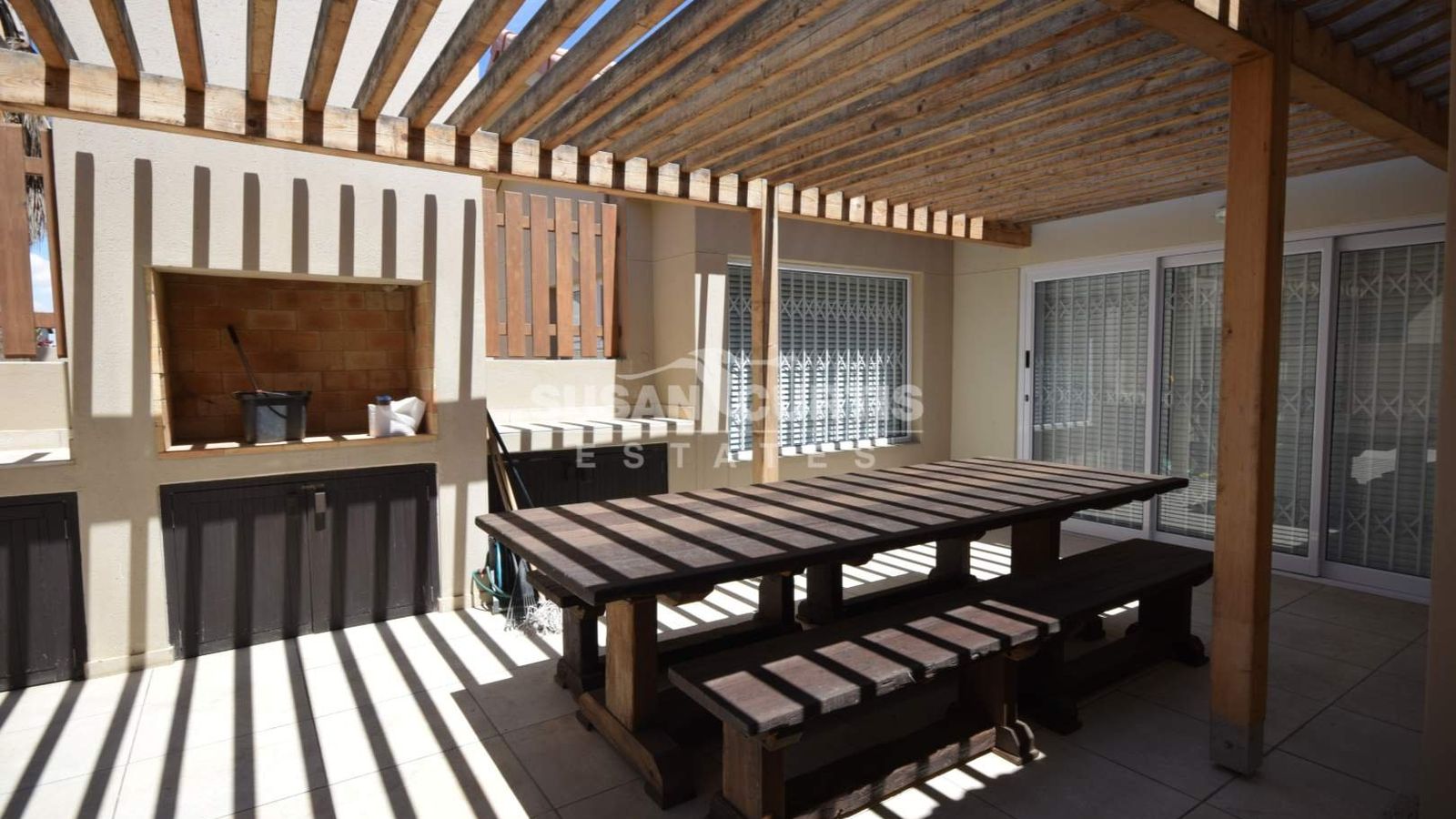 # Sliding doors open up to an Entertainment area with a under cover wind protected patio and outside BBQ.