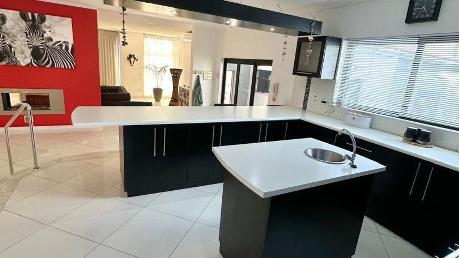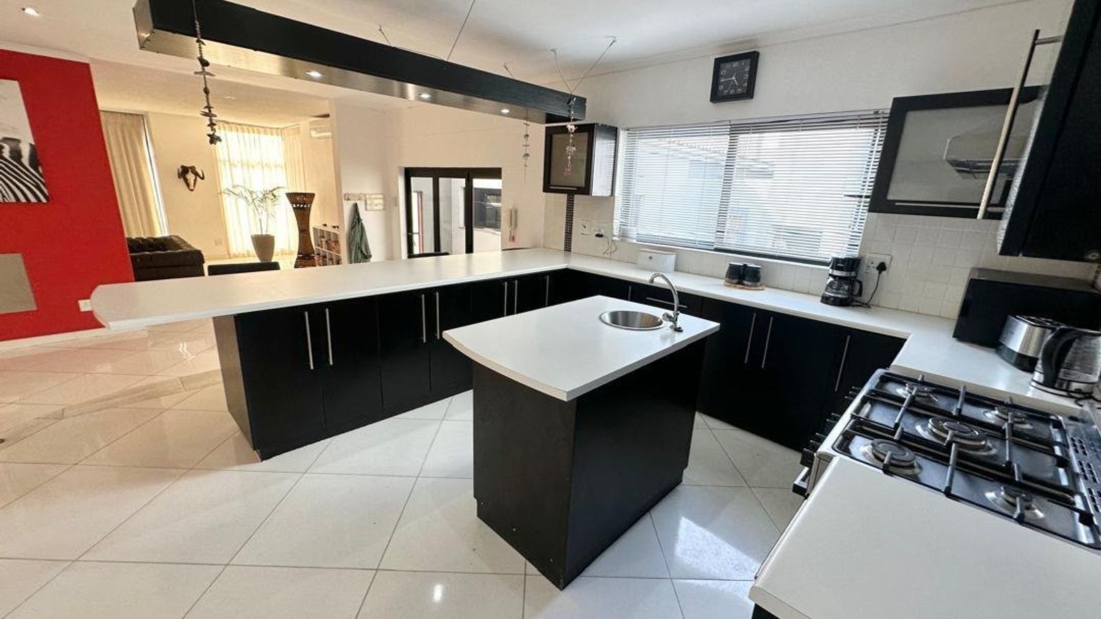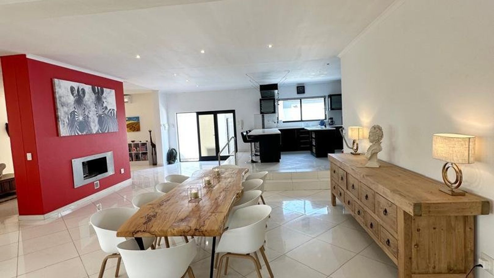 The heart of the home is a stunning open-plan kitchen fitted with marble countertops, quality appliances, and a separate scullery and laundry area for added convenience. Flowing seamlessly from the kitchen is a generous dining space with a double-volume ceiling, enhancing the sense of space and sophistication.