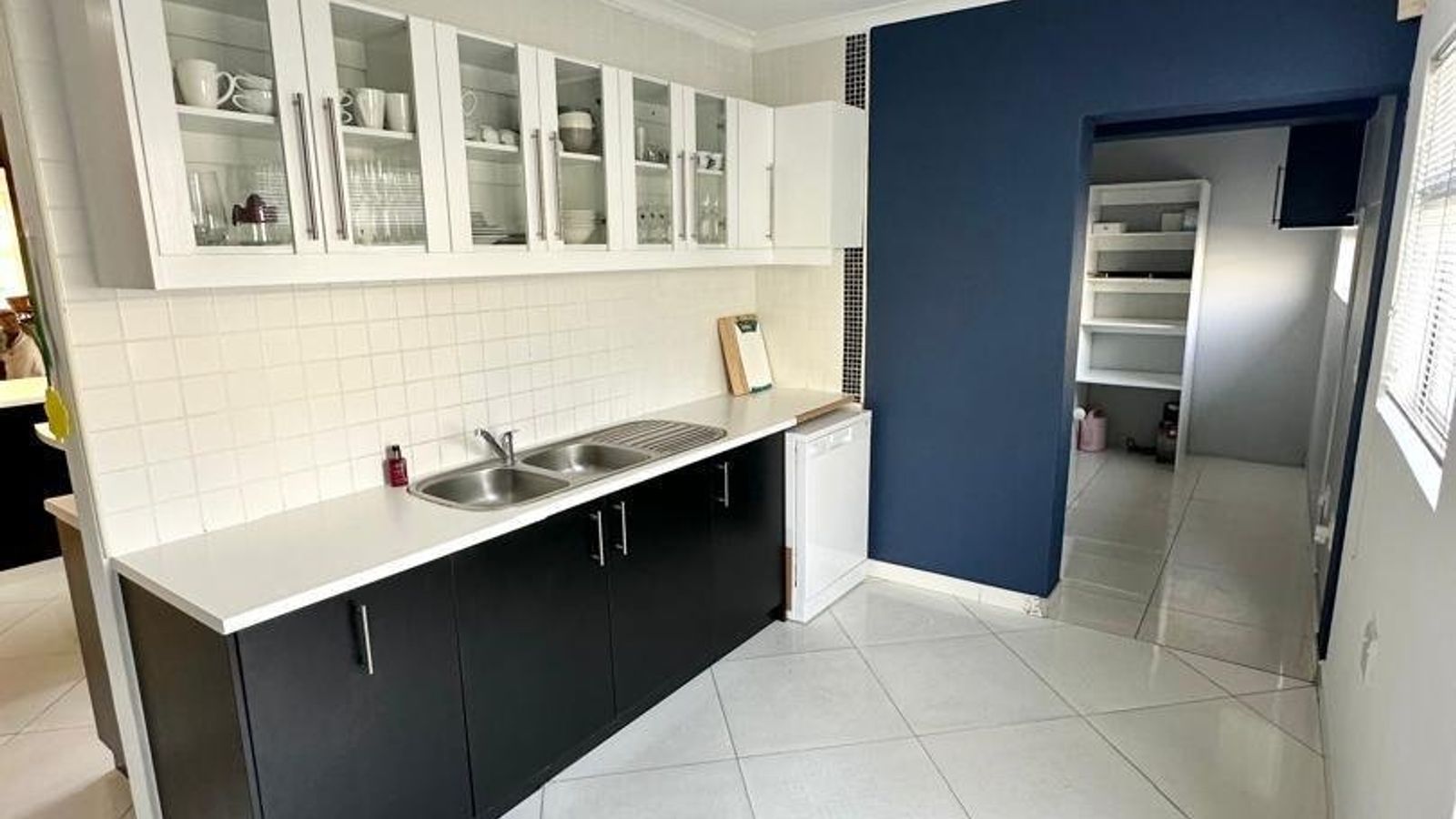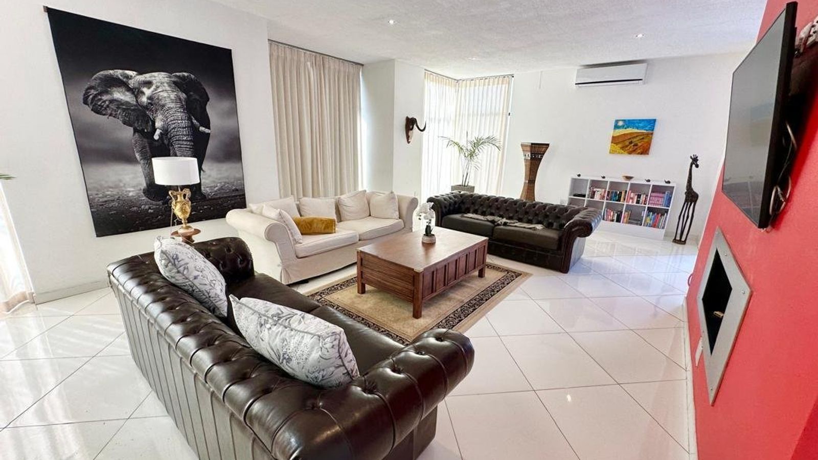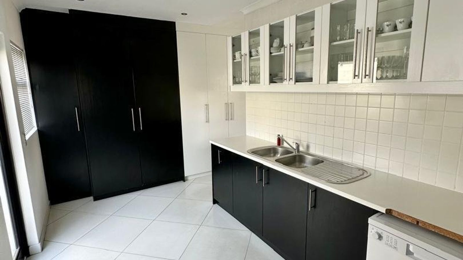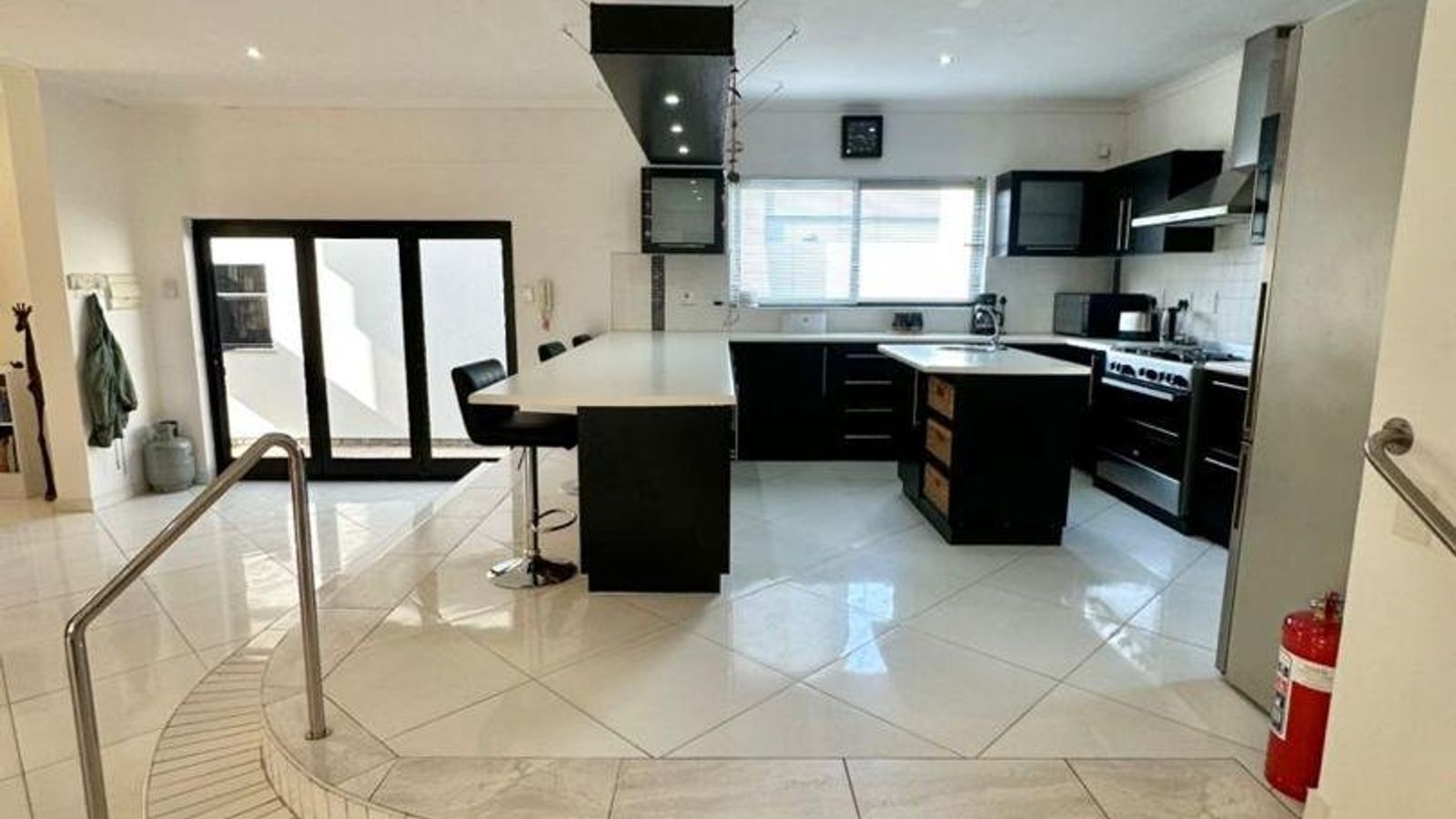 The heart of the home is a stunning open-plan kitchen fitted with marble countertops, quality appliances, and a separate scullery and laundry area for added convenience. Flowing seamlessly from the kitchen is a generous dining space with a double-volume ceiling, enhancing the sense of space and sophistication.