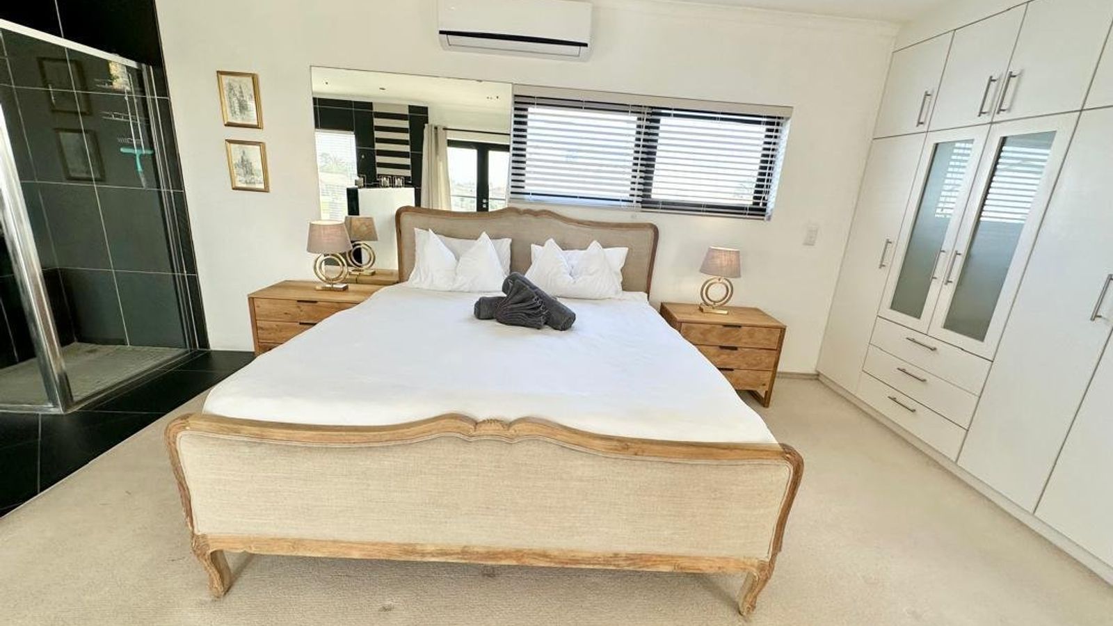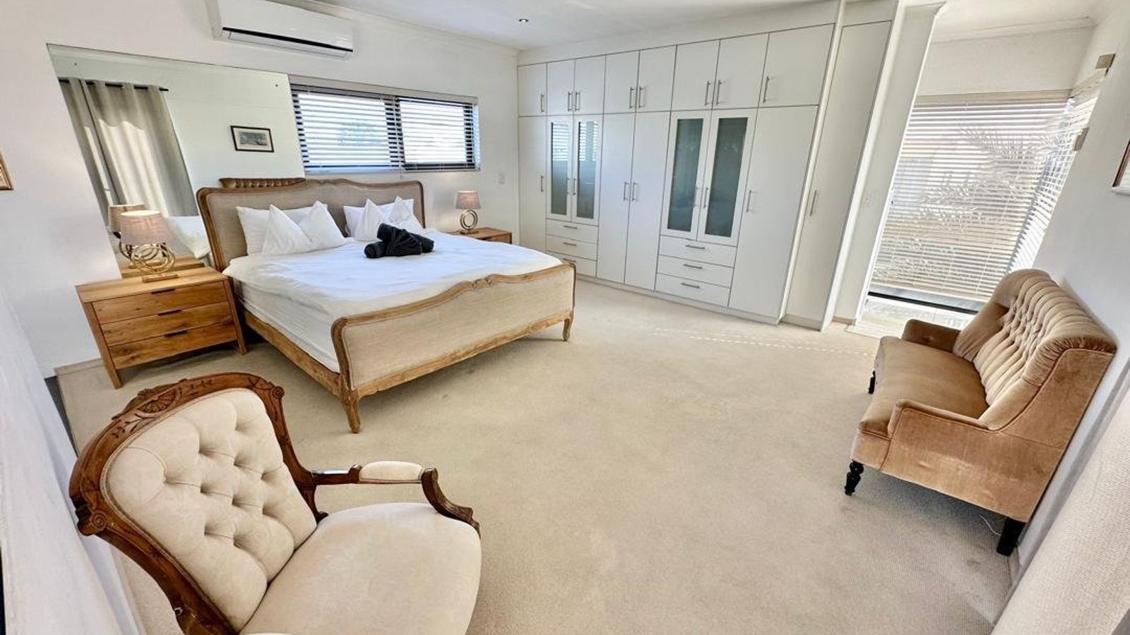Upstairs, the primary bedroom is privately positioned to capture distant sea views from its own balcony. This serene retreat features a luxurious open-plan en-suite bathroom and air conditioning for year-round comfort.