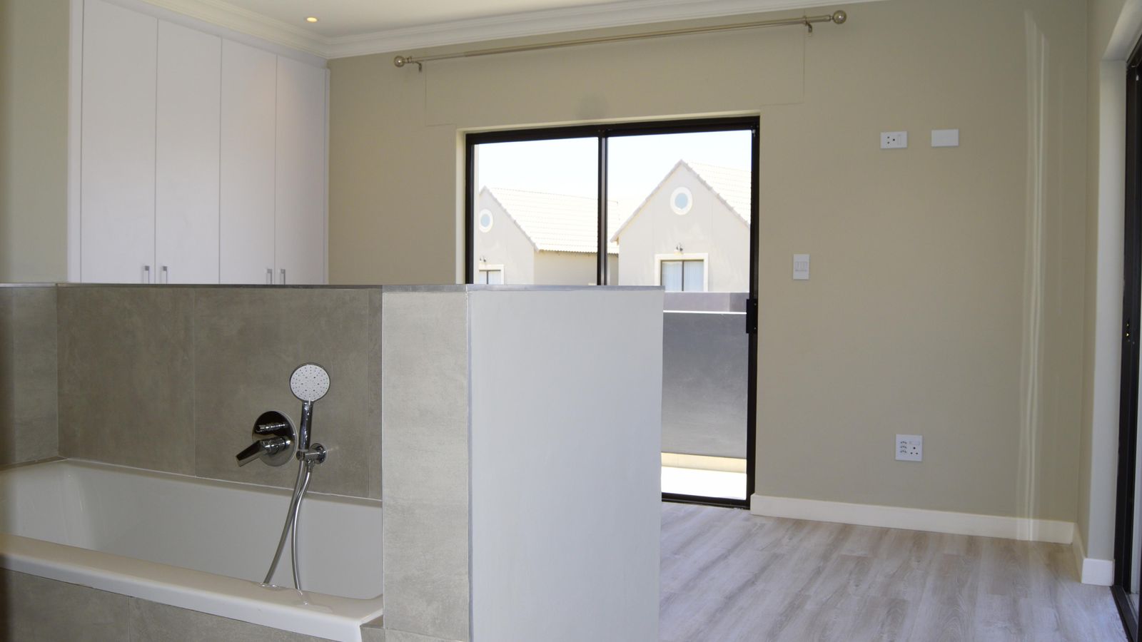 The master bedroom features a wrap-around balcony and a full en-suite bathroom with a bath (partially screened for privacy), enclosed shower and toilet, and a double vanity.