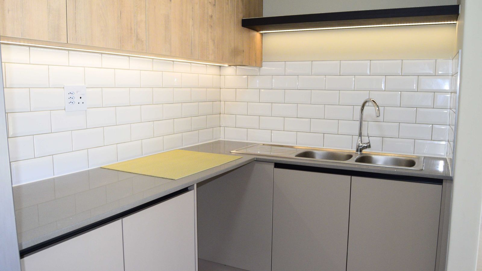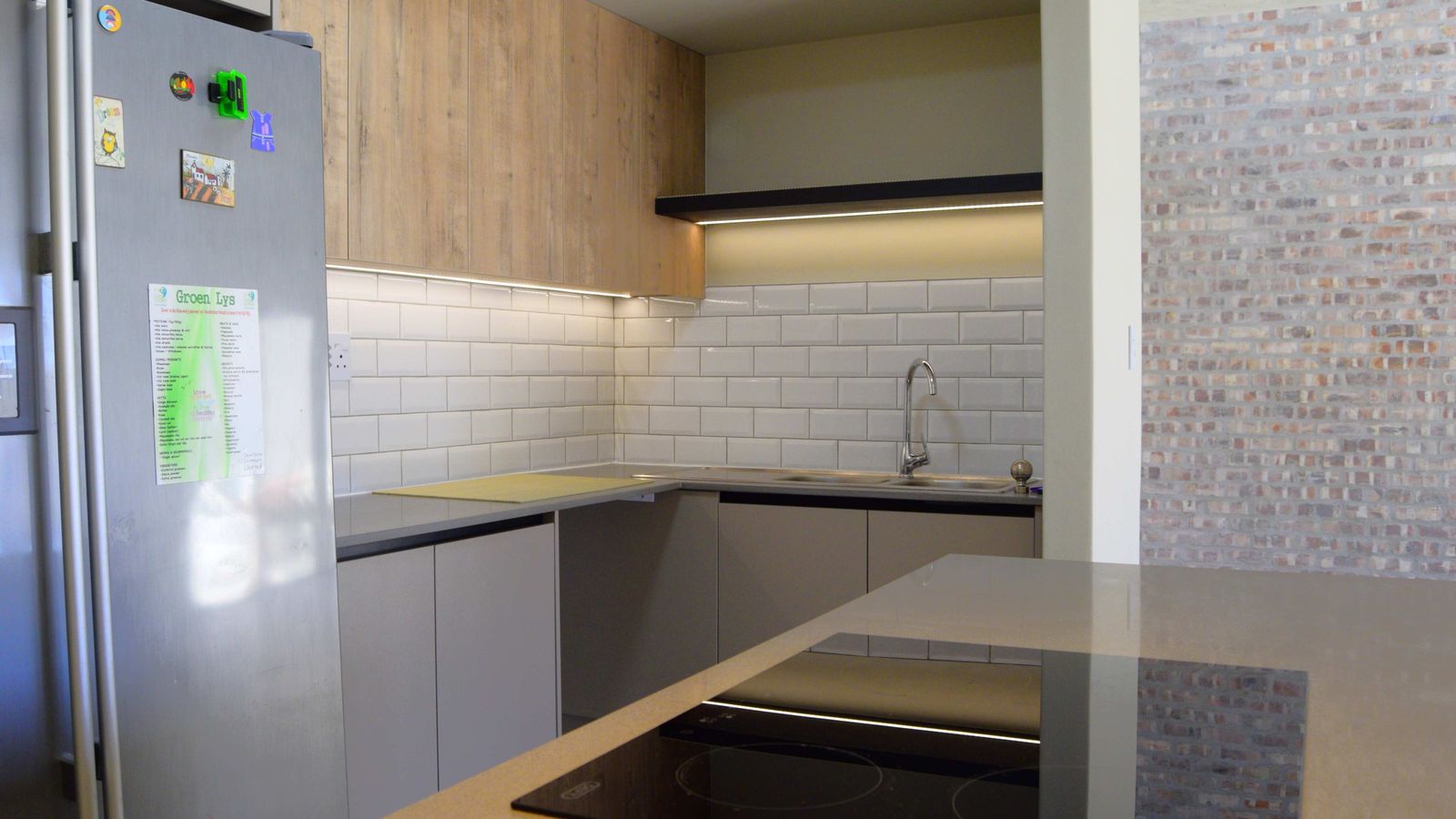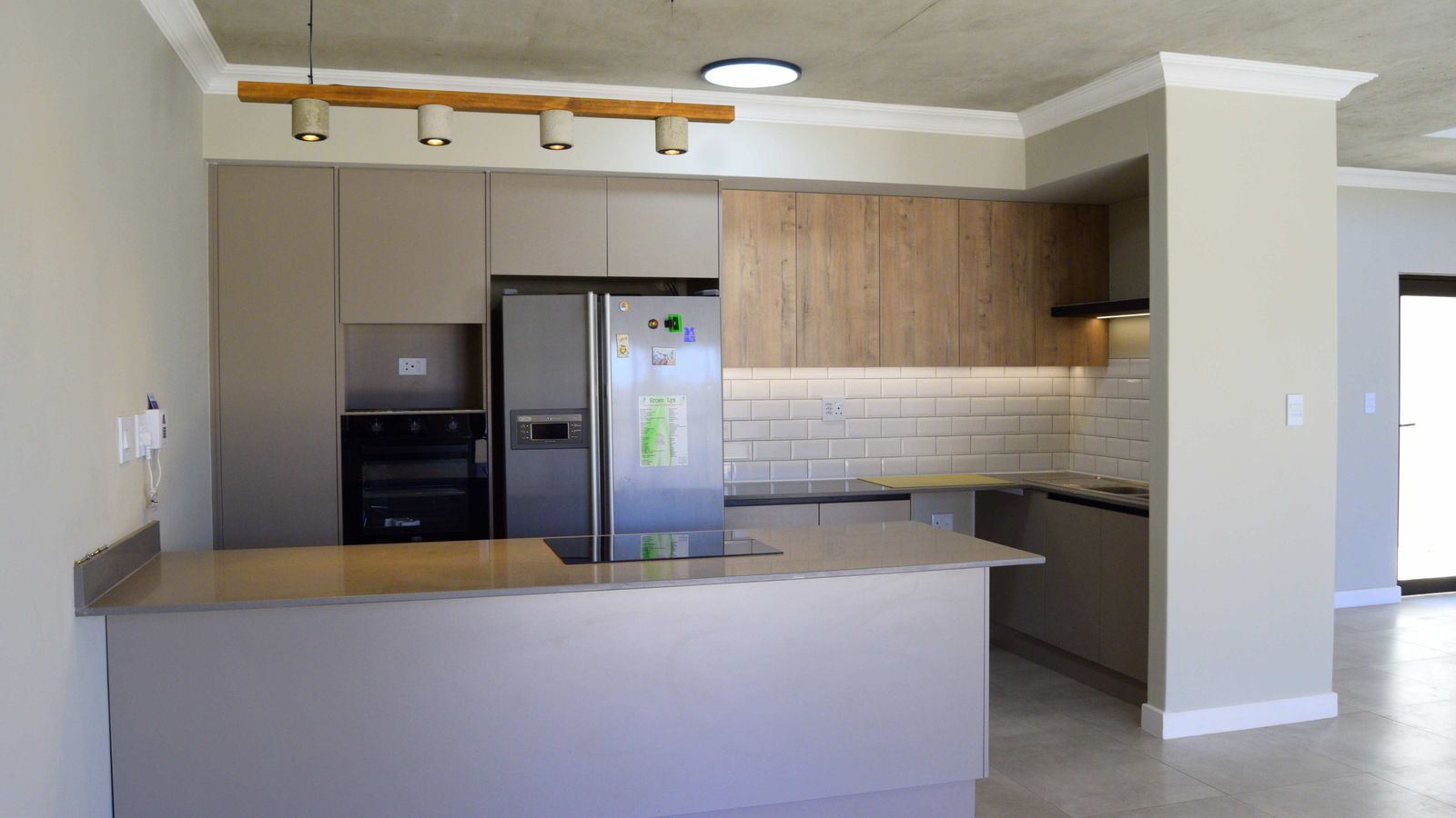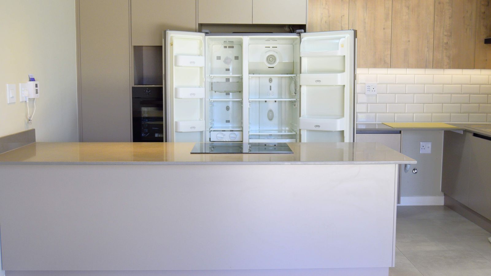 The modern kitchen offers ample cupboard space, a double-door fridge, and all cupboards are neatly fitted with protective rubber lining, adding a thoughtful and practical finishing touch.