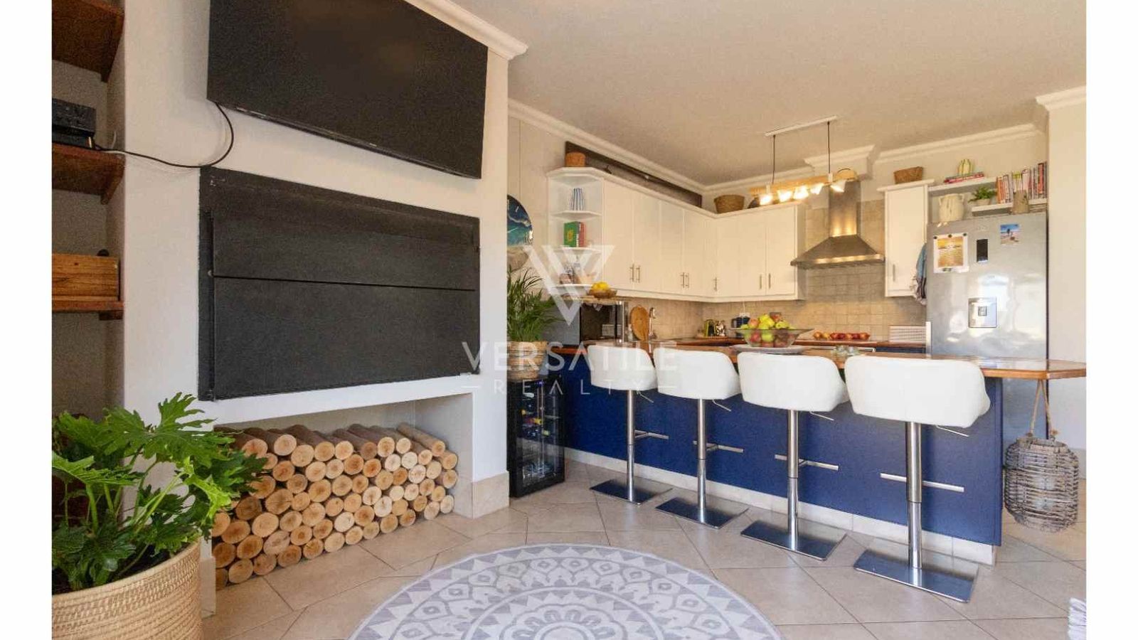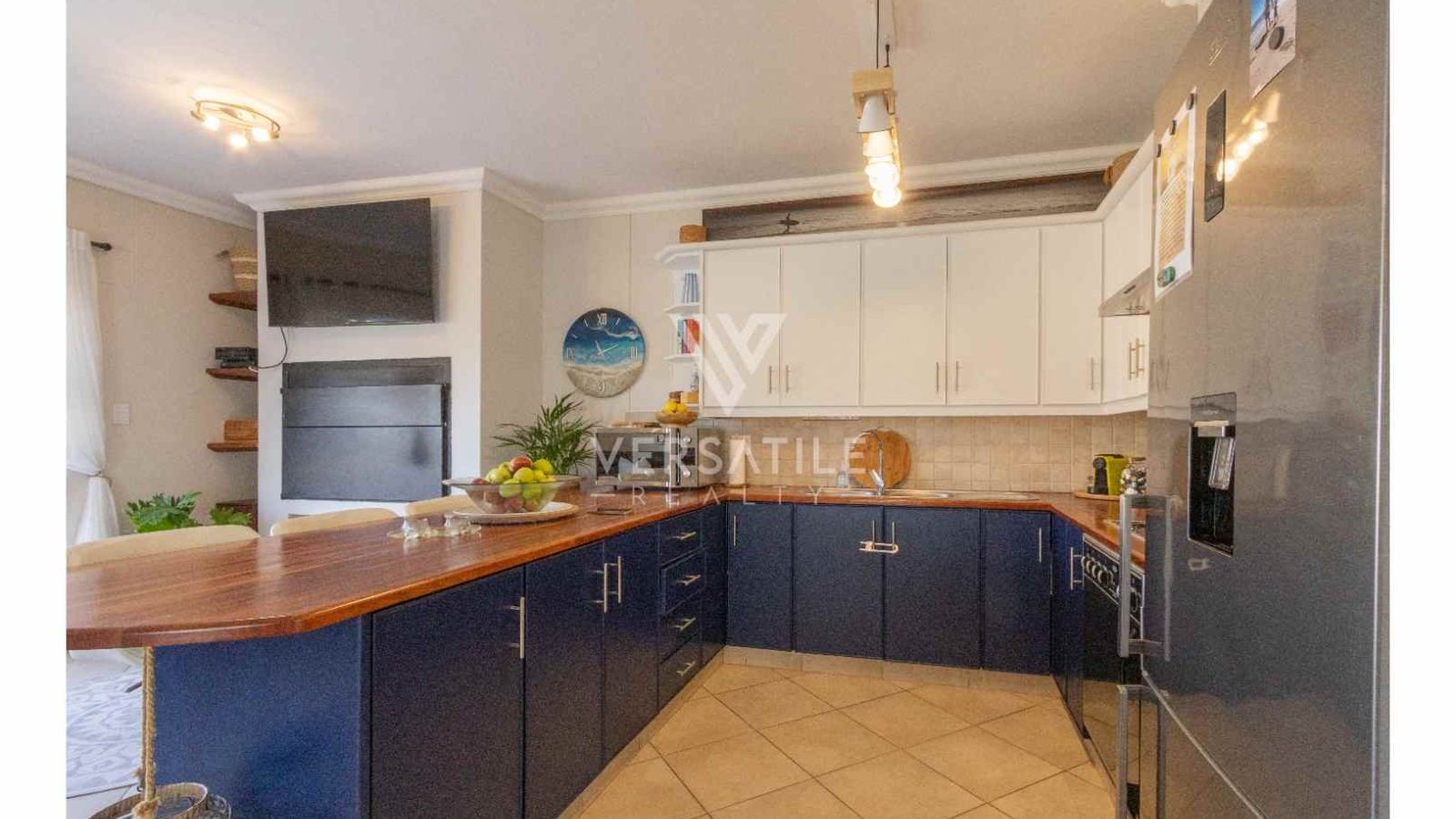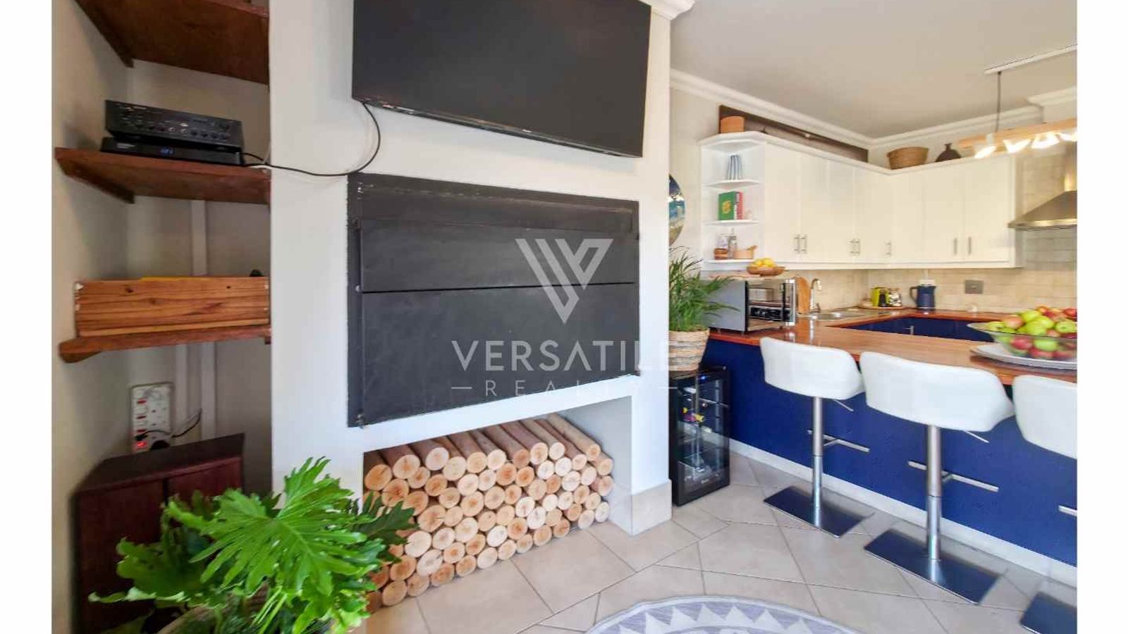 The open plan kitchen, dining, and lounge with indoor braai area opens on to a wooden deck with partial sea views, perfect for entertaining in style. All lower level windows are fitted with Trellidor, burglar proof blinds, and a alarm system ensuring complete peace of mind while at home or away.