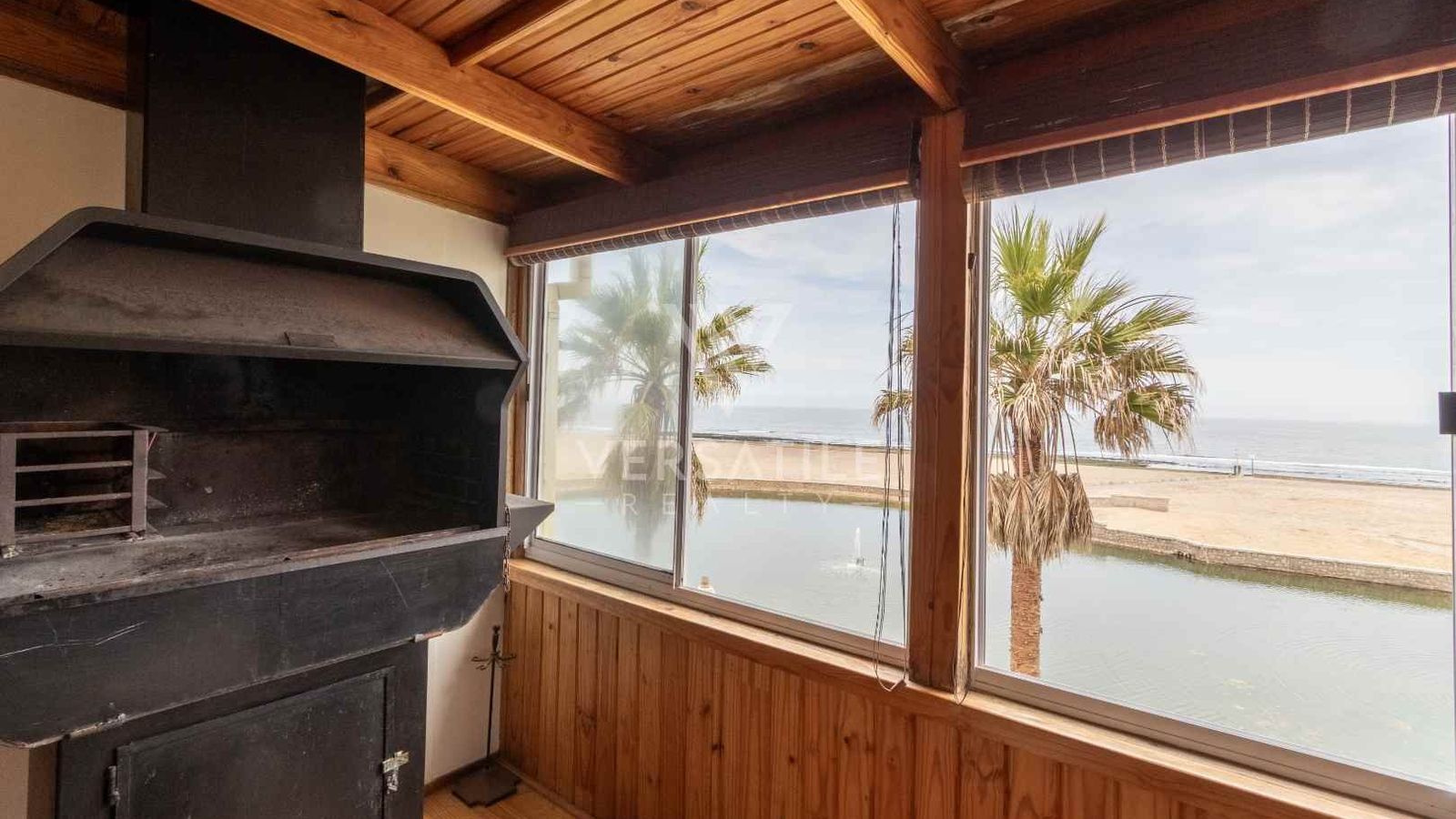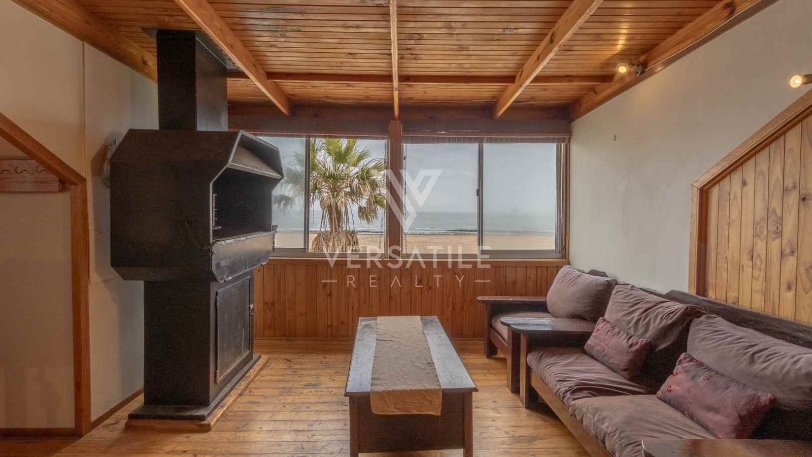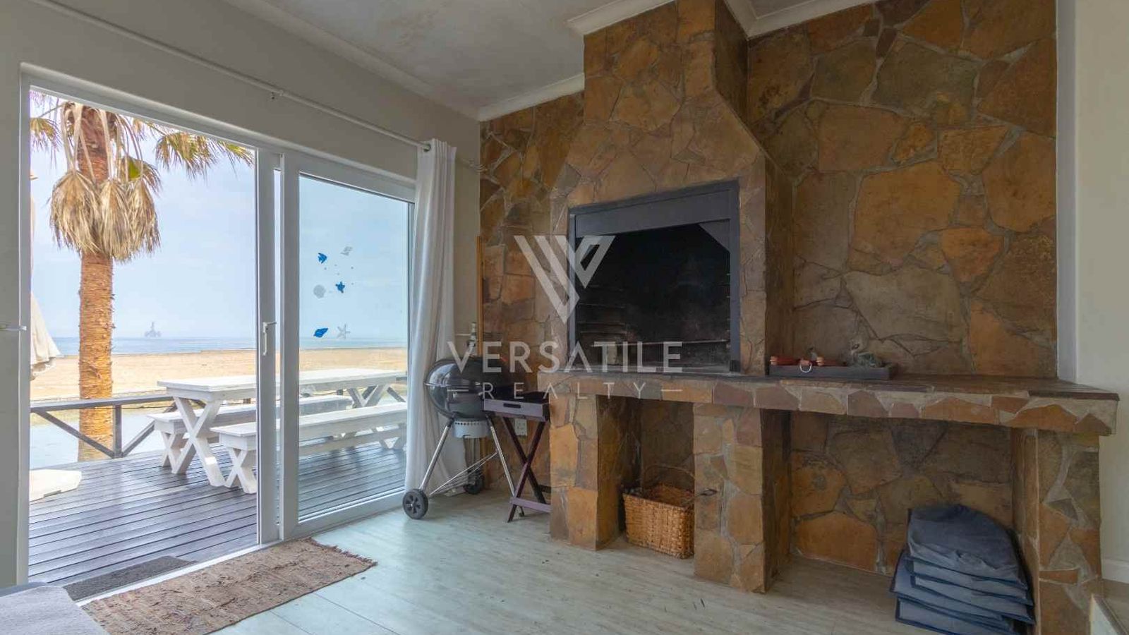Beachfront with permanent sea view | Fully furnished | 3 Bedroom | 3 Bathroom | Open plan kitchen, dinning and lounge area with fire place and BBQ area | Entertainment room with BBQ | Garage with large doors to store a boat | Exterior Deck