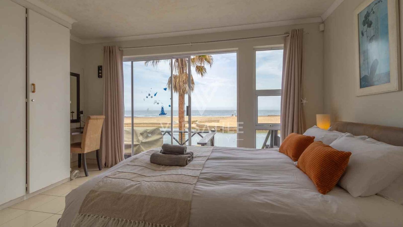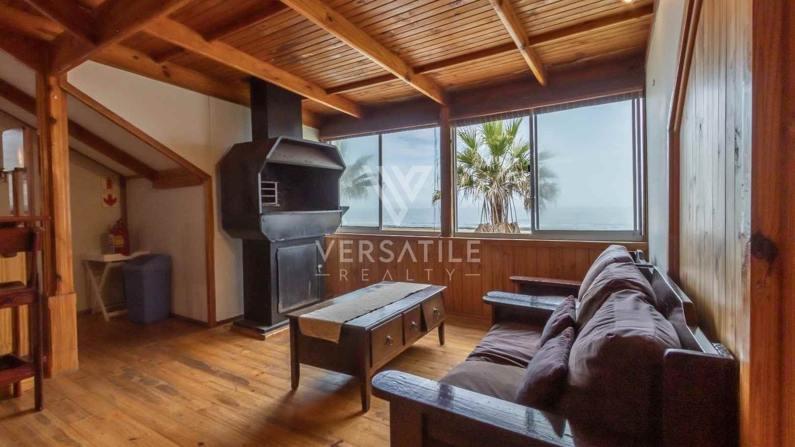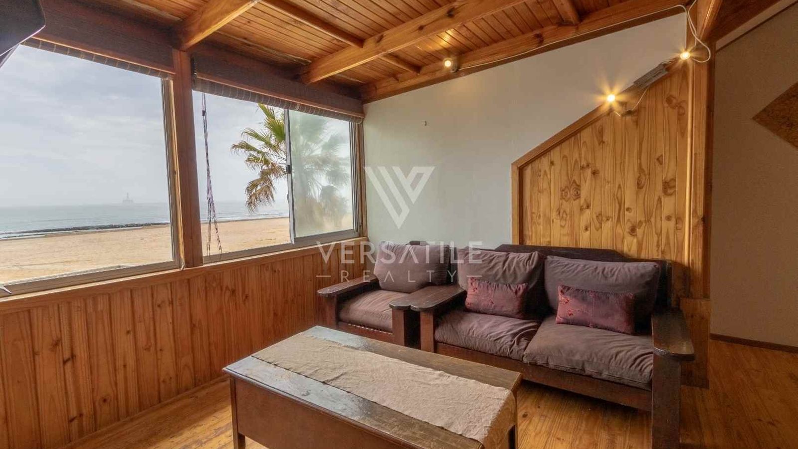 Beachfront with permanent sea view | Fully furnished | 3 Bedroom | 3 Bathroom | Open plan kitchen, dinning and lounge area with fire place and BBQ area | Entertainment room with BBQ | Garage with large doors to store a boat | Exterior Deck