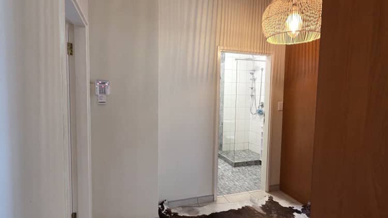 This home flows beautifully from the open-plan kitchen and dining area into a welcoming lounge with an indoor fireplace, perfect for Swakopmund evenings.