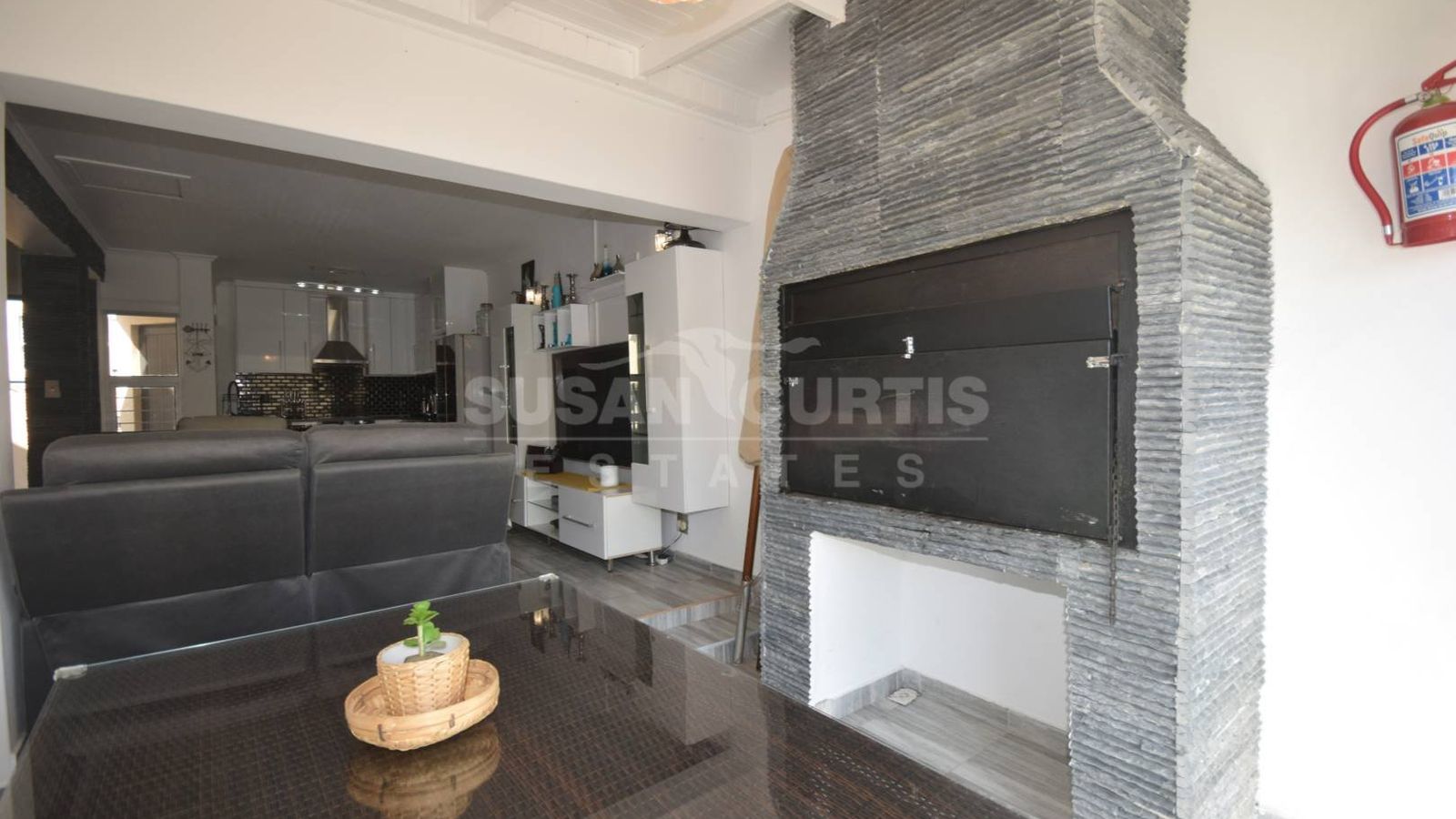 Open plan modern kitchen, living and BBQ area with sliding doors leading out onto a outdoor deck area.