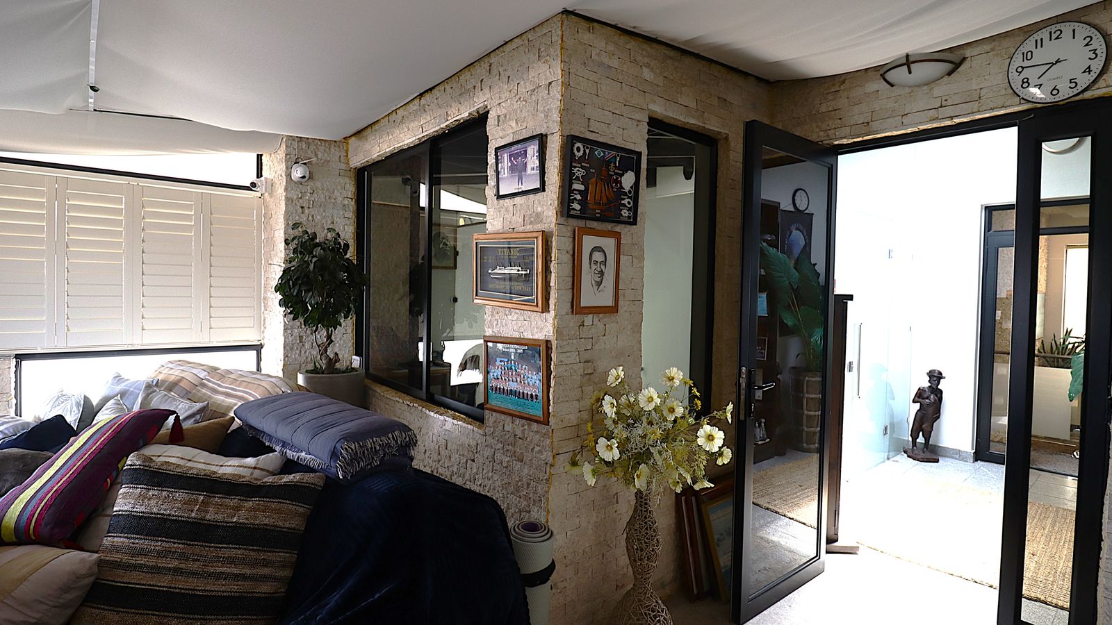 - Security features including security lights, beams, CCTV cameras, an alarm system, and an intercom.