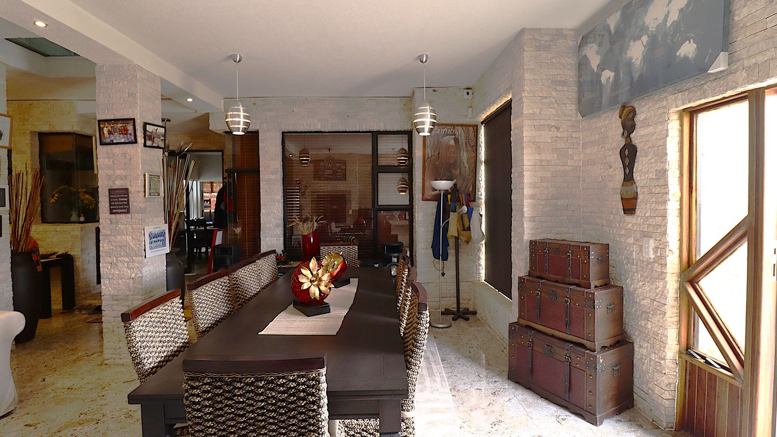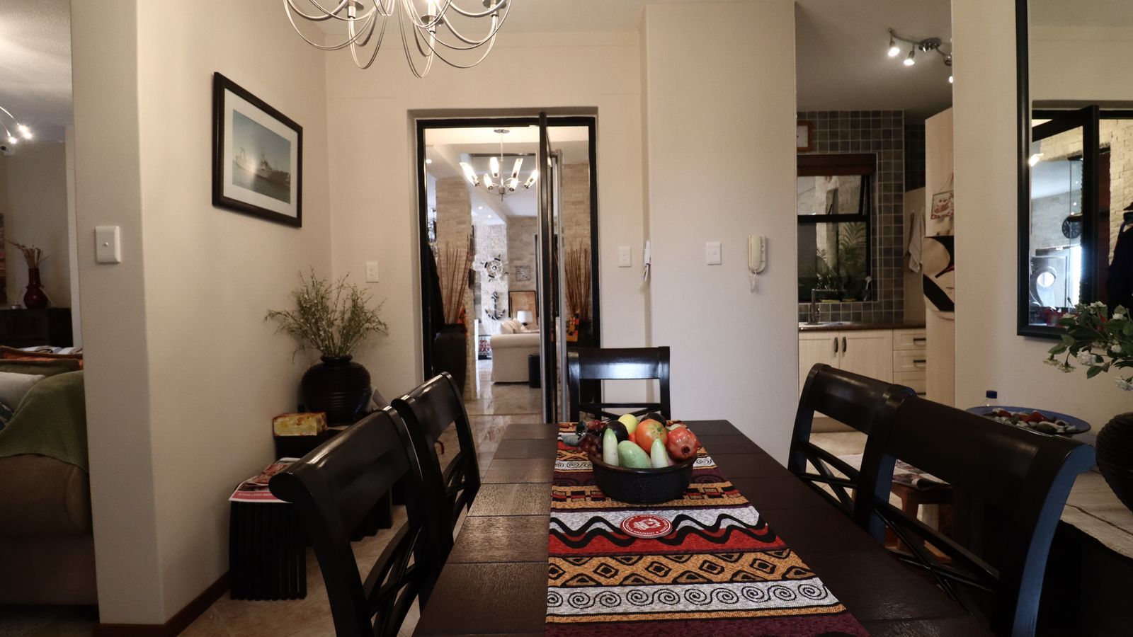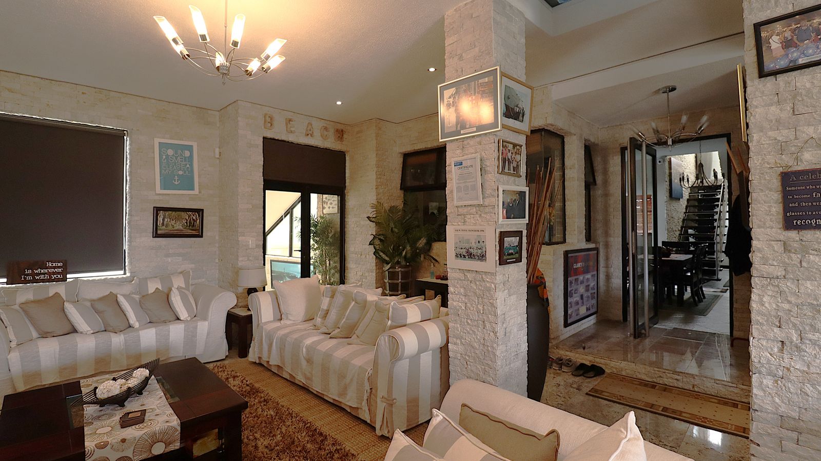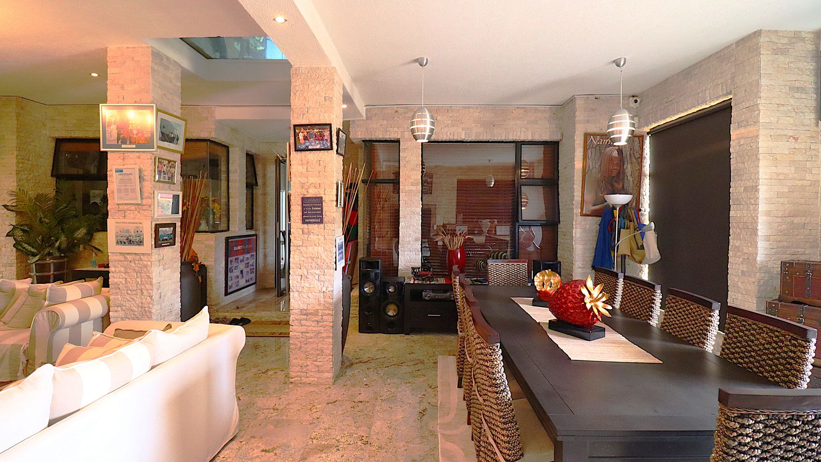 The main entrance walks into a spacious guest lounge and dining area on the ground level with an indoor BBQ. The second lounge and dining space offers more privacy and forms part of the small cozy kitchen area.