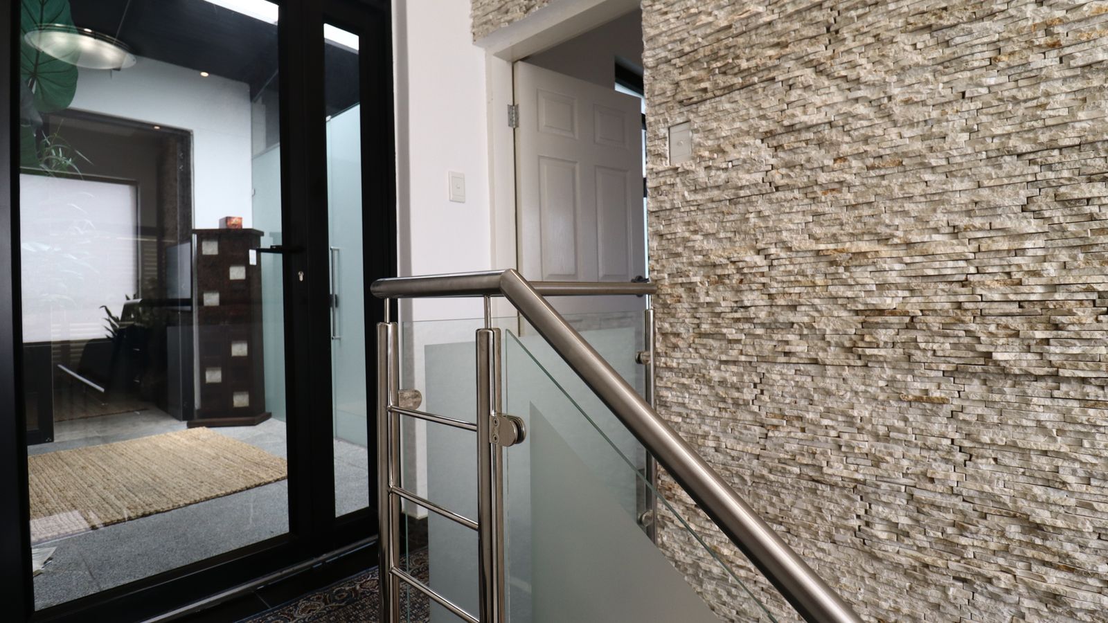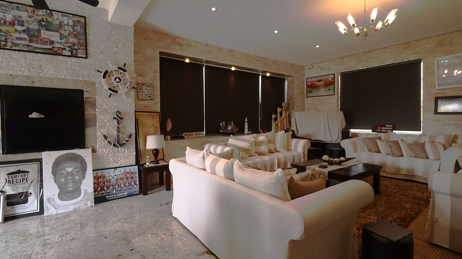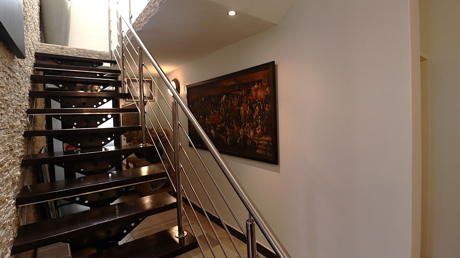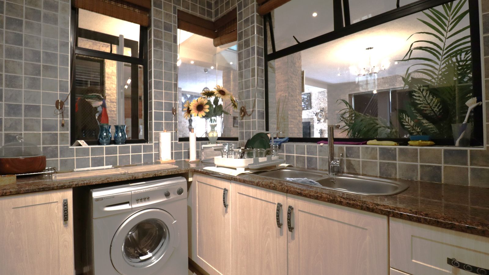 The main entrance walks into a spacious guest lounge and dining area on the ground level with an indoor BBQ. The second lounge and dining space offers more privacy and forms part of the small cozy kitchen area.