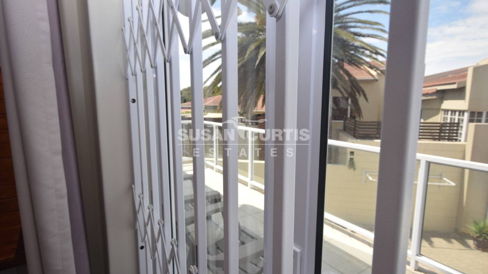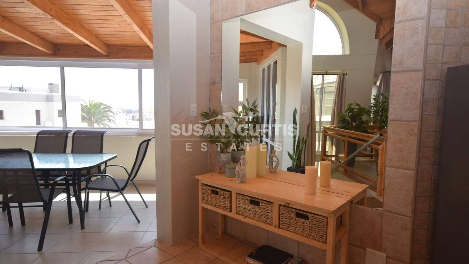 # Large balcony adjacent to the living area.