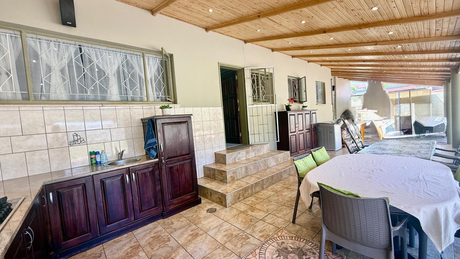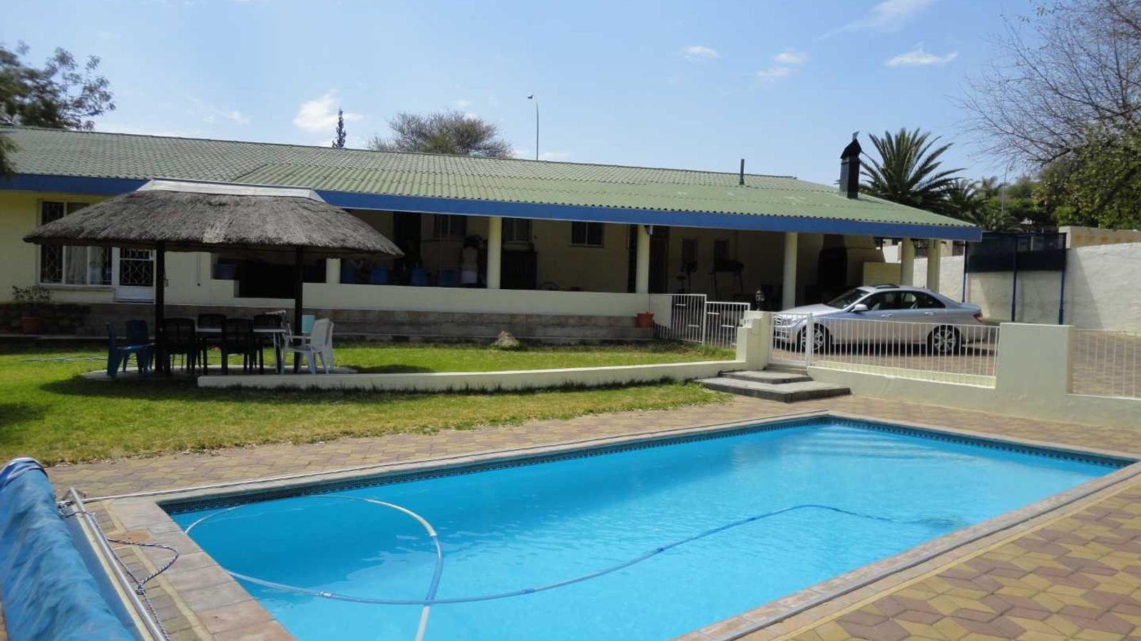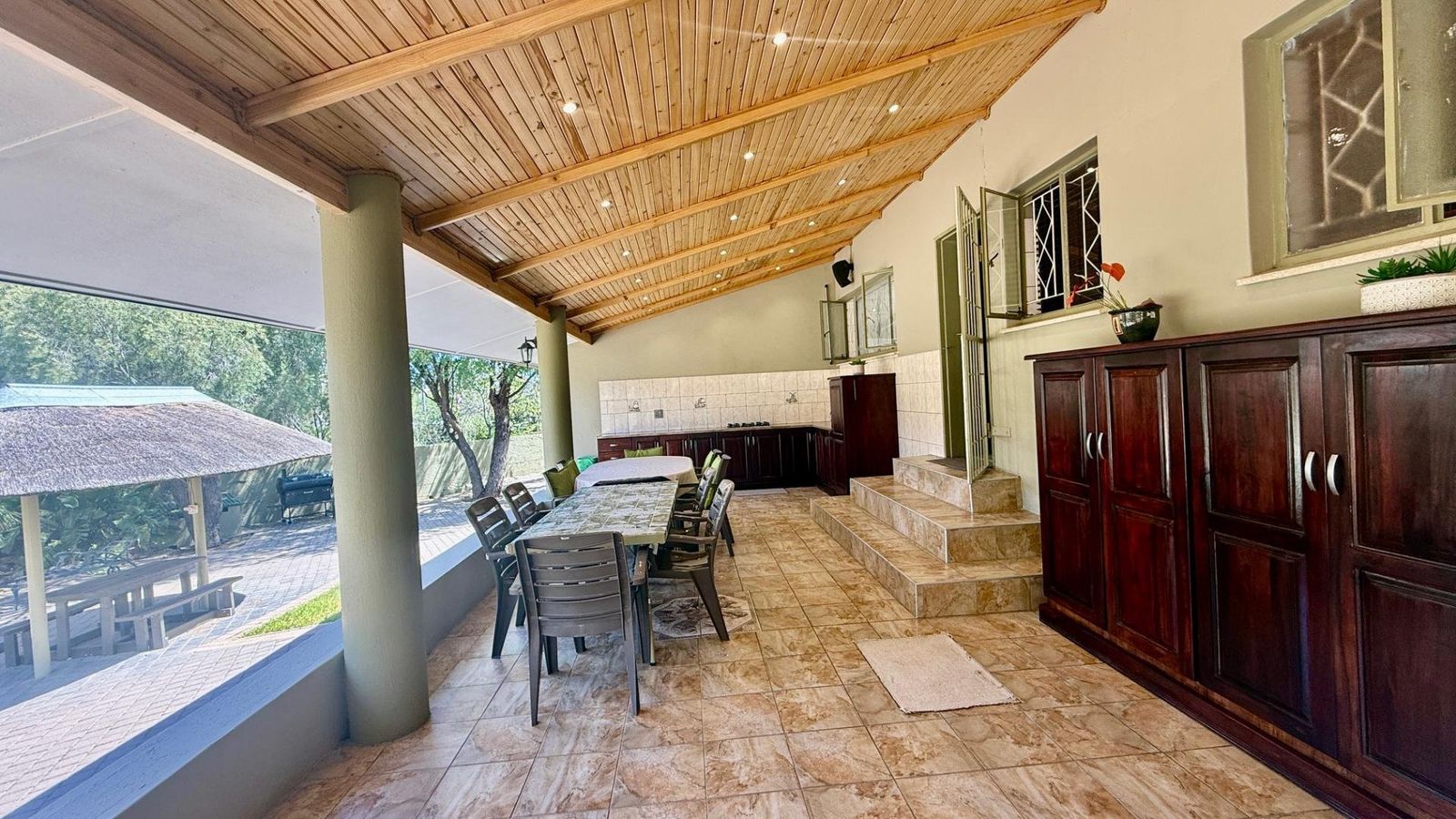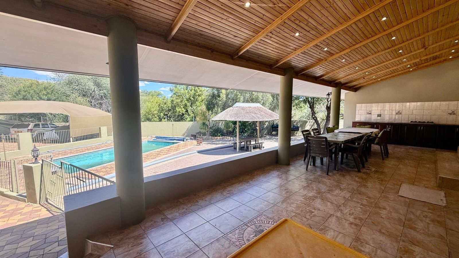 CLOSE TO AL AMENITIES! This spacious well maintained family home of approx. 400m2 underroof, includes a big 89 m2 underroof entertainment area with an outside kitchen and BBQ area, ideally to spend long hours with family and friends, overlooking a big pool, small thatch and the low maintenance garden.