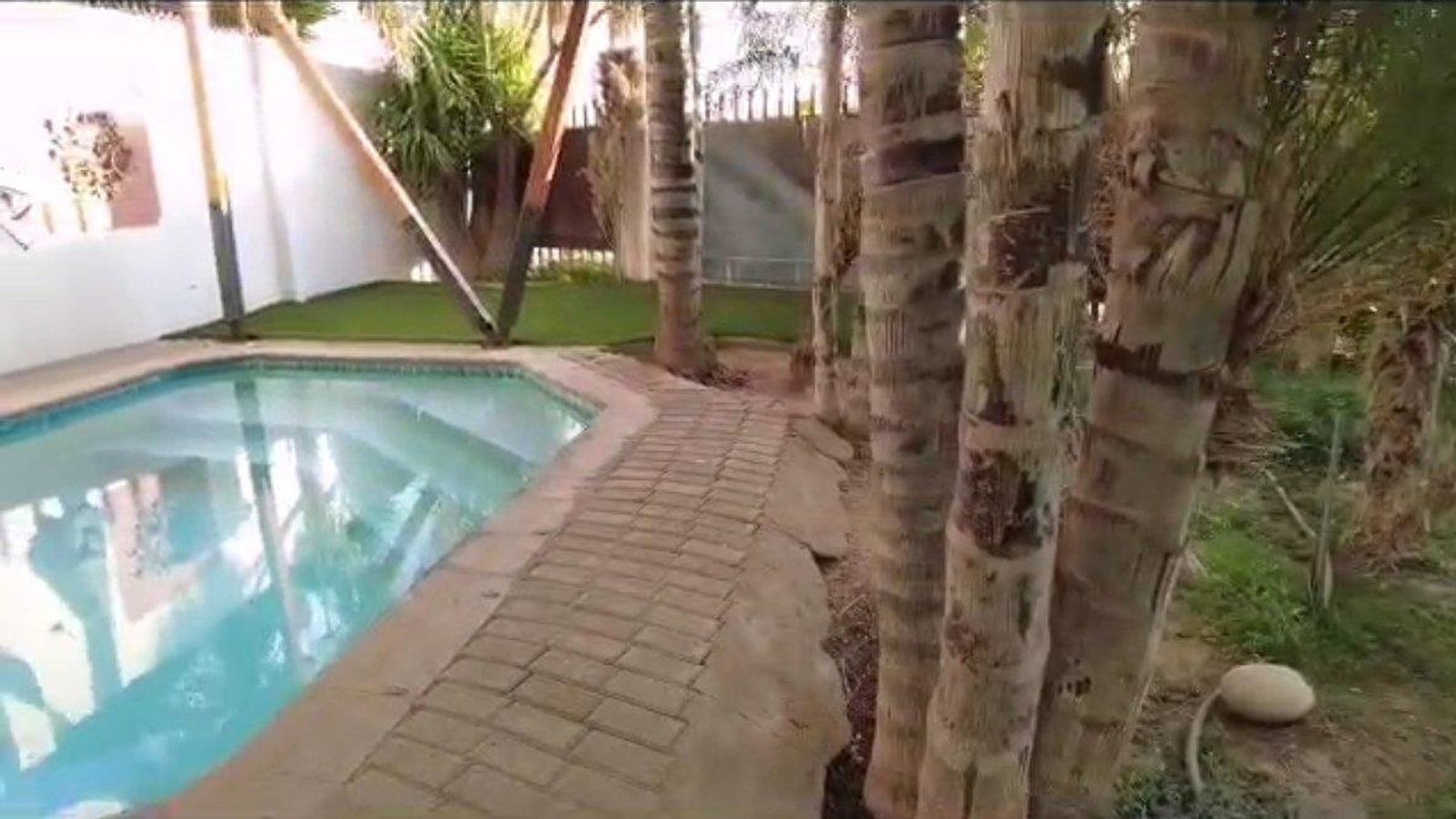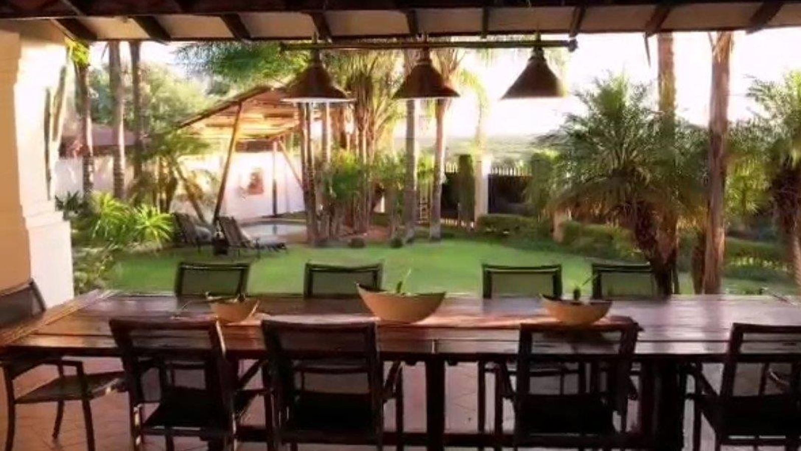 Stunning property: Serene and established lush garden with tall palm trees, shrub hedge, and vibrant lawn, ideal for relaxation and tranquility.