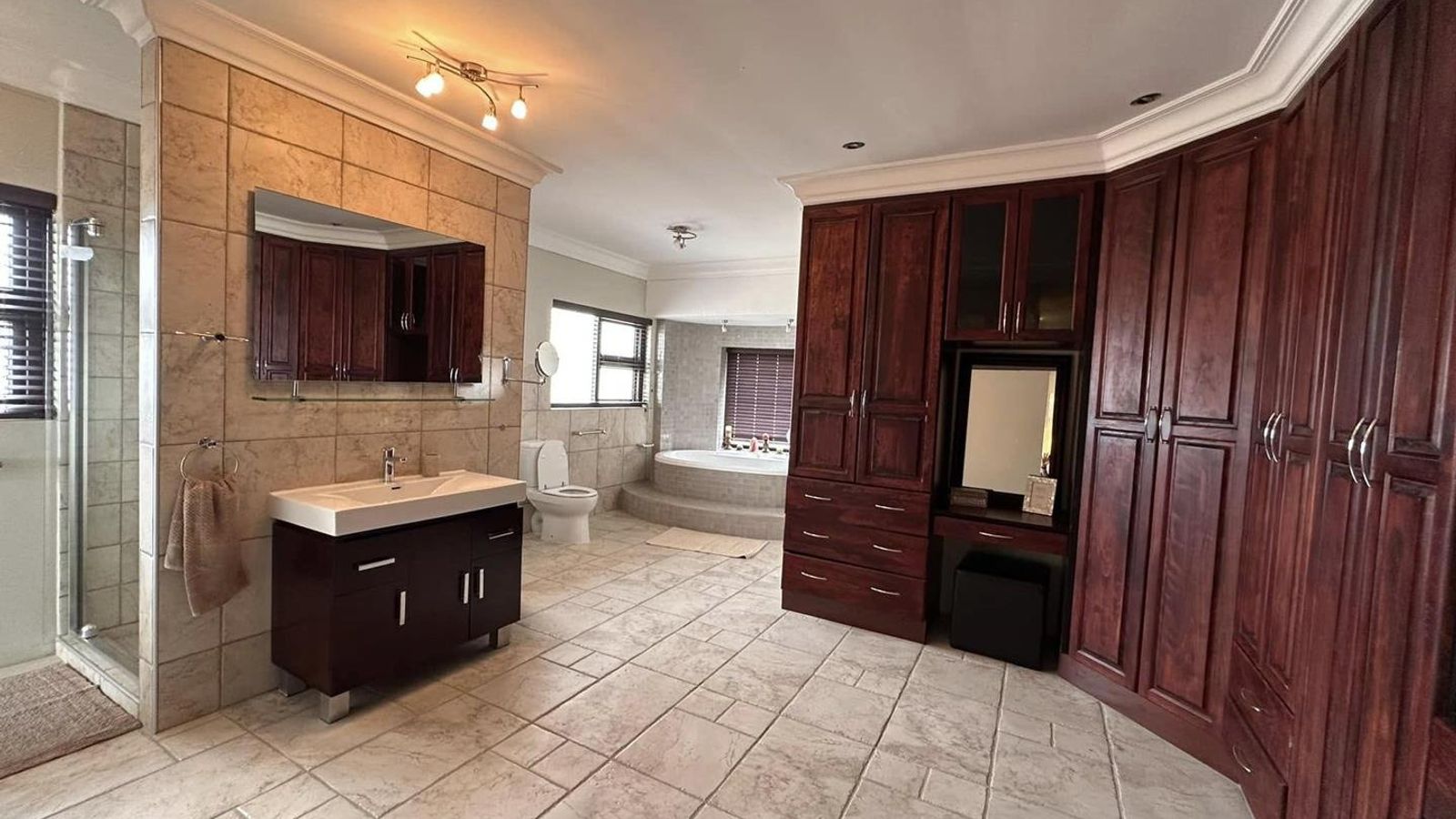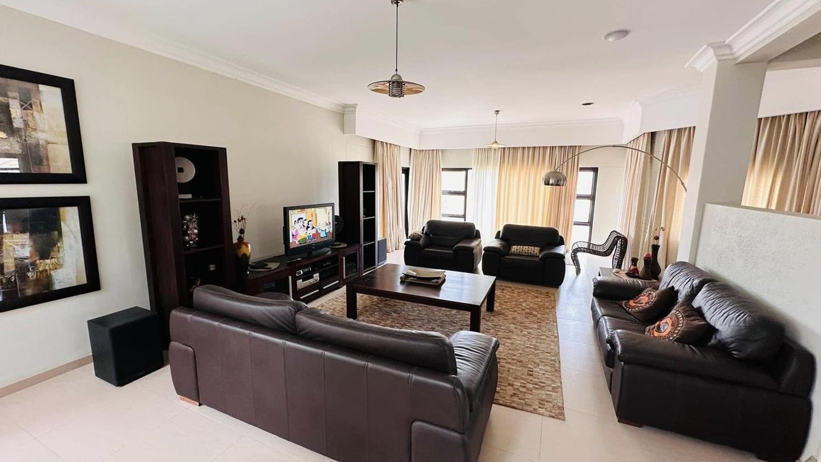 On the lower level, you will discover three distinct living areas designed for a formal lounge, a TV room, and a cigar lounge. Additionally, there is a dining room, kitchen, scullery, and laundry facilities. This level also features four bedrooms and three bathrooms.