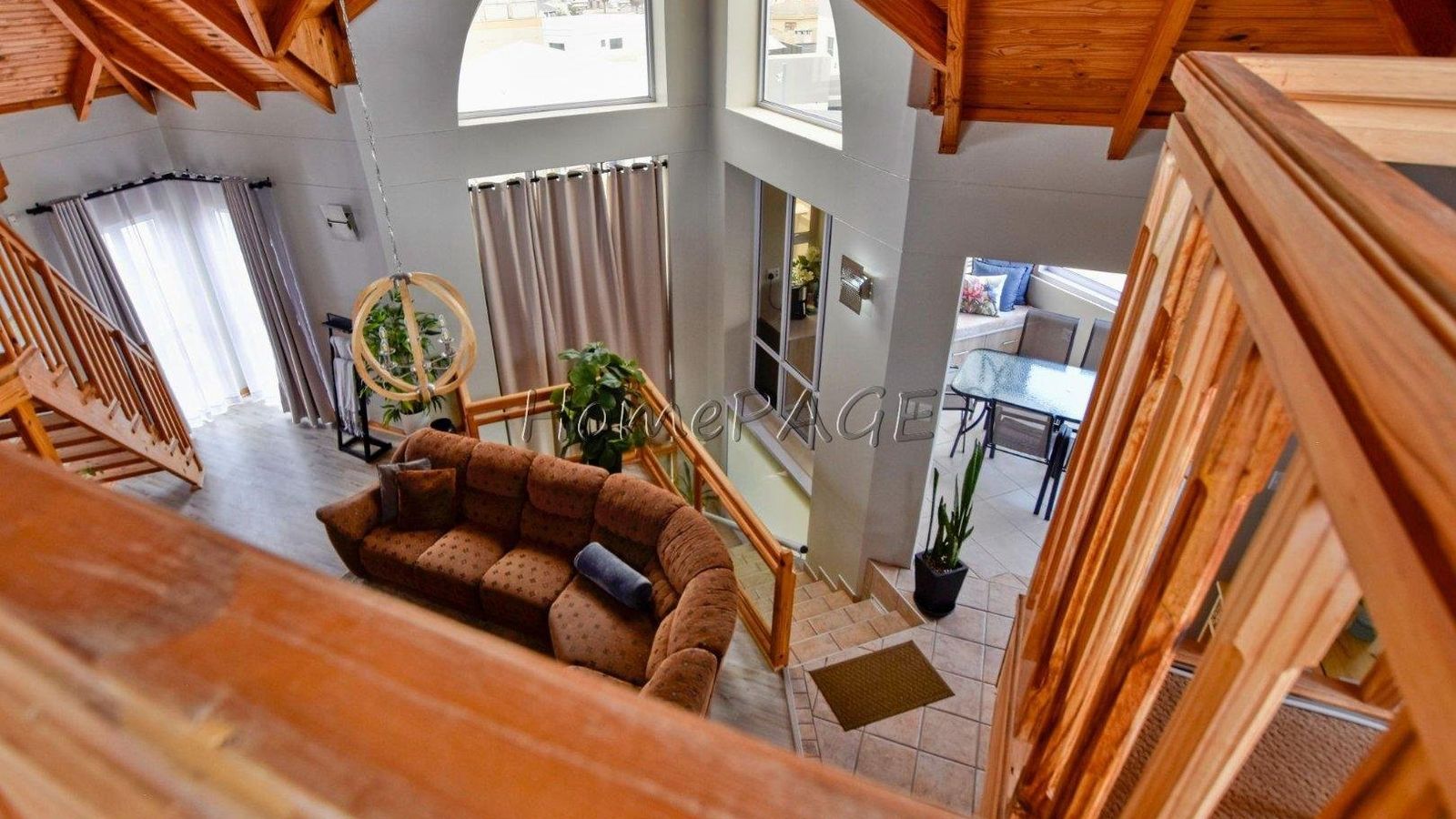* This living area has double volume space, with lots of light due to lots of windows, and with beautiful wood trusses