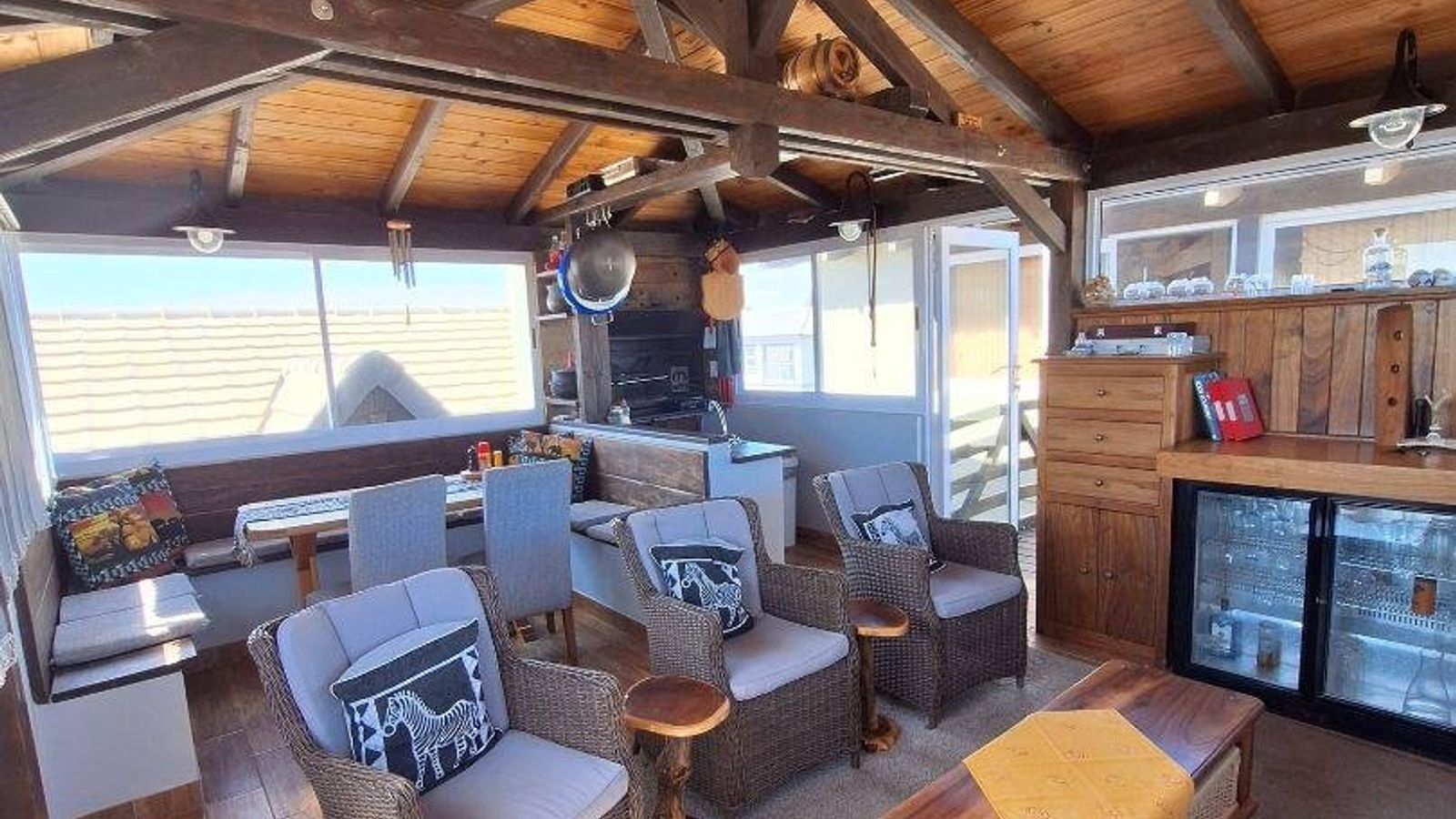 Top floor offers you a braai room with stunning views . The perfect place to just relax and enjoy with family and friends . Cross a wooden bridge to a 2nd study/hobby room/gym , for you to choose !