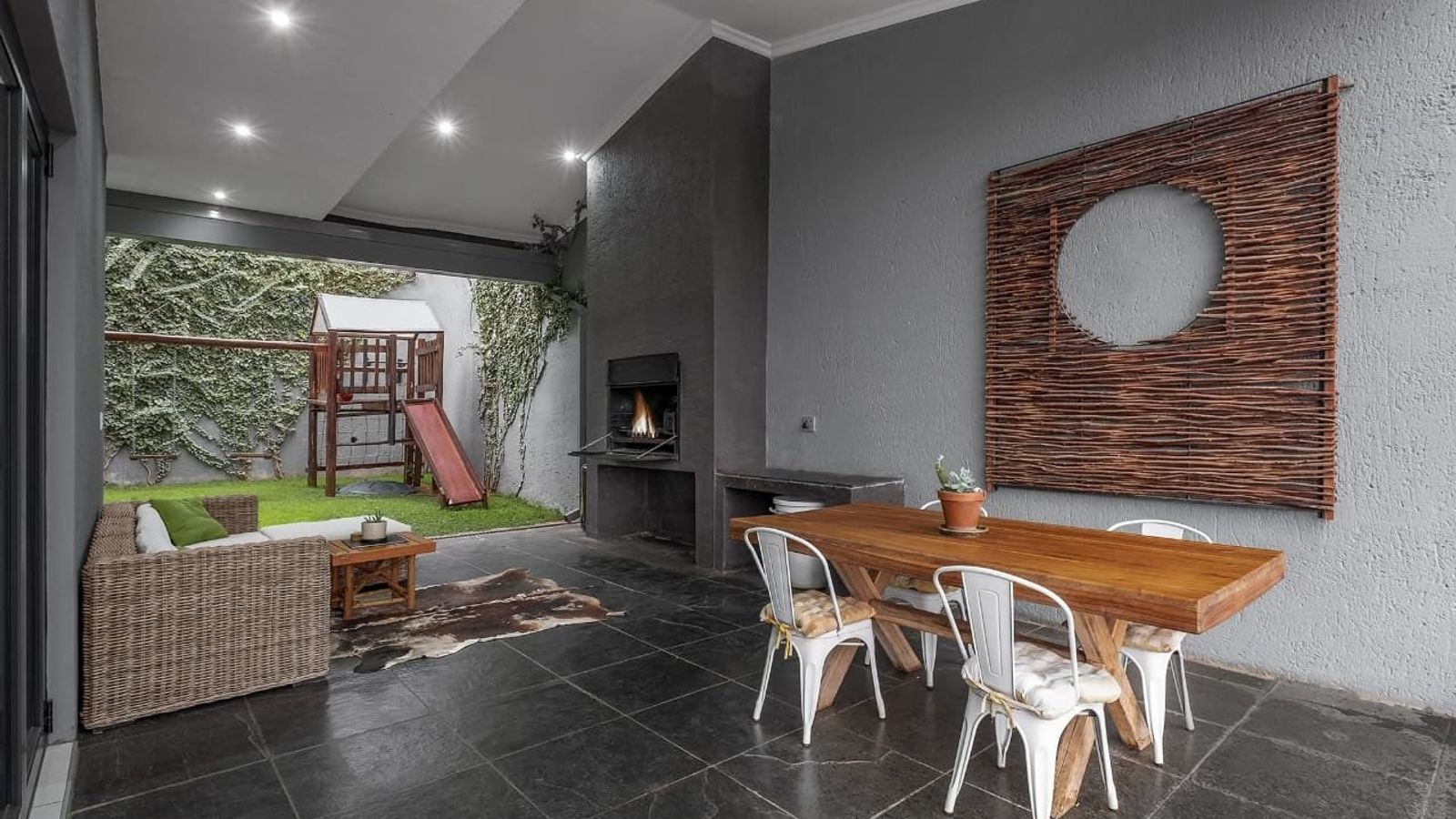 Entertainer's Dream: A seamless transition from the open-plan lounge to the covered veranda, featuring a built-in BBQ, swimming pool, and a dedicated jungle gym for the kids.