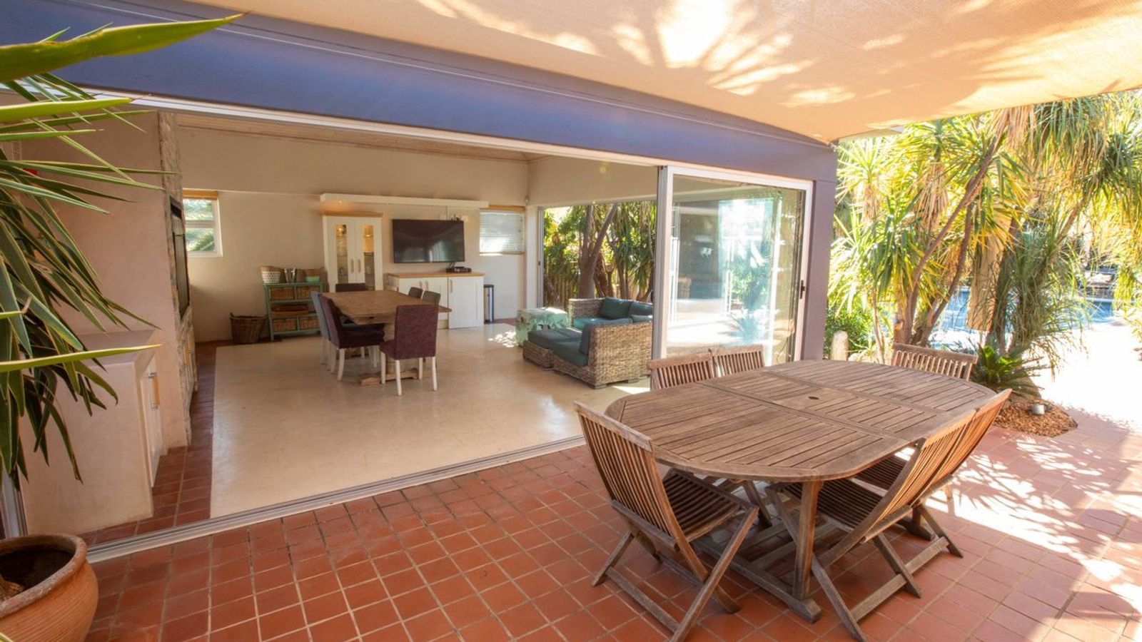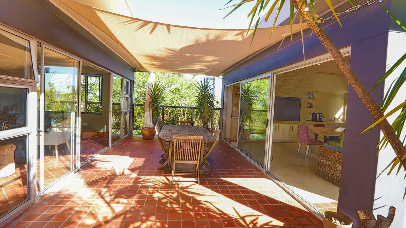 - A lush, tree-filled garden complemented by a sparkling pool for outdoor enjoyment