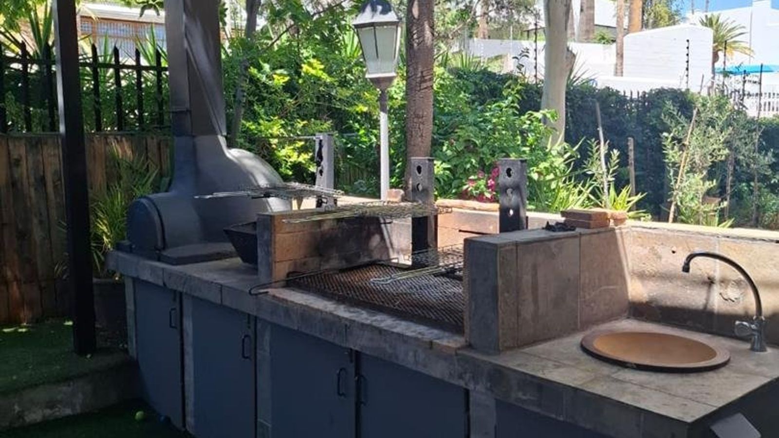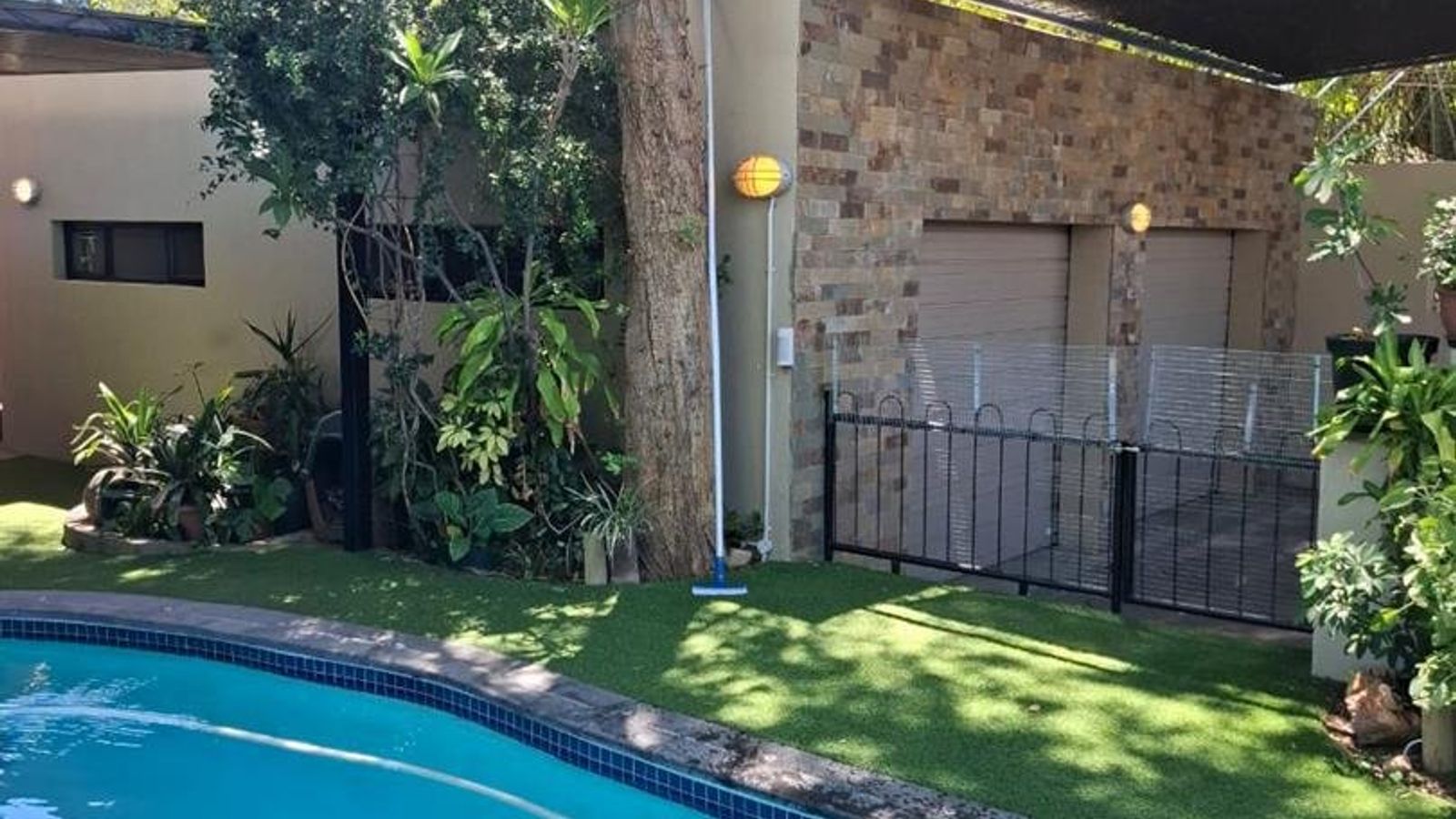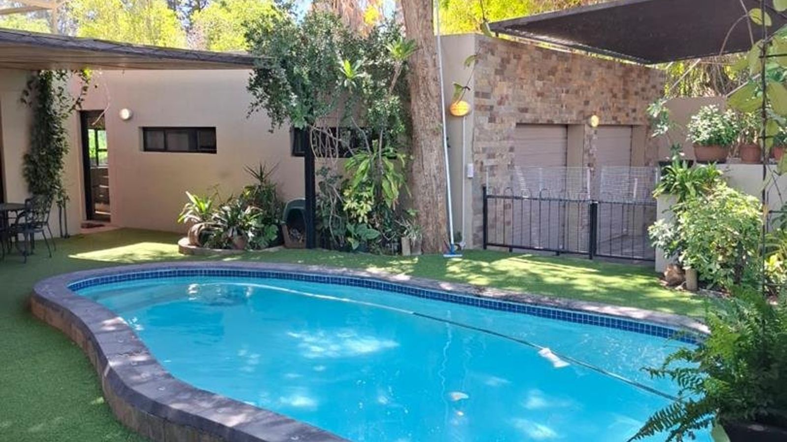 The property is further enhanced by practical features such as garages totaling 80 sqm, storerooms, a laundry room, and a sparkling swimming pool. Security is paramount with electrified boundary walls and an alarm system. Additional comforts include air conditioning and an off-grid solar electricity system with approximately four batteries, ensuring energy efficiency and sustainability.