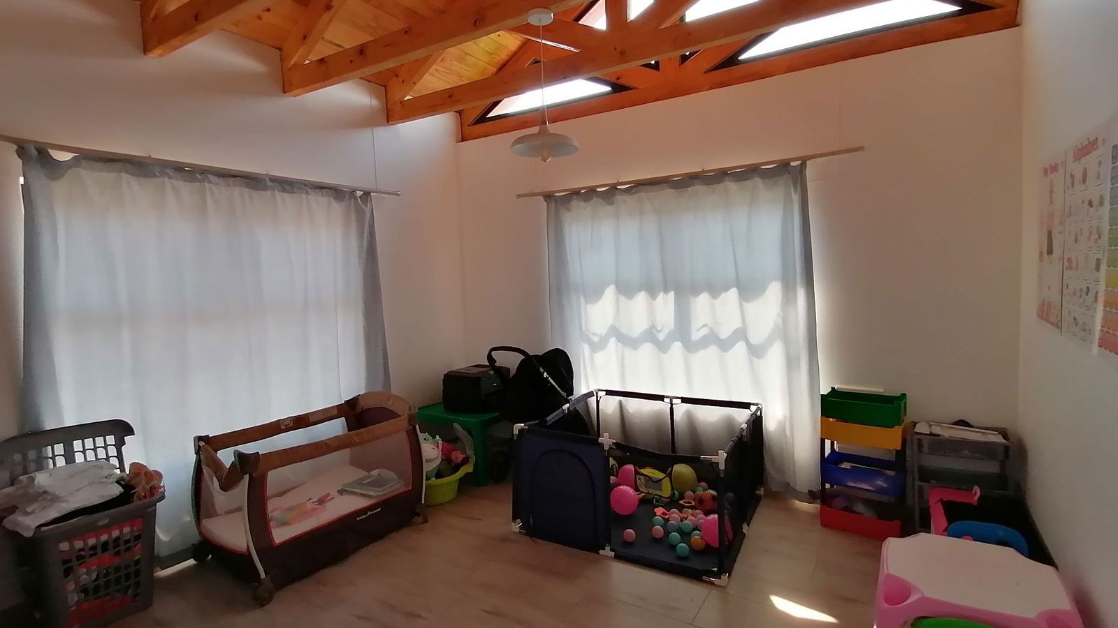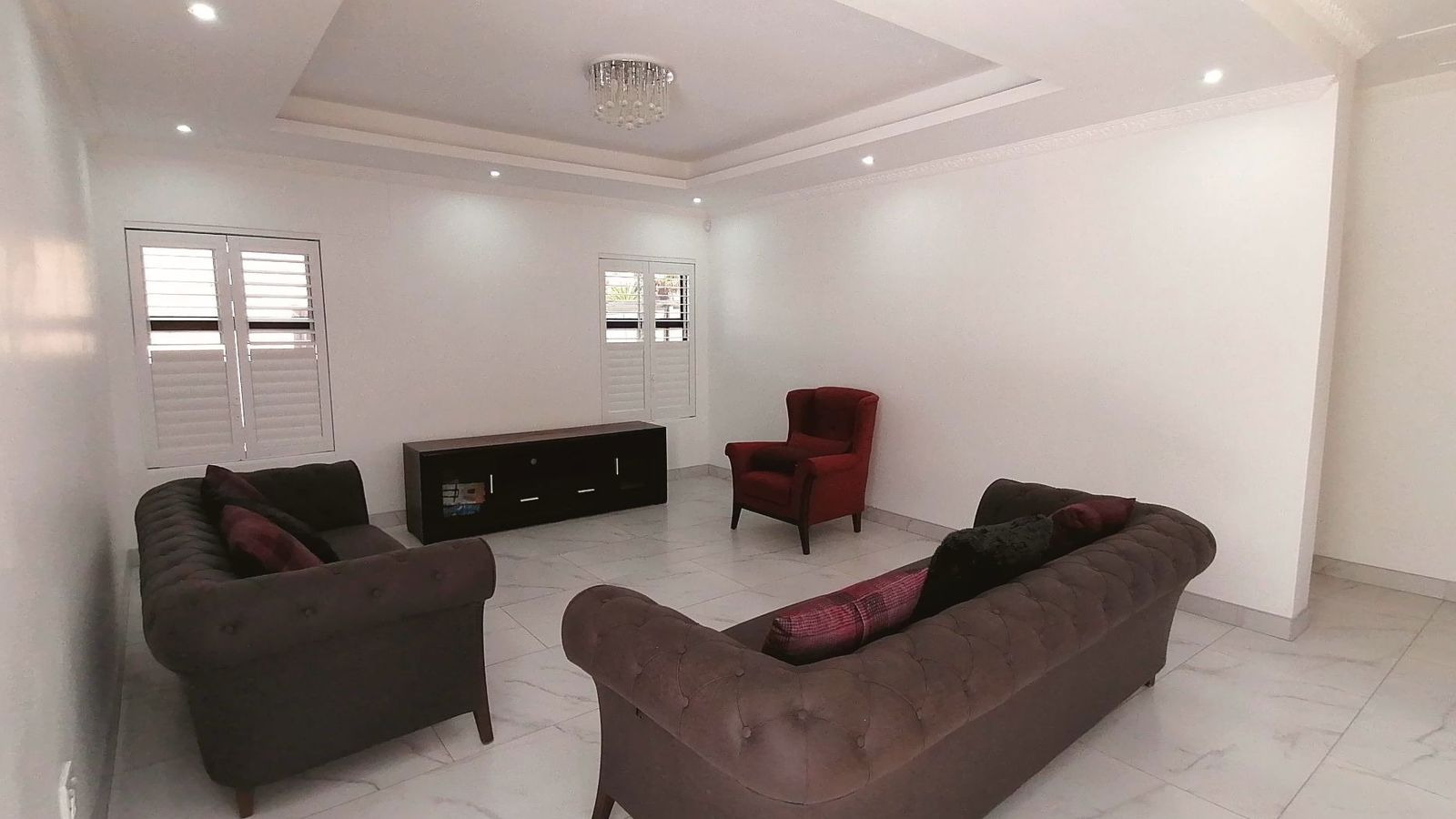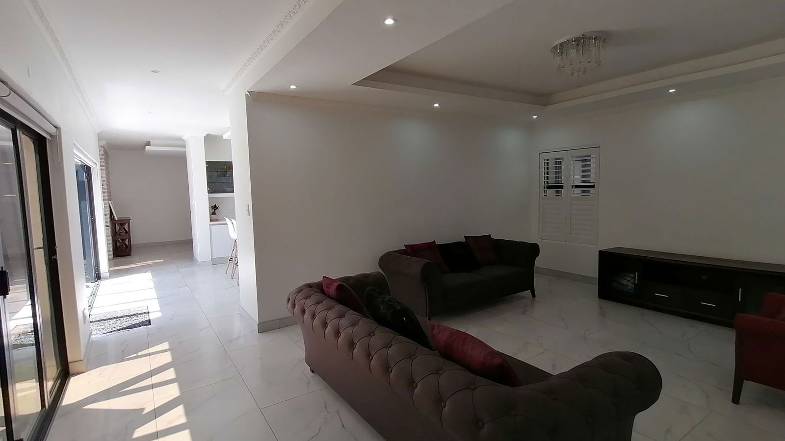 At the heart of the home, the kitchen offers ample storage, a walk-in pantry, and a combined laundry/scullery for ultimate convenience. The main living area is enhanced by a charming crown-moulded ceiling and timeless American shutters, adding warmth and sophistication. Distinct private spaces ensure comfort for the whole family, including a cozy TV room, additional living areas, and a generously sized study featuring a beautifully crafted beamed ceiling.