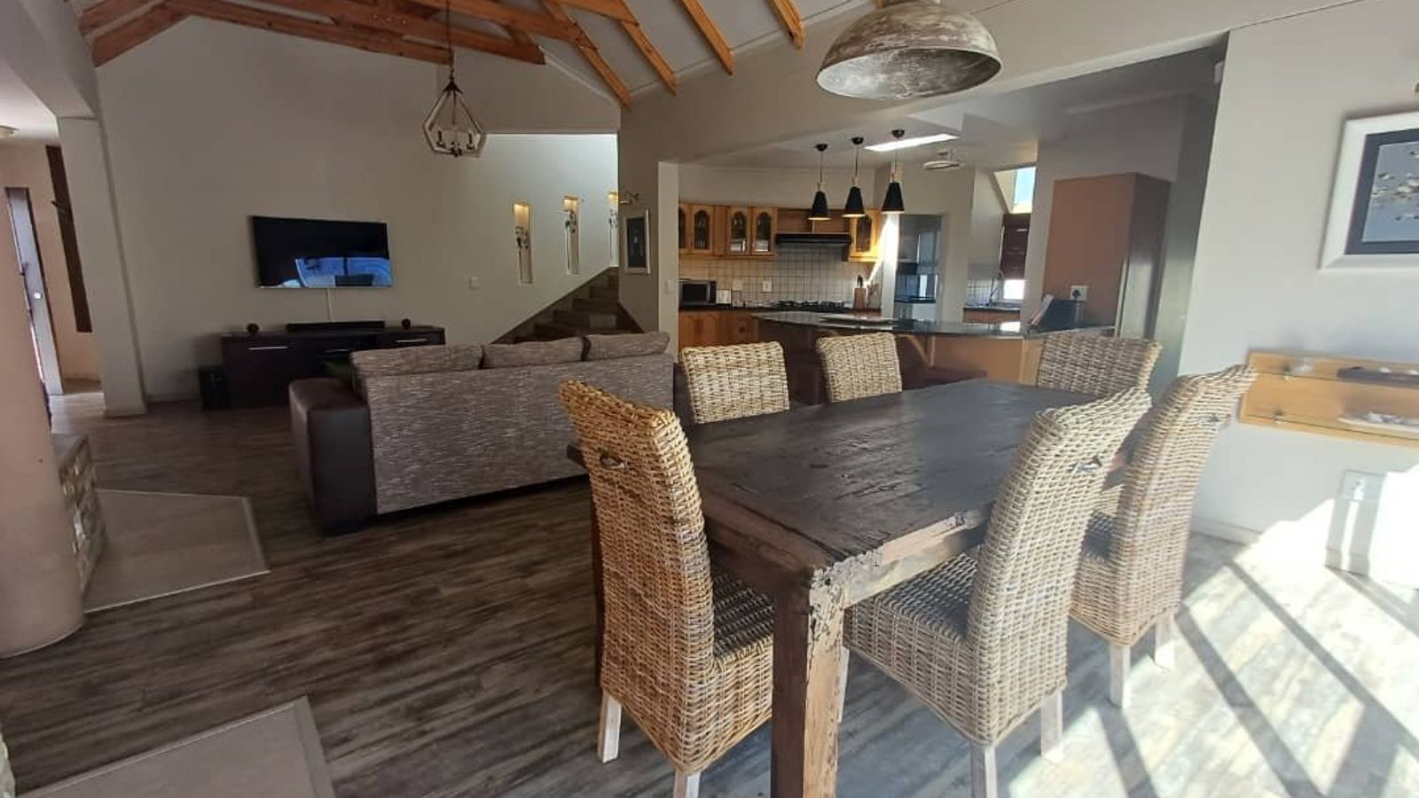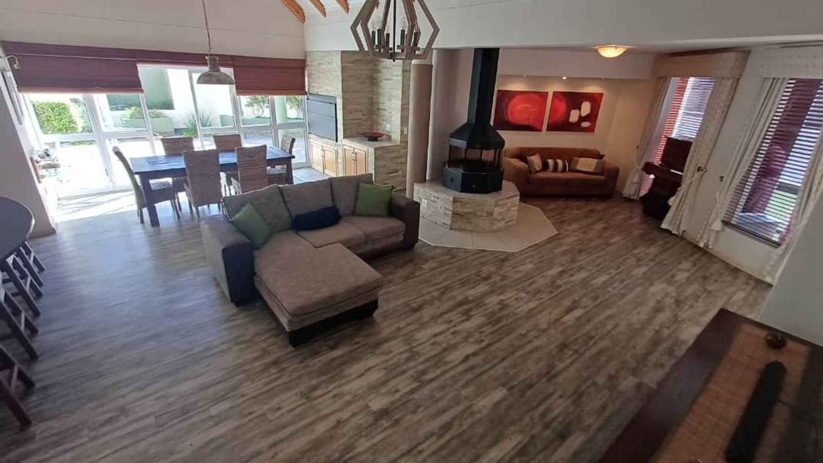 Upmarket immaculate family home offering 5 bedrooms, 4 bathrooms, guest toilet, entrance hall, open plan kitchen with scullery and pantry, lounge with fireplace, dining room with indoor BBQ, sunroom, study, laundry room, neat garden, 2 garages (space for 3 cars), alarm system, camera system.
